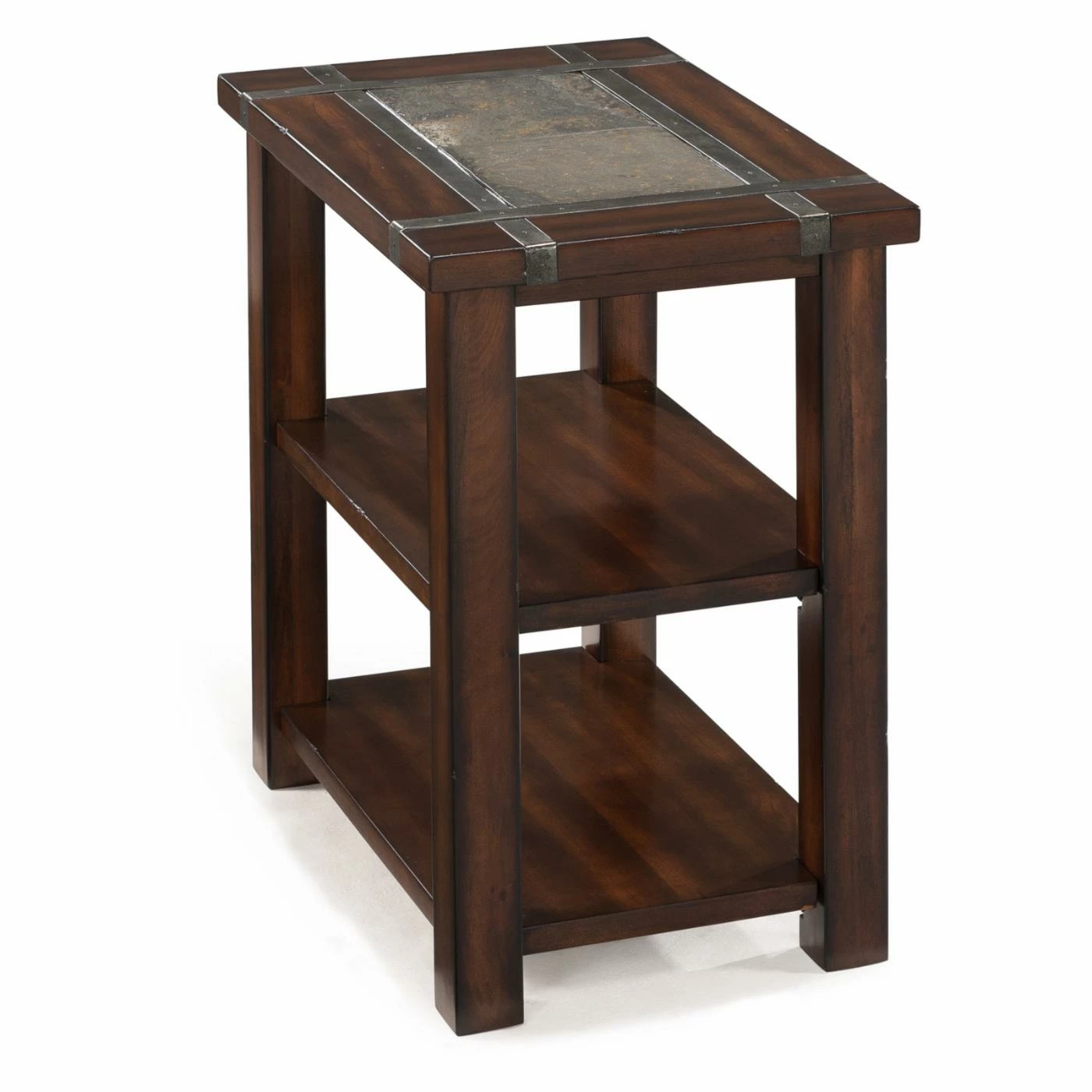 A slender design makes this Magnussen Roanoke End Table a cozy fit in any living space in your house or apartment. This piece works as an end table in the bedroom or living room, or simply as a display table for photos in any living space. Includes two shelves for more versatility. The table was constructed of engineered wood and comes in a timeless cherry wood finish. The topper, literally, is its rustic slate design pattern, which gives the table a little flair to match its traditional style.