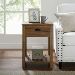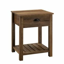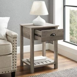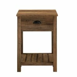 Simple rustic style arrives to your farmhouse styled home with the Manor Park Country Single Drawer Side Table. The single drawer has a half-moon handle in black and telescoping metal drawer glides. Store your remotes and coasters in this drawer and place books or a folded blanket on the lower shelf with a slat style. The spacious top may be decorated with a plant, lamp, or candle and still have room for your coffee mug and current read. This end table is constructed from engineered wood and laminate and comes in your choice of available finish option.