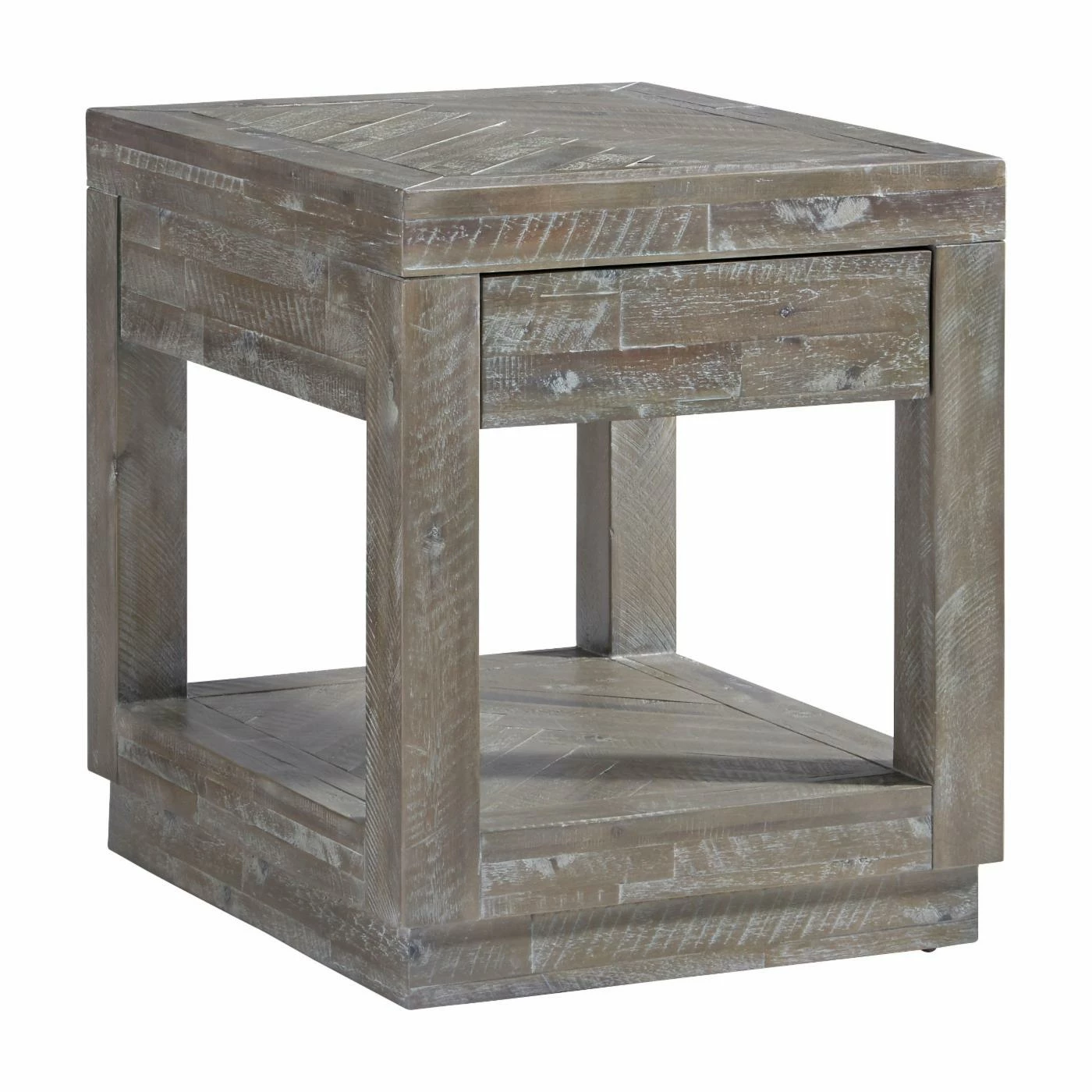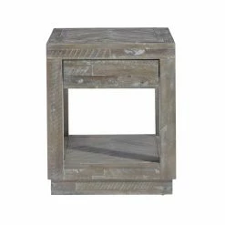 Add rustic charm to your accent dΓ©cor with the Modus Herringbone Solid Wood 1 Drawer End Table. Crafted from acacia wood, this end table’s construction is reminiscent of reclaimed wood pieces. The rustic latte finish, applied with wire brush, adds a handmade and well-loved feel. For storage, you’ll find an open bottom shelf, as well as a drawer flush with the tabletop.
