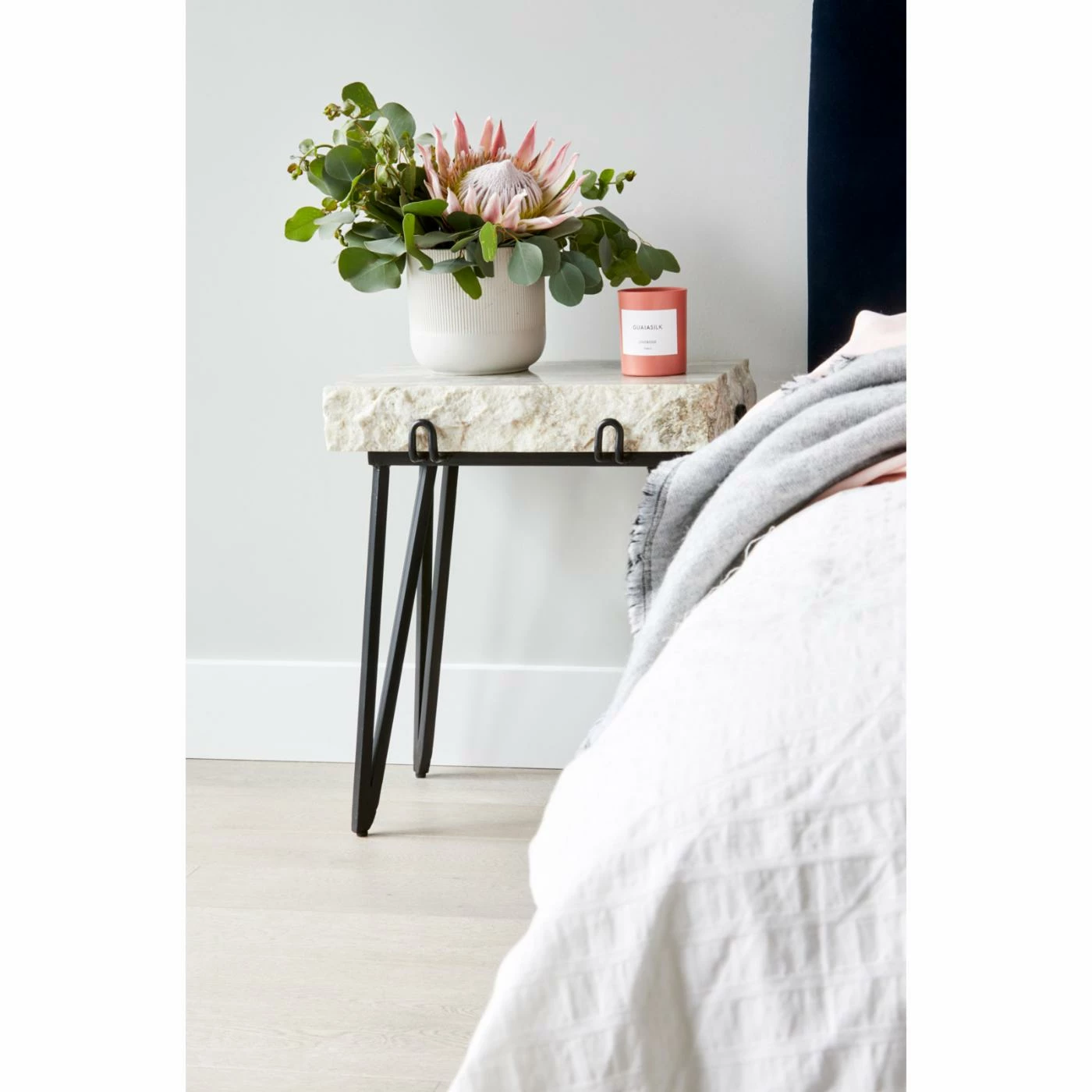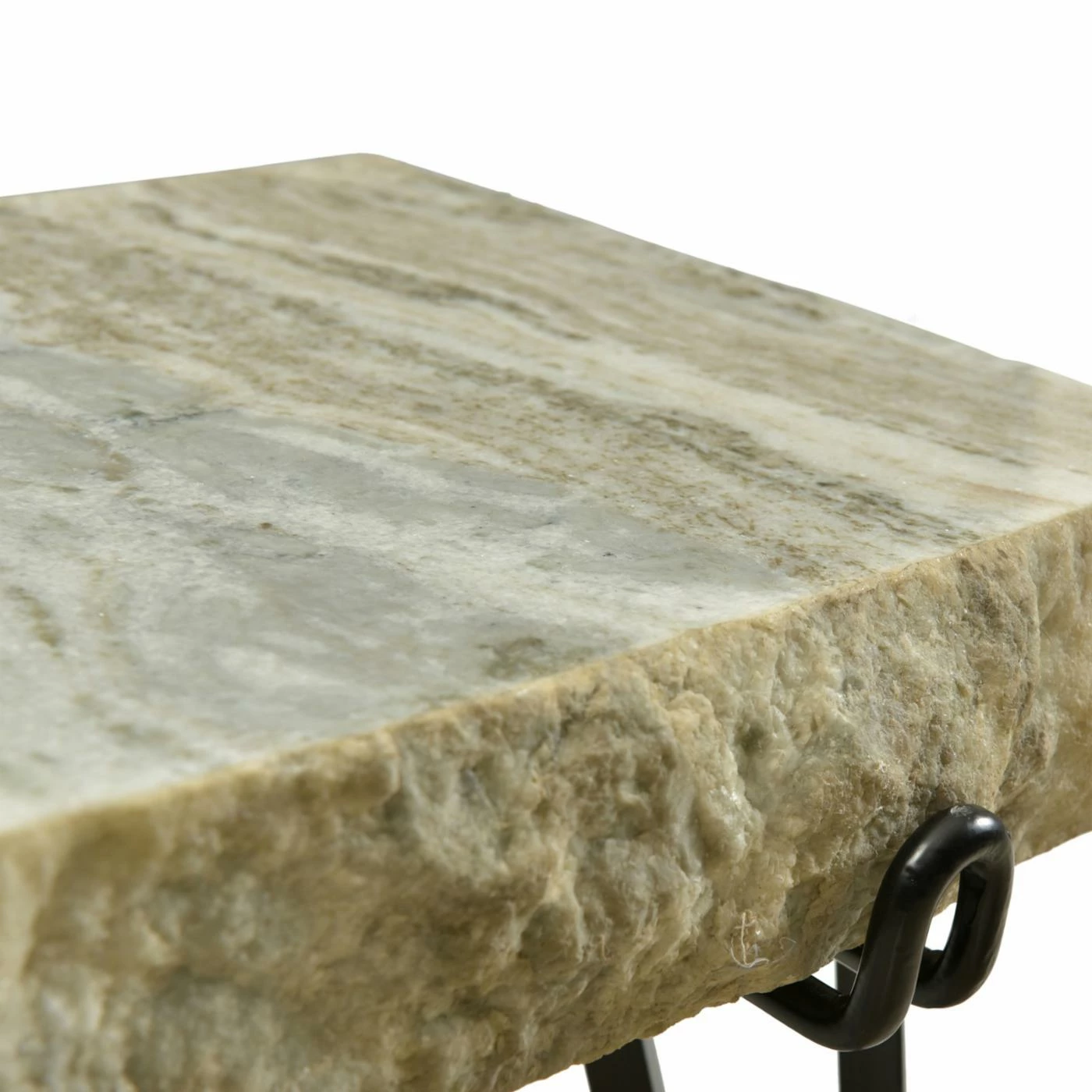 Combine the industrial chic look and natural details like marble into the Moes Home Collection Alpert Accent Table for a hefty accent table to display your favorite belongings upon. The dark hairpin metal legs of this table come together and support the block of marble that makes up the tabletop. This table uses marble in a natural sandy tan color, with various tones for an even more luxurious feel. Put this piece next to your bed or sofa and place a lamp or your favorite potted plant on top. No assembly is required.