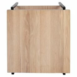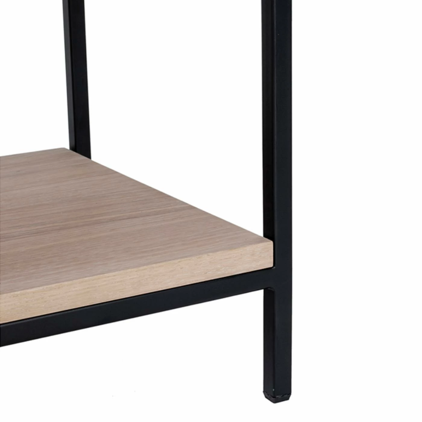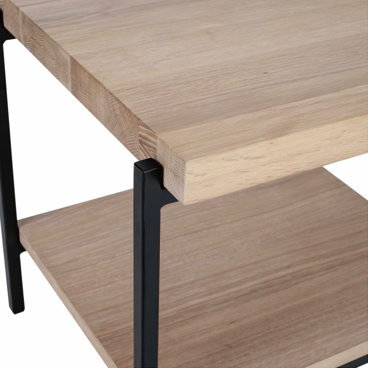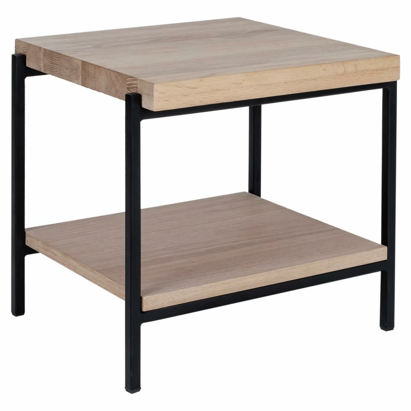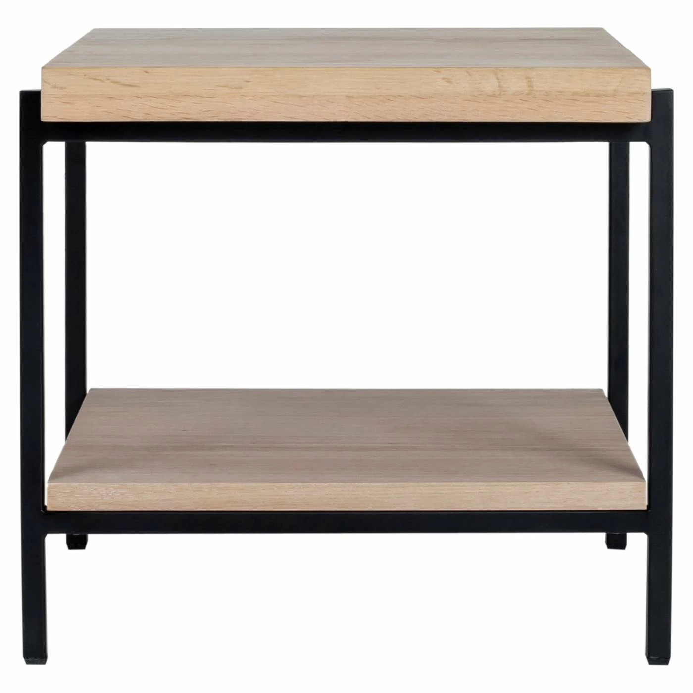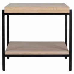 Fit for any-style dΓ©cor, the Moes Home Collection Mila Side Table lends open storage and clean lines. Crafted with a sturdy metal frame in black, this side table features two solid oak shelves with a natural finish with its own unique knots, whorls, and woodgrain. This side table requires no assembly and is covered by a manufacturerβs 2-year warranty.