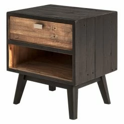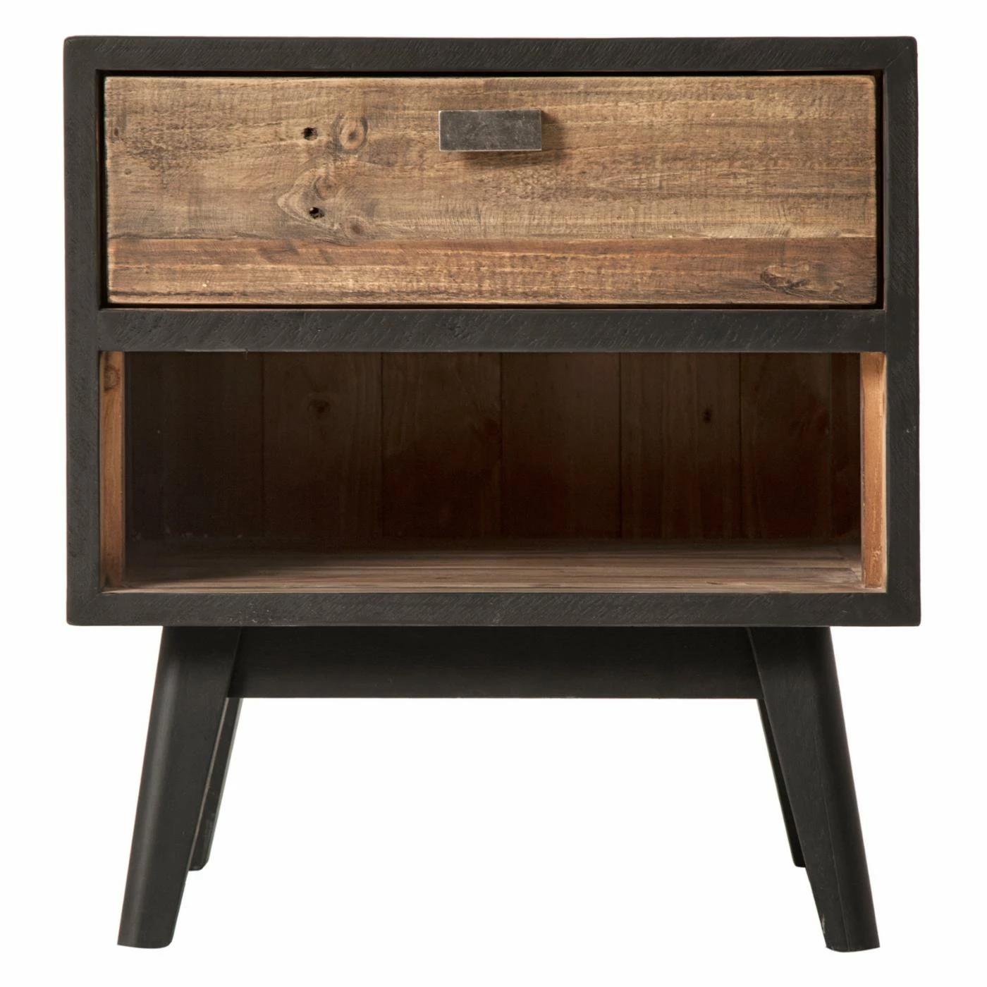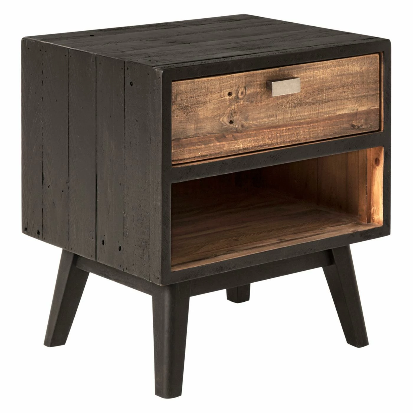 Angled legs and a boxy top give the Moes Home Collection Nova Side Table a sleek, mid-century modern silhouette. The side table is crafted with both durability and sustainability in mind out of a blend of reclaimed pine, solid new pine, and solid acacia. For a two-tone look, the single drawer and the inside of the open cubby below are left in their natural color. The rest of the side table shows off a weathered black finish.