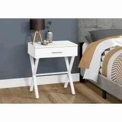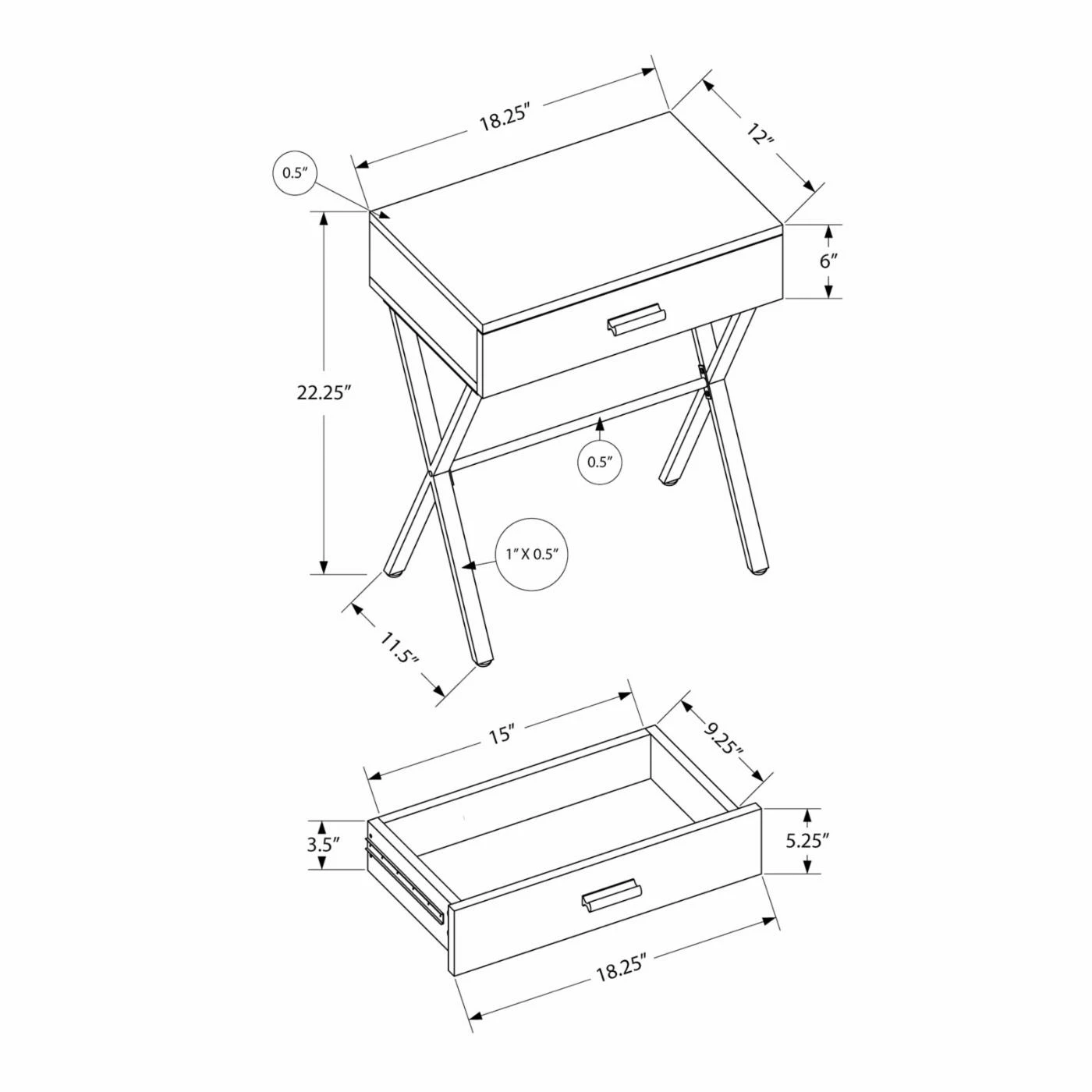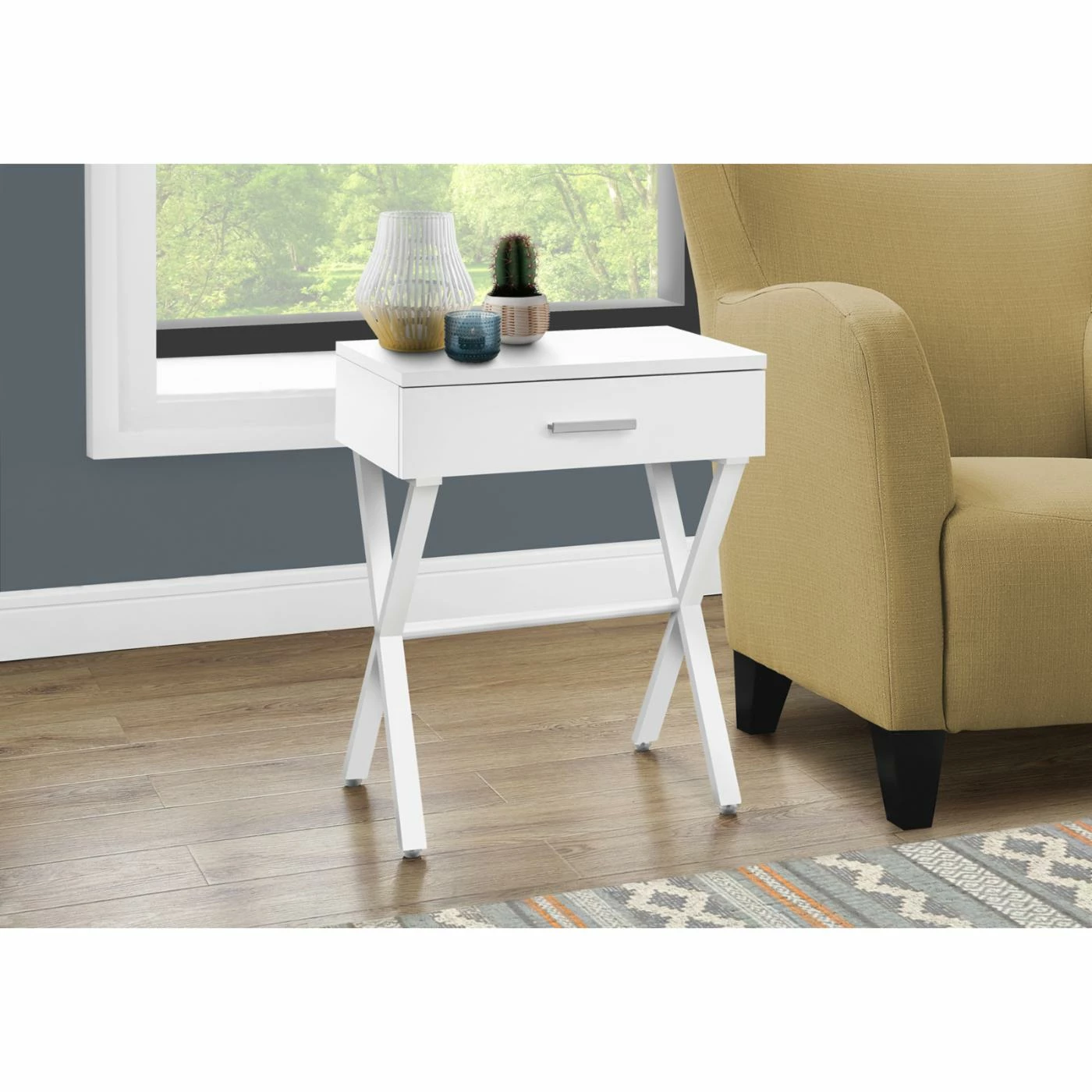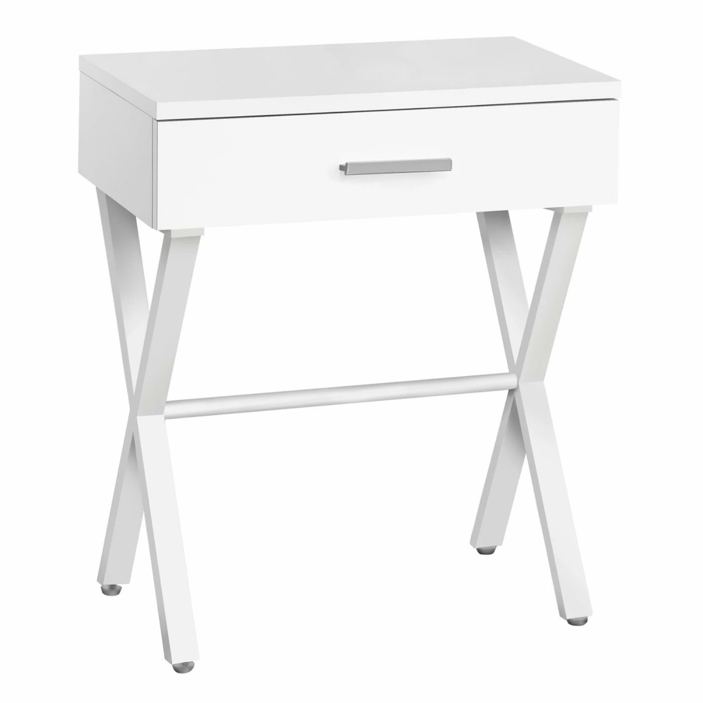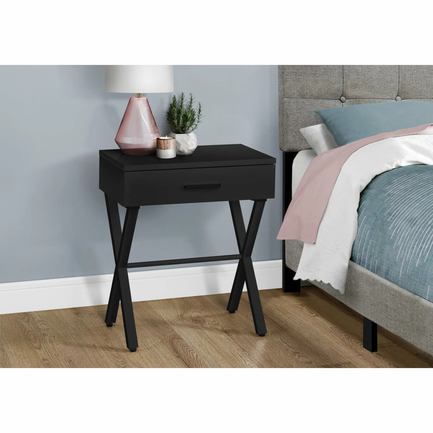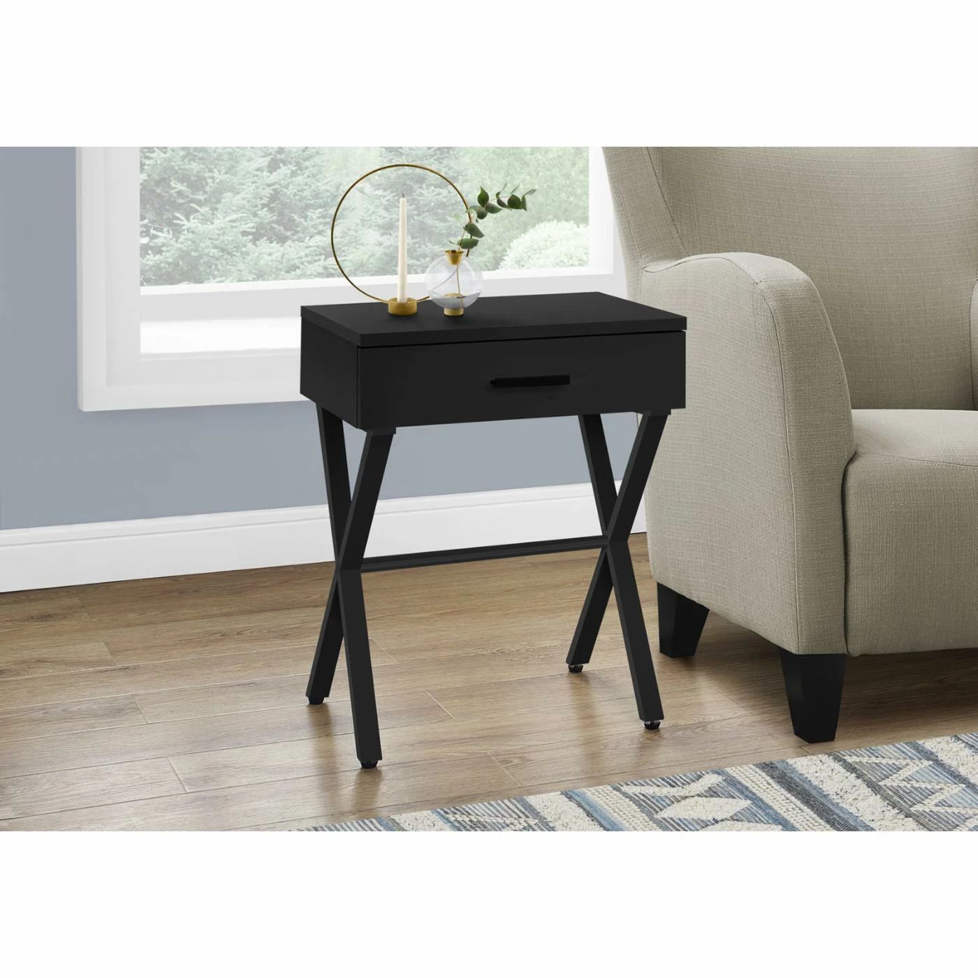 The multi-functional Monarch Specialties Crossed Contemporary End Table is suitable for any room in your home. Use it to display your favorite photo and make use of the convenient drawer for storage. This accent table combines a sleek black finish table top with X-design black metal legs, providing a solid base. Place this side table just about anywhere in your home, including your living room, bedroom as a nightstand, or even in your office space for everything from snacks and drinks to your laptop or tablet.