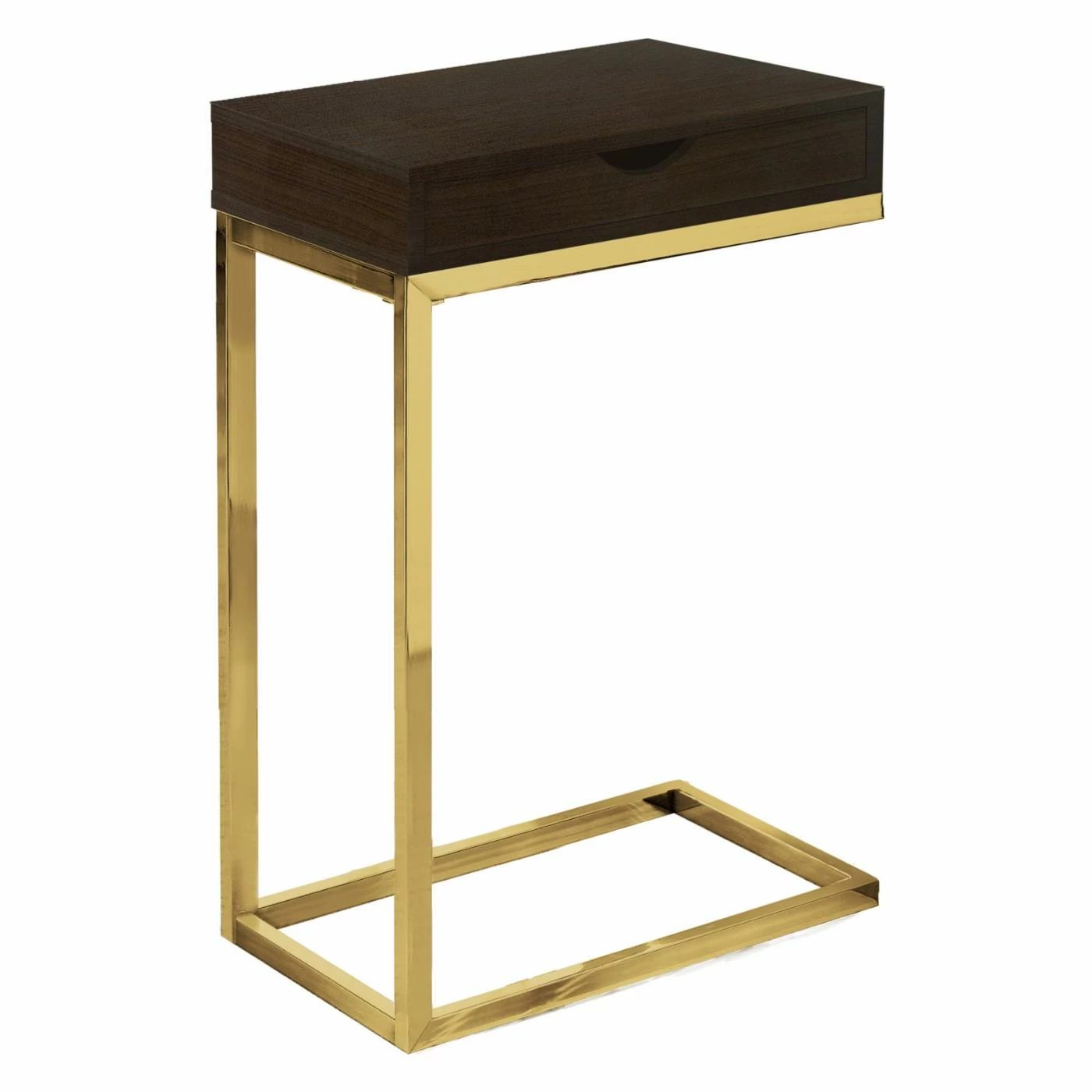 A practical addition to your living room or bedroom, the Monarch Specialties Modern C-Table with Drawer blends modern and glam style with smart function. A gold metal frame supports the engineered wood and laminate top in a rich cappuccino finish. Stash reading material or remotes inside the convenient drawer. The C-shaped frame is designed to slide conveniently under furniture to keep items close-at-hand.