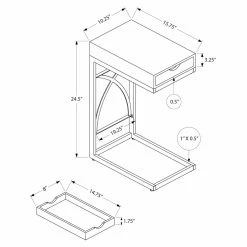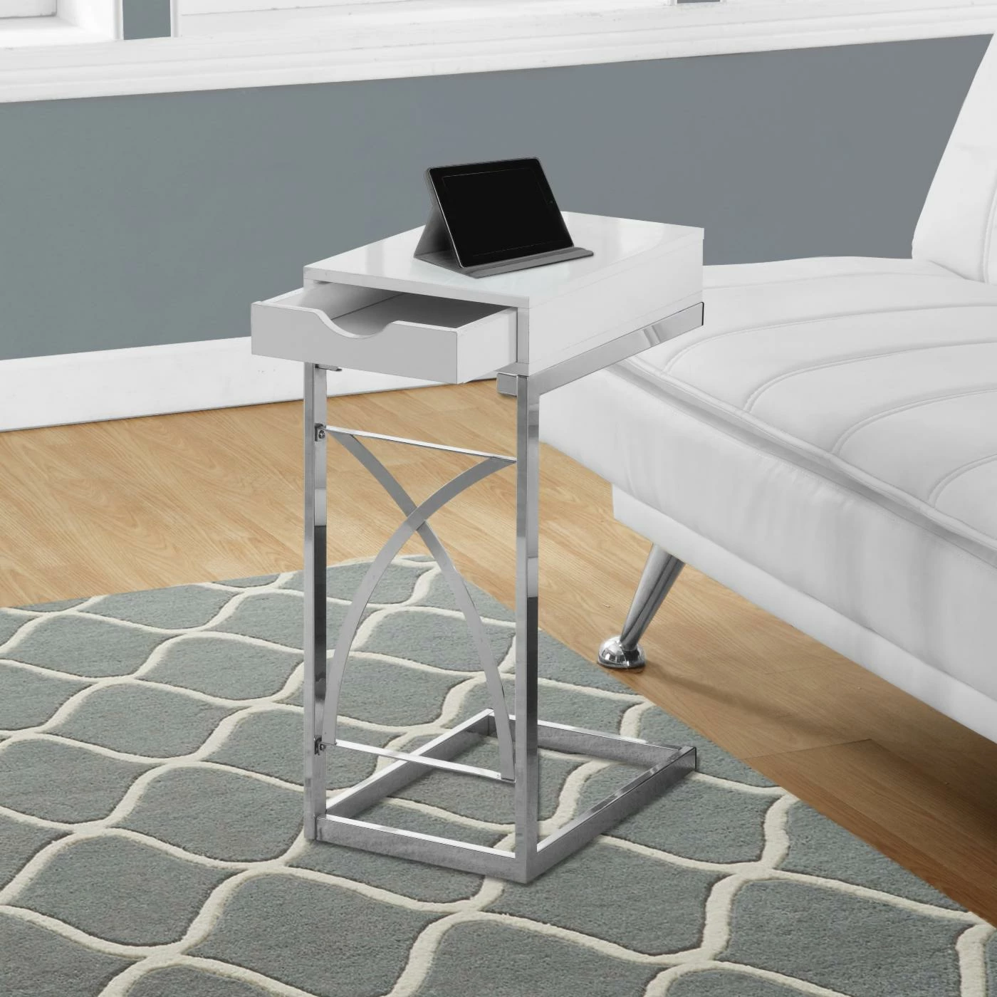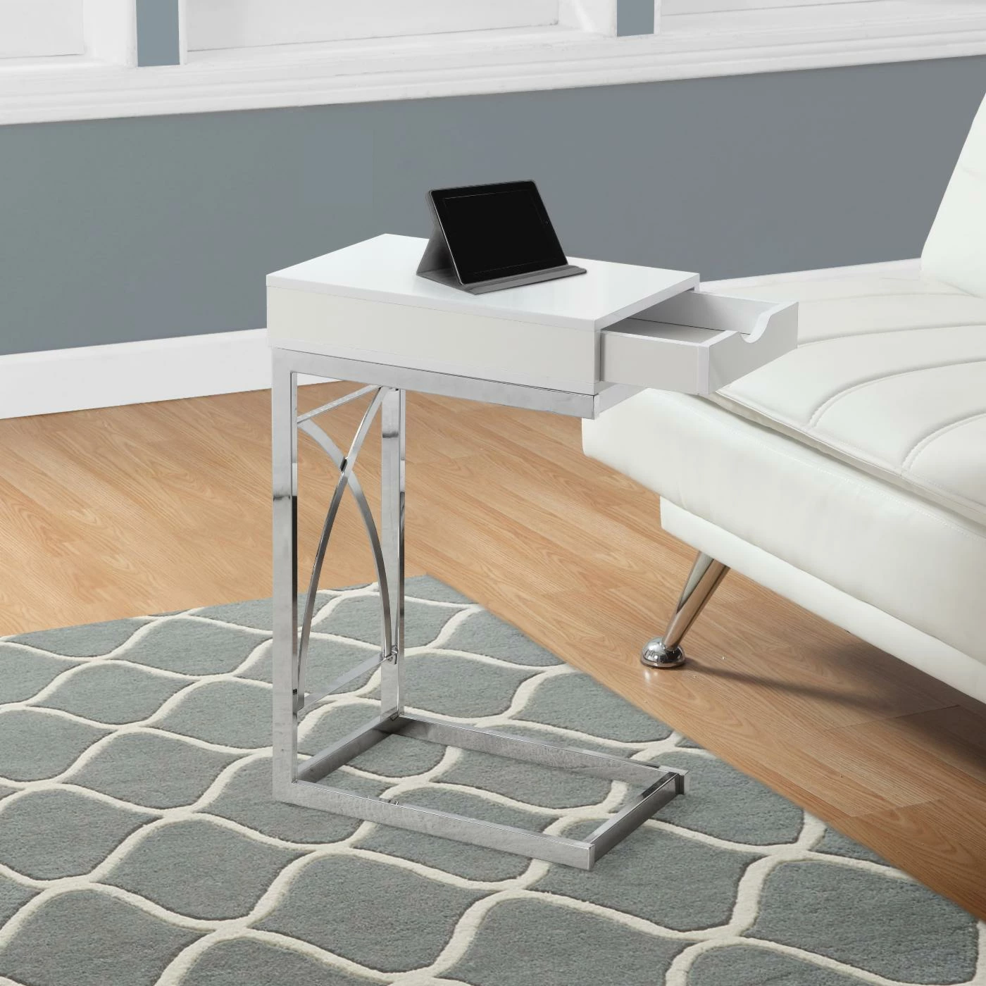 The visually striking Monarch Specialties One Drawer C Shaped End Table comes in the glossy finish of your choice and features a bright, chromed metal base with an angular design that can glide underneath your sofa or armchair to give you a convenient top perfect for setting aside food and drink, or propping up a laptop or tablet. The multi-functional design is terrific for watching sporting events and films, or getting a little work done while spending time with friends and family. It also offers a pull-out drawer for storing remotes, coasters, and other accessories, so your gathering space stays clutter-free.