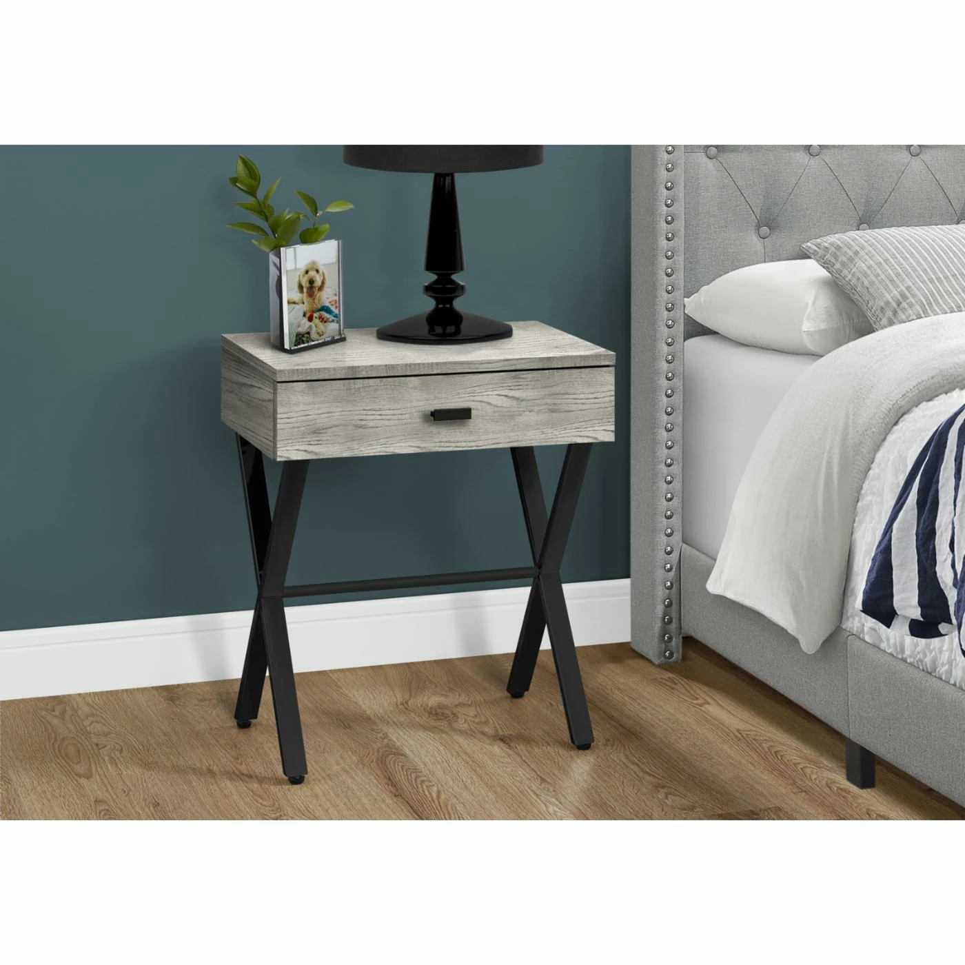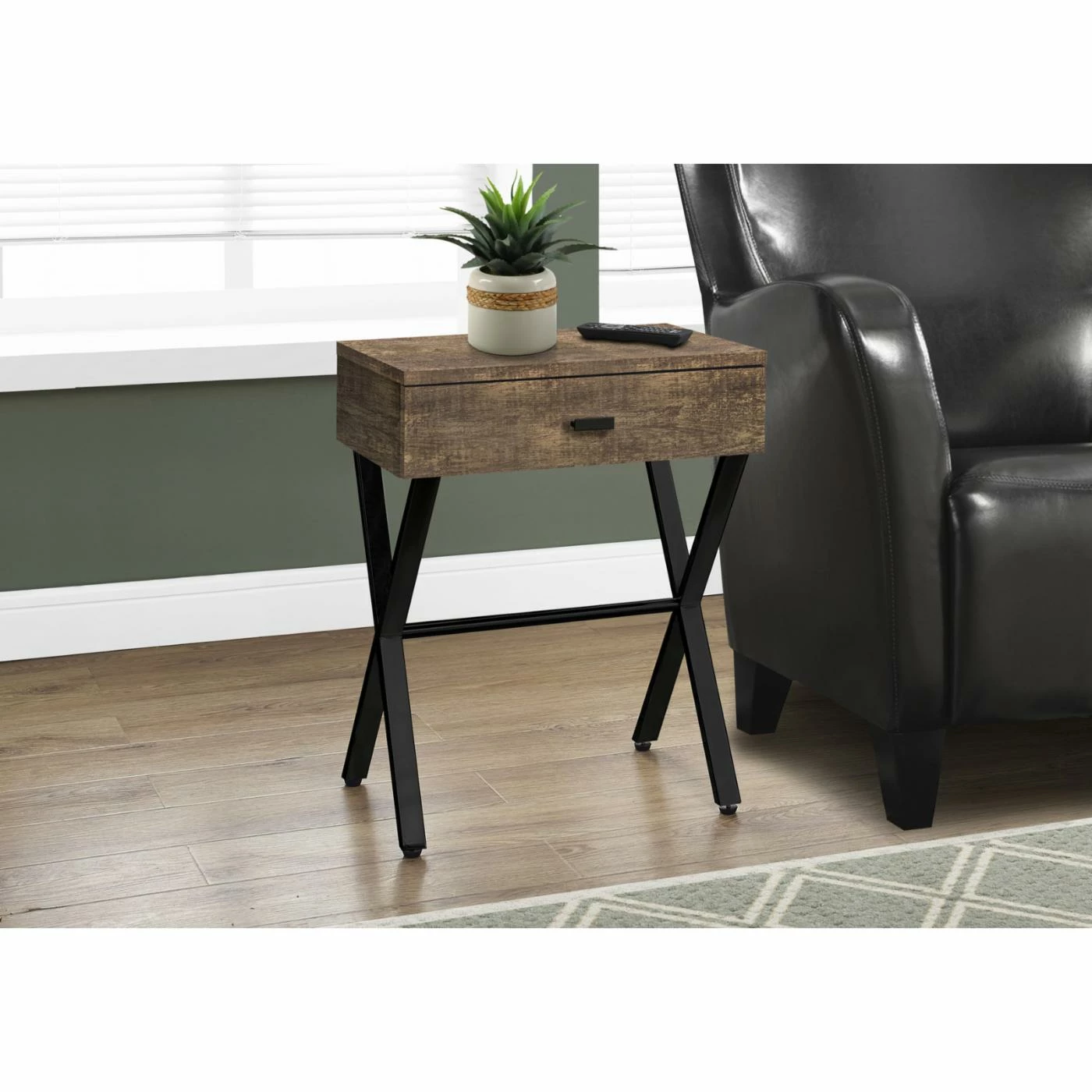Sophisticated and rustic, the Monarch Specialties Reclaimed Wood-Look Single Drawer Side Table is a stylish addition to your living room, entryway, or even bedroom. A black metal frame supports an engineered wood and laminate surface with a storage drawer in your choice of weathered, reclaimed wood-style finish.