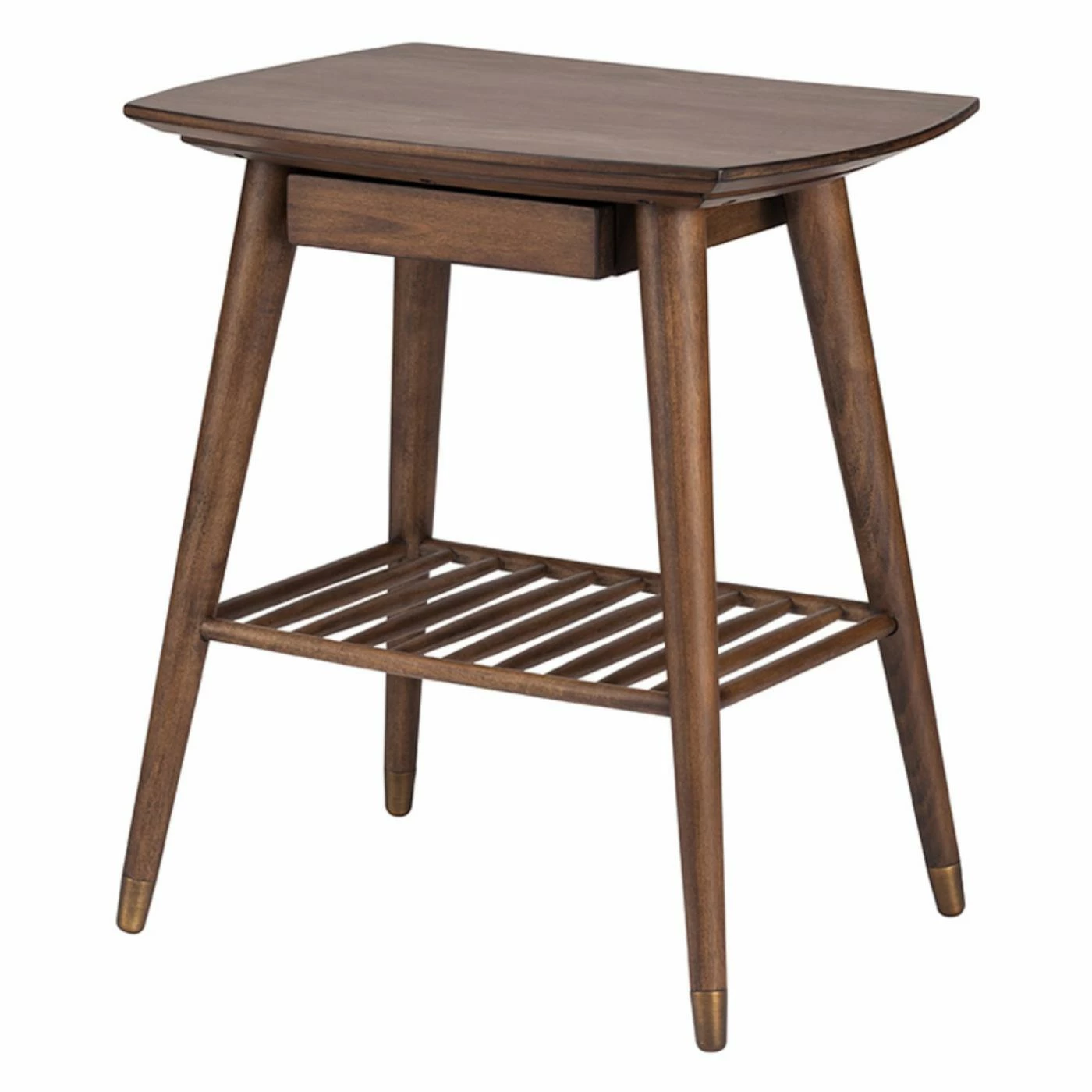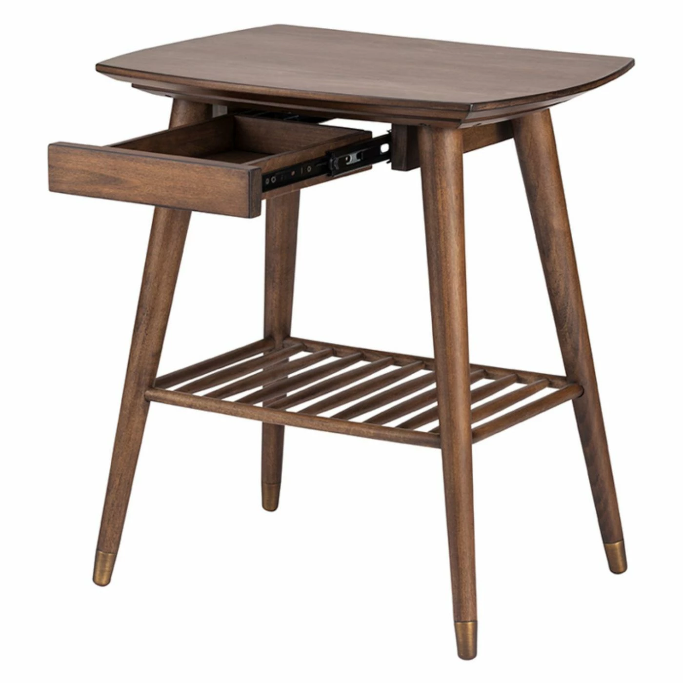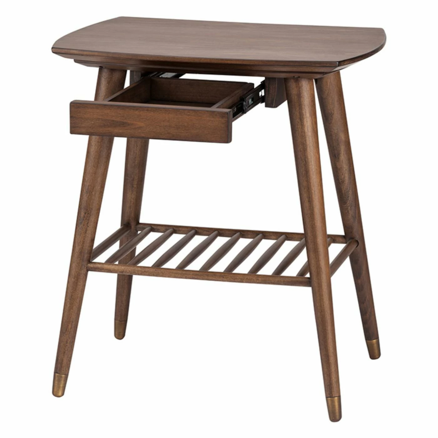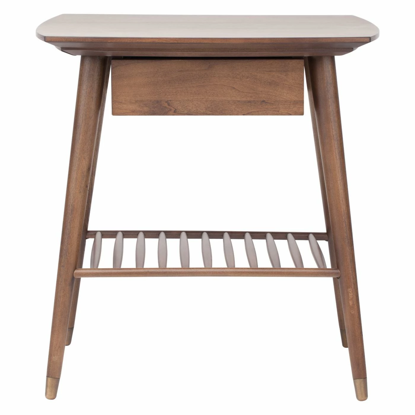 Provide your armchair or sofa with a fashionable companion in the Nuevo Ari Side Table. The charming side table is built from solid poplar hardwoods and finished in a warm walnut brown. The widely-angled legs come with brass foot caps. For storage, a pull-out drawer is built into the apron and a slatted lower shelf below.