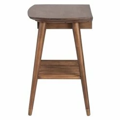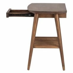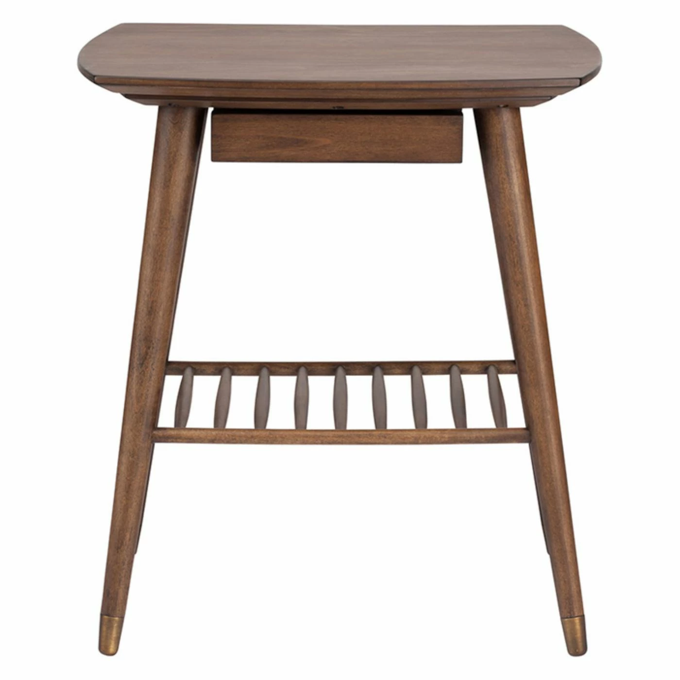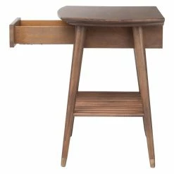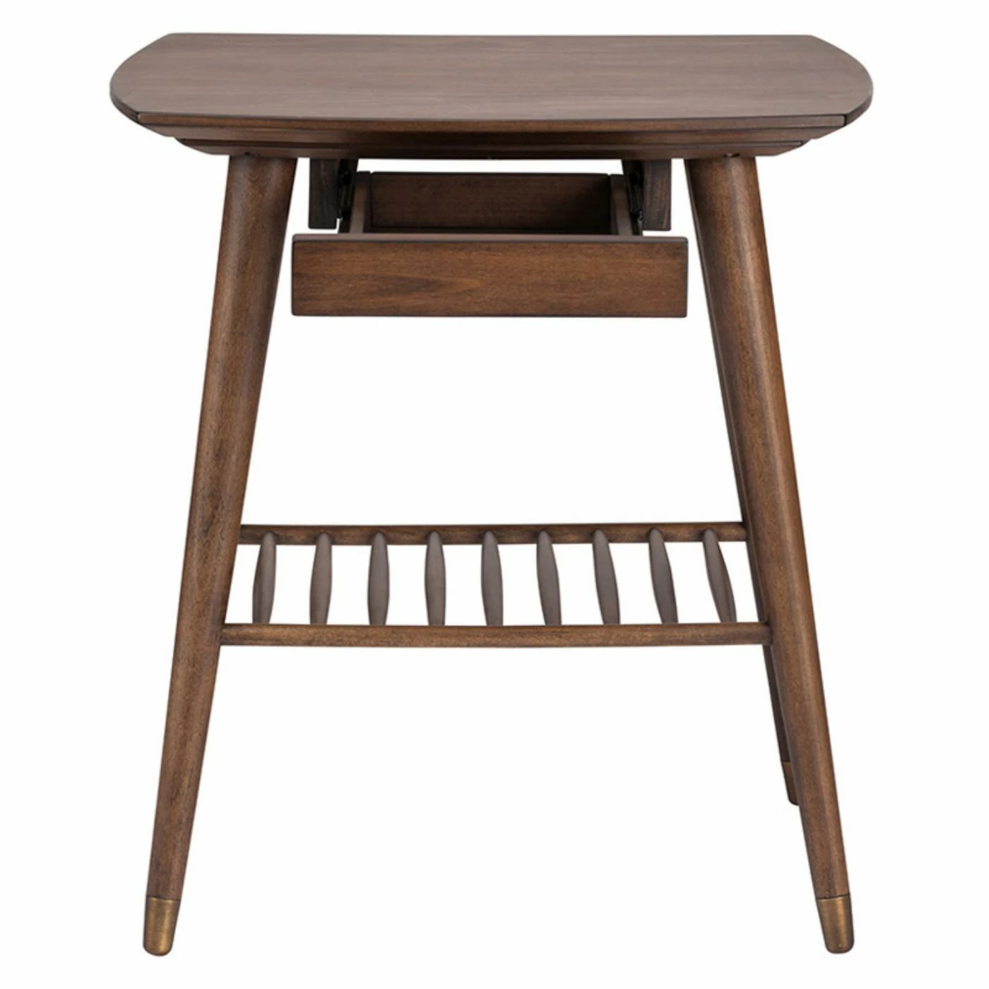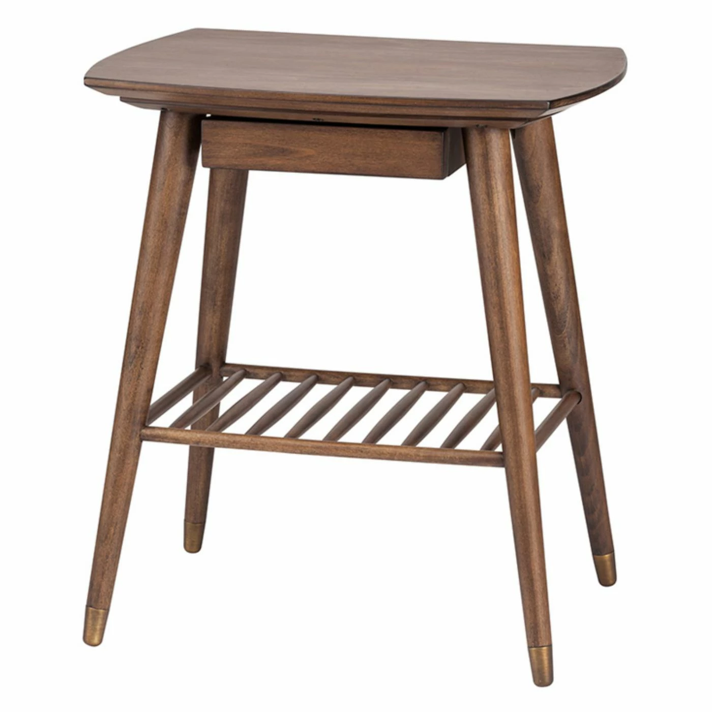 Provide your armchair or sofa with a fashionable companion in the Nuevo Ari Side Table. The charming side table is built from solid poplar hardwoods and finished in a warm walnut brown. The widely-angled legs come with brass foot caps. For storage, a pull-out drawer is built into the apron and a slatted lower shelf below.