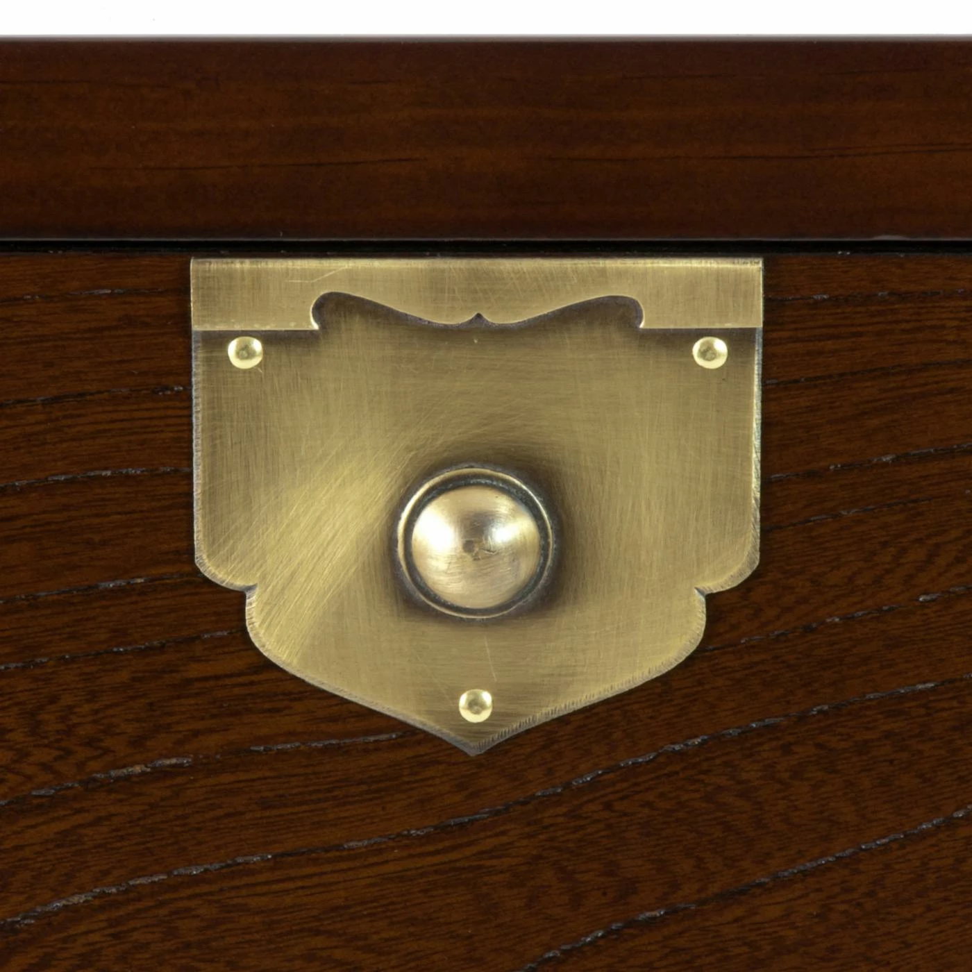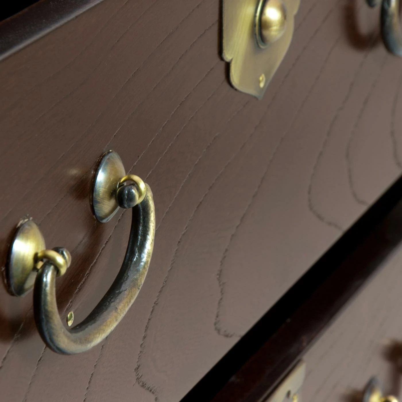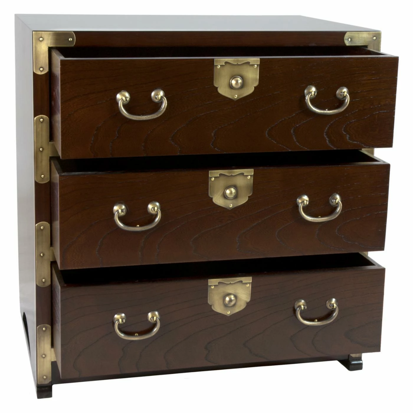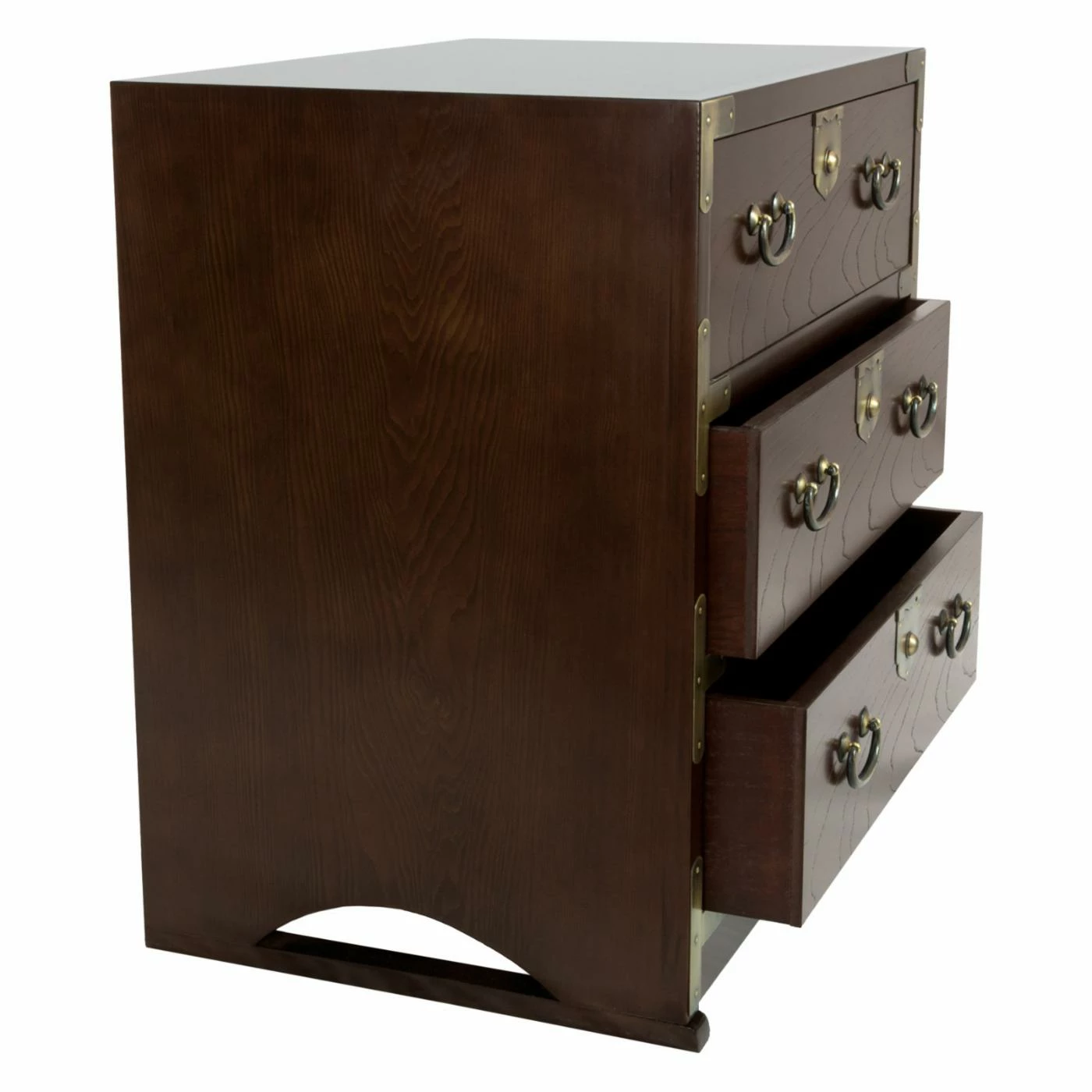 Clean lines and impeccable craftsmanship are enhanced by Asian hardware in this Oriental Furniture Korean Rectangle End Table. This Oriental end table is beautifully-made of richly grained elm wood in a hand-rubbed dark stain. Polished brass drawer hasps, handles, and fittings make this end table distinctive. Three drawers offer ample storing and make this ideal as a nightstand, lamp table, or hallway storage solution.