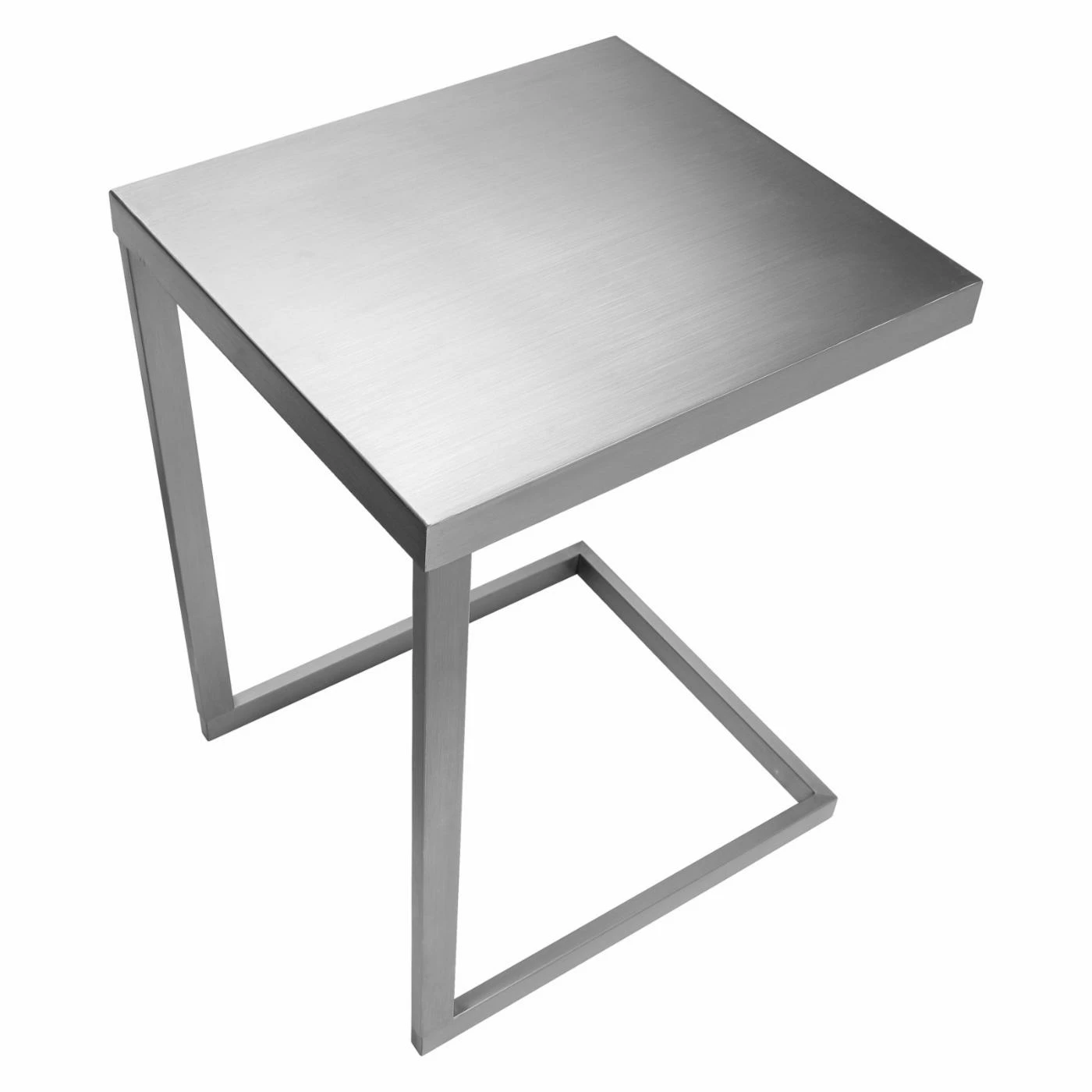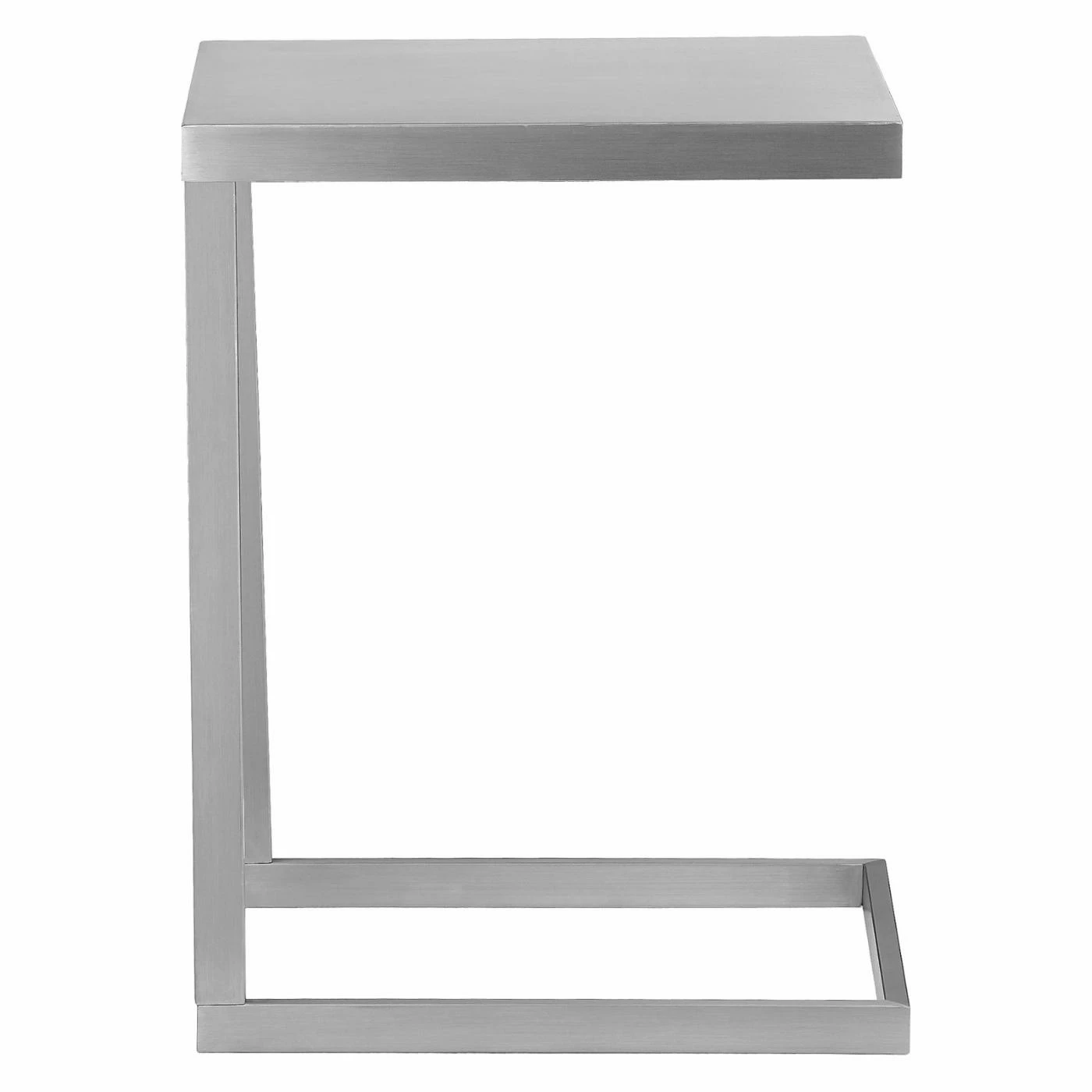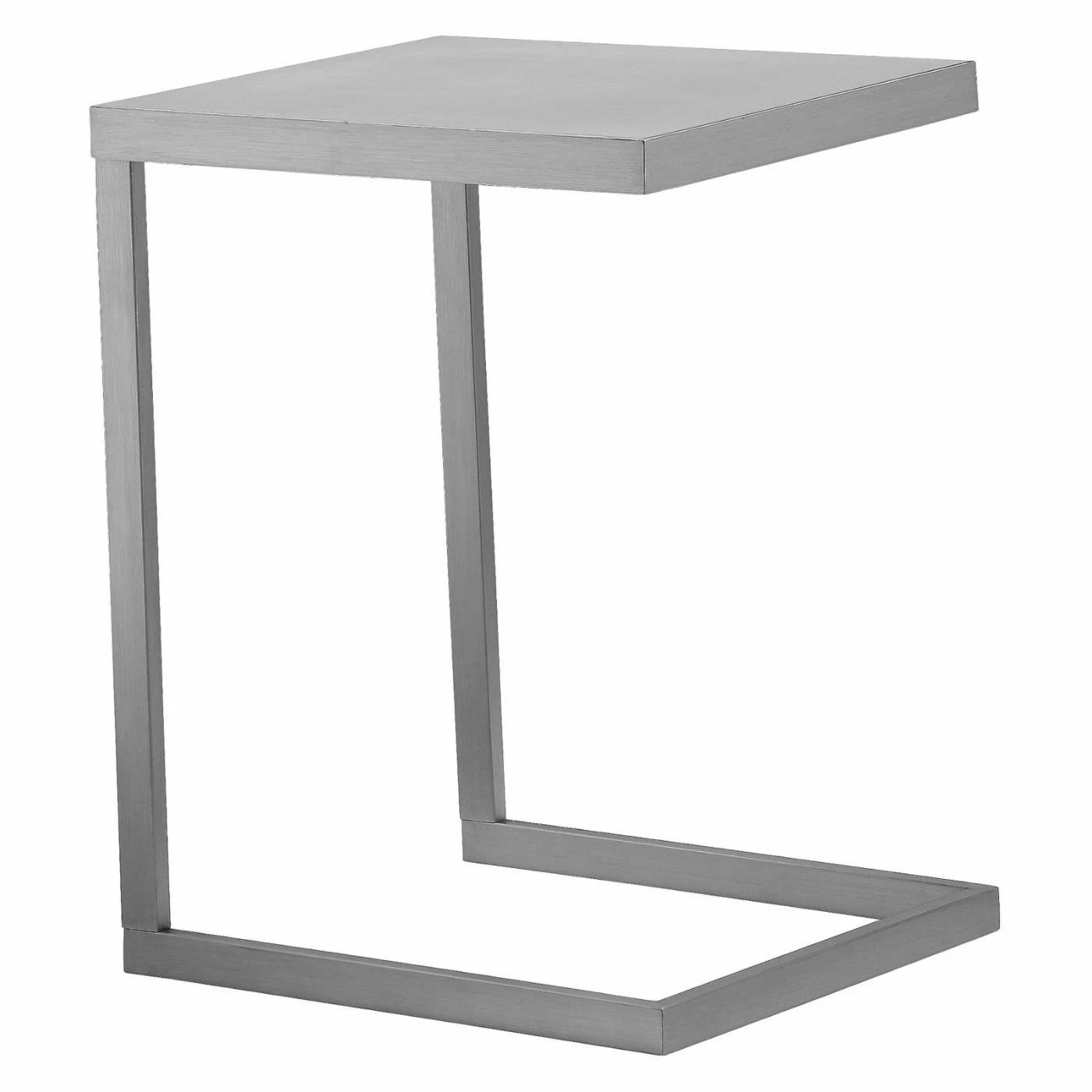 Dine and work in your seating area with greater ease using the Pangea Home Century Tray Table Brushed Metal. The low profile base of this contemporary table can slide under the frame of most chairs, sofas, and loveseats. Once the table is in place, the cantilever top reaches over the side of your favorite chair, giving you a sturdy working or dining surface. Manufactured out of steel, the table has a matte silver brushed finish that is sure to coordinate with your color palette.
