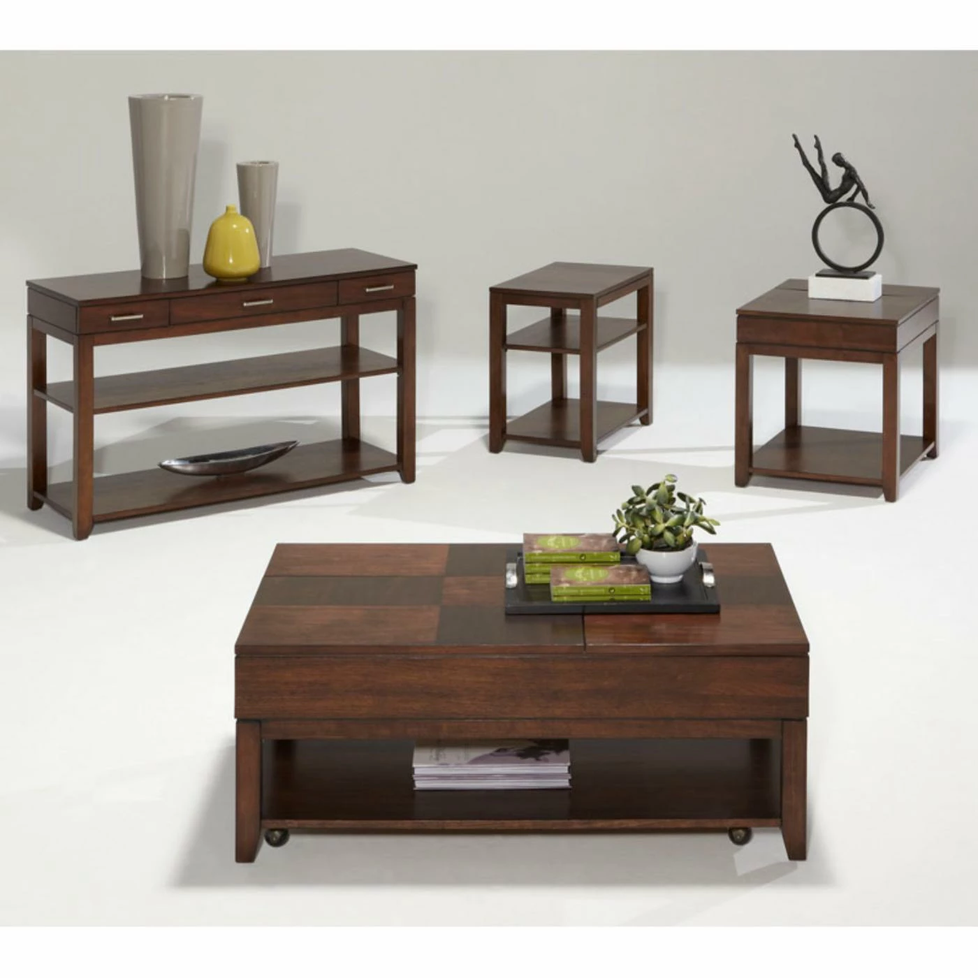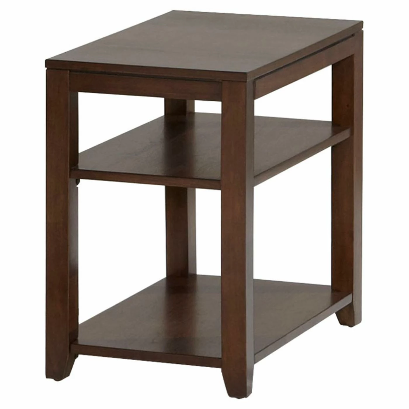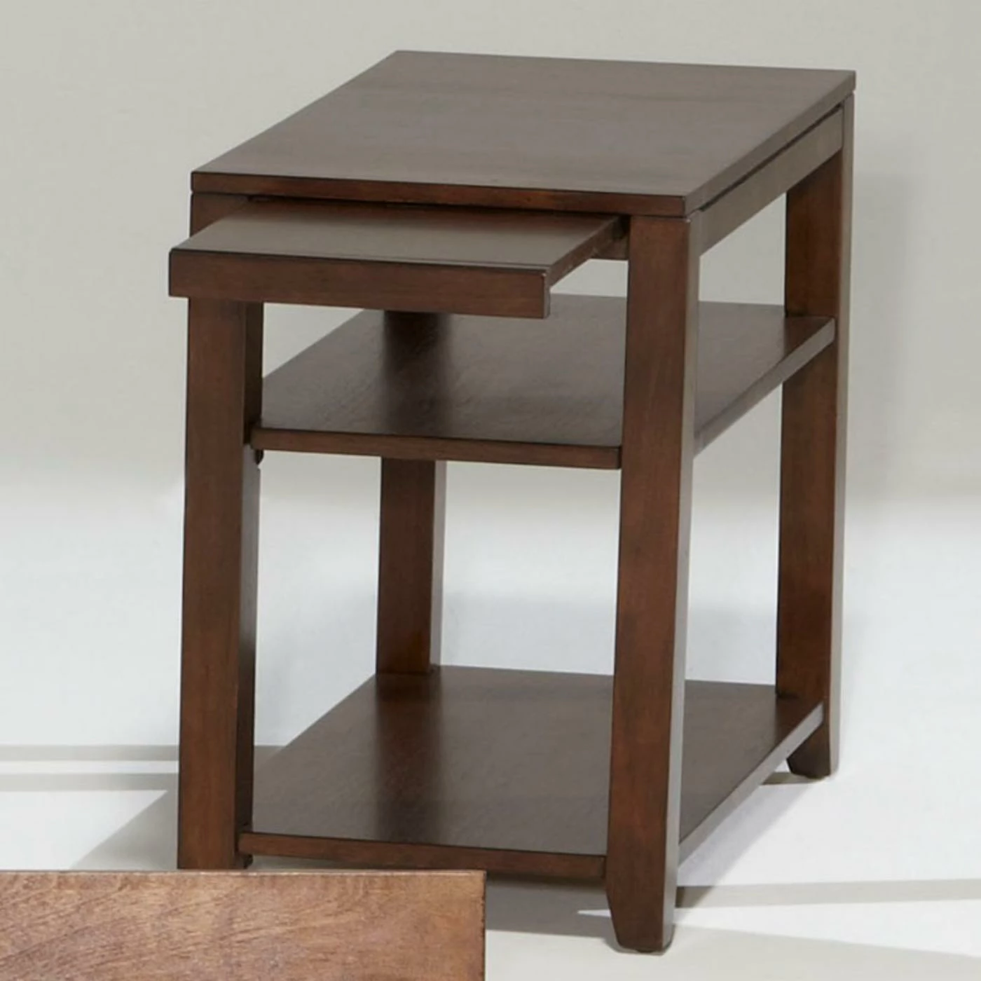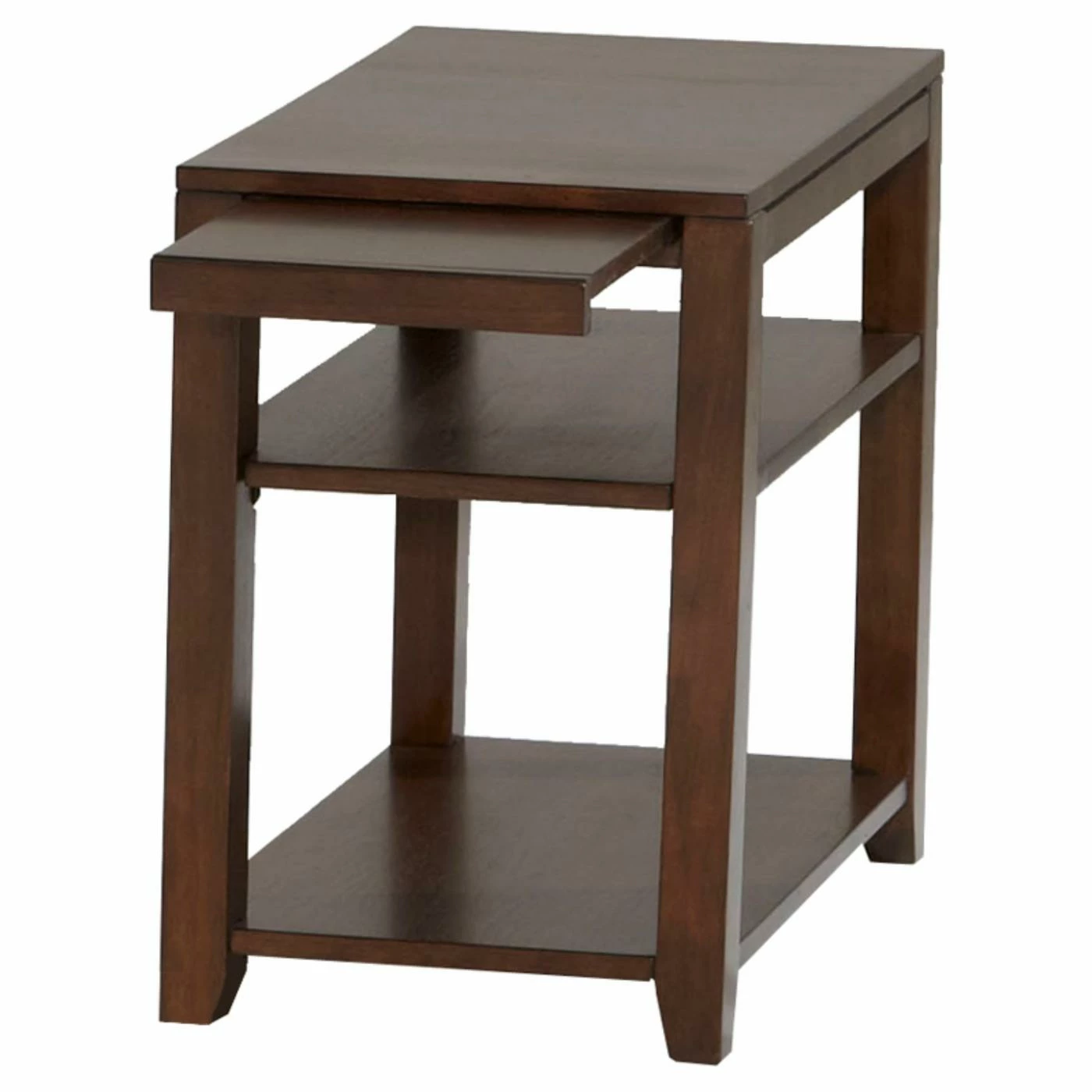 Elevate your living room decor while adding convenience the armrest of your recliner simply cannot bring. The Progressive Furniture Daytona Chairside Table is a fashionable and functional accent piece crafted from poplar solids and regal brown walnut veneers. Smart and stylish, this table features two open shelves and a pull-out laminated surface ideal for setting aside a cup of coffee or a hot plate.
