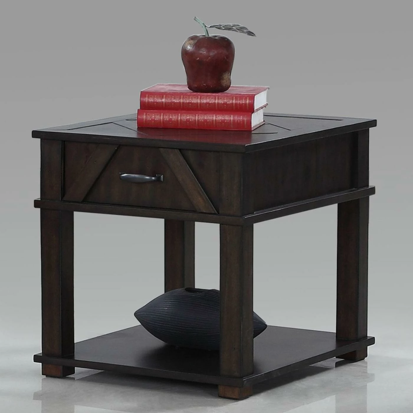 Details abound in the Progressive Furniture Foxcroft Rectangular End Table! This stout design is crafted from poplar solids with rich pine veneers in an entrancing dark finish. Outfitted with a full lower shelf and a single drawer for storage space. Diagonal decorative overlays and a metal drawer pull add visual interest.