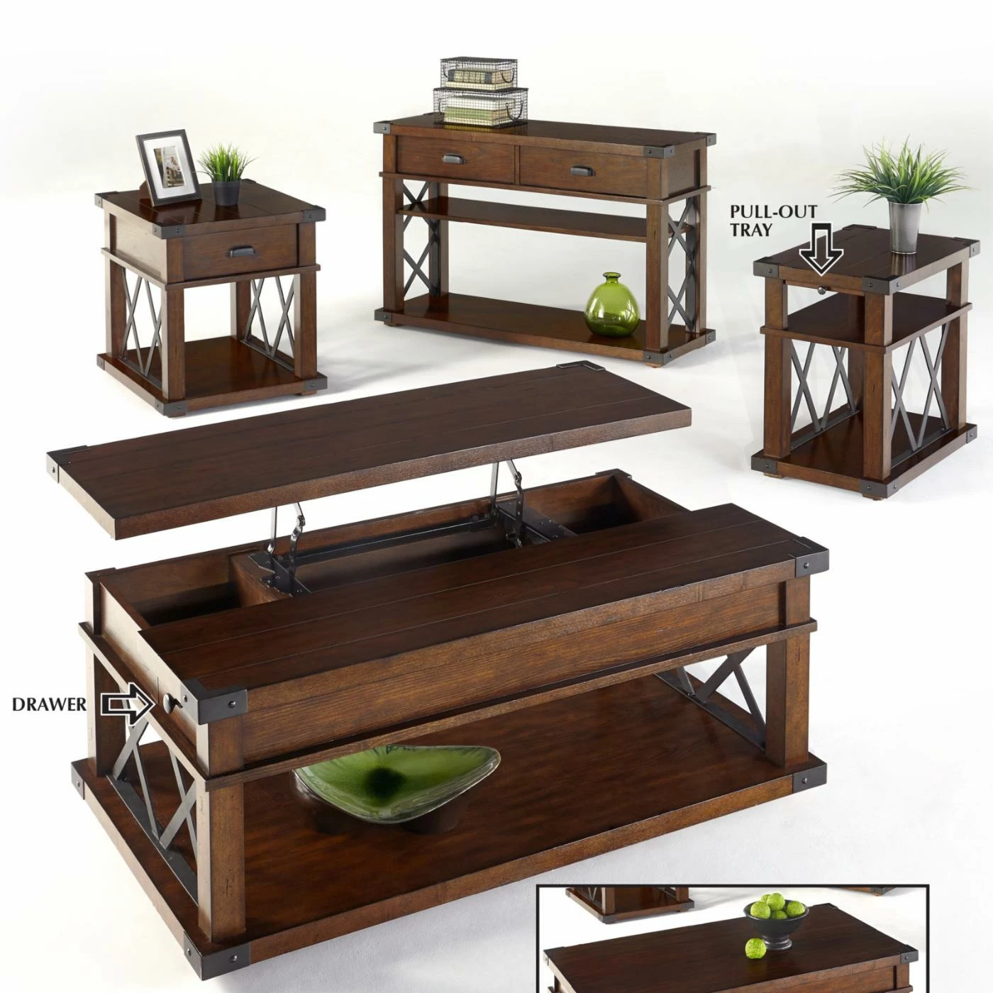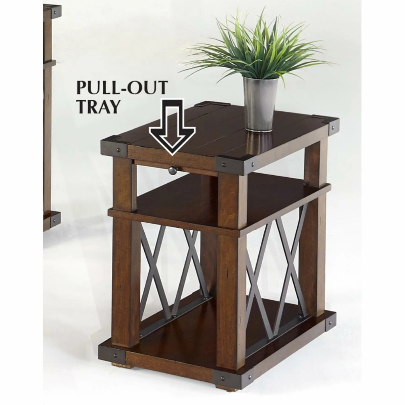 Convenience and rugged style are exactly what the Progressive Furniture Landmark Chairside Table has to offer. This rustic accent features poplar wood and vintage ash veneer construction with antique iron accents, and ample storage space. The table includes a pull-out tray perfect for setting aside a drink, and two open shelves so you can stash away things like blankets, books, and more.