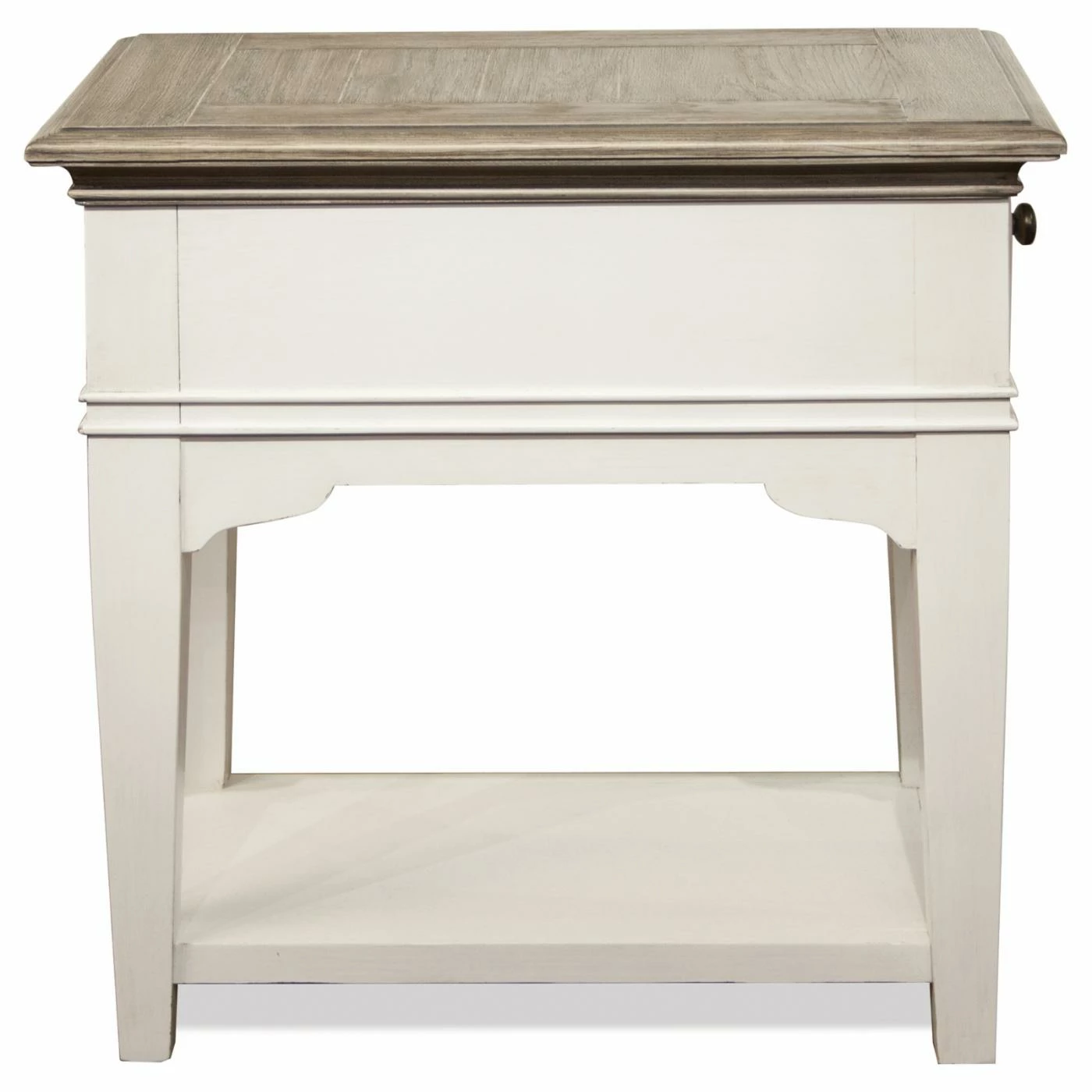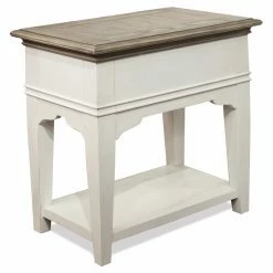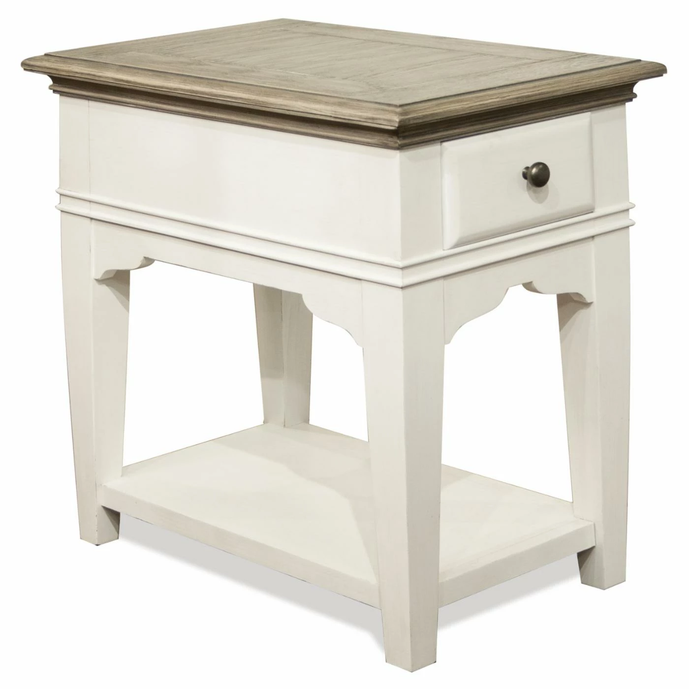 Sized for smaller spaces, the Riverside Furniture Myra Leg Chairside Table adds that extra space for placing beverages or collectibles while keeping remotes, glasses, or other items neatly out of sight. The natural and white finishes are the perfect complement to a variety of décors and will add an inviting warmth to any room. The durable craftsmanship includes details like dovetail joints, smooth-rolling glides, and an ability to easily handle every day use.