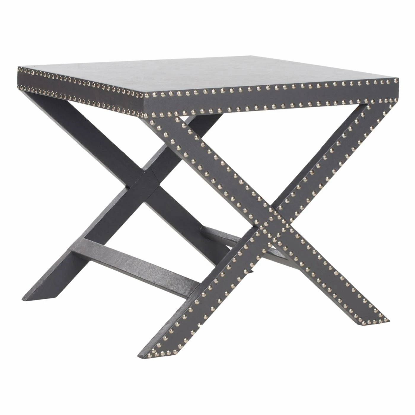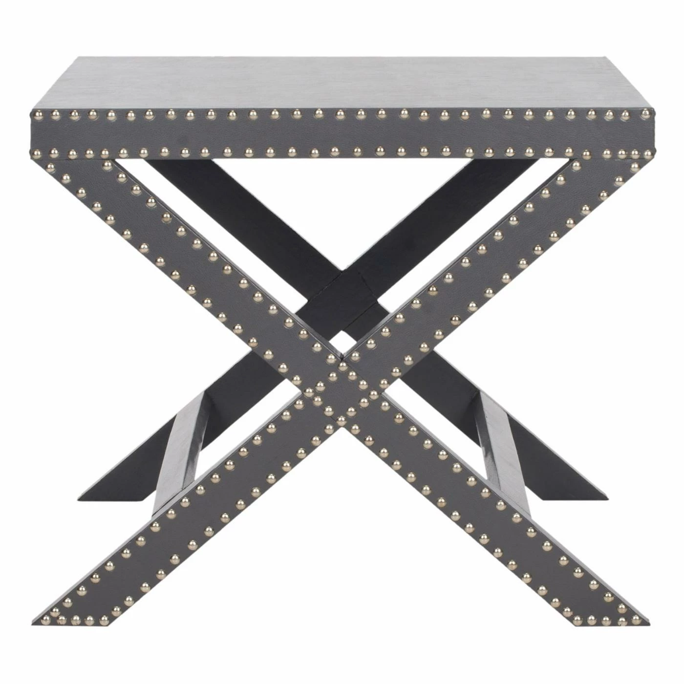They say opposites attract, and the combination of Hollywood Regency style mixed with modern industrial sensibility makes the Safavieh Jeanine X End Table a truly stunning piece. The X-shaped table is upholstered in faux leather for a truly opulent feeling. Studded with nailhead details, this piece is perfect for your unique and well-appointed home.