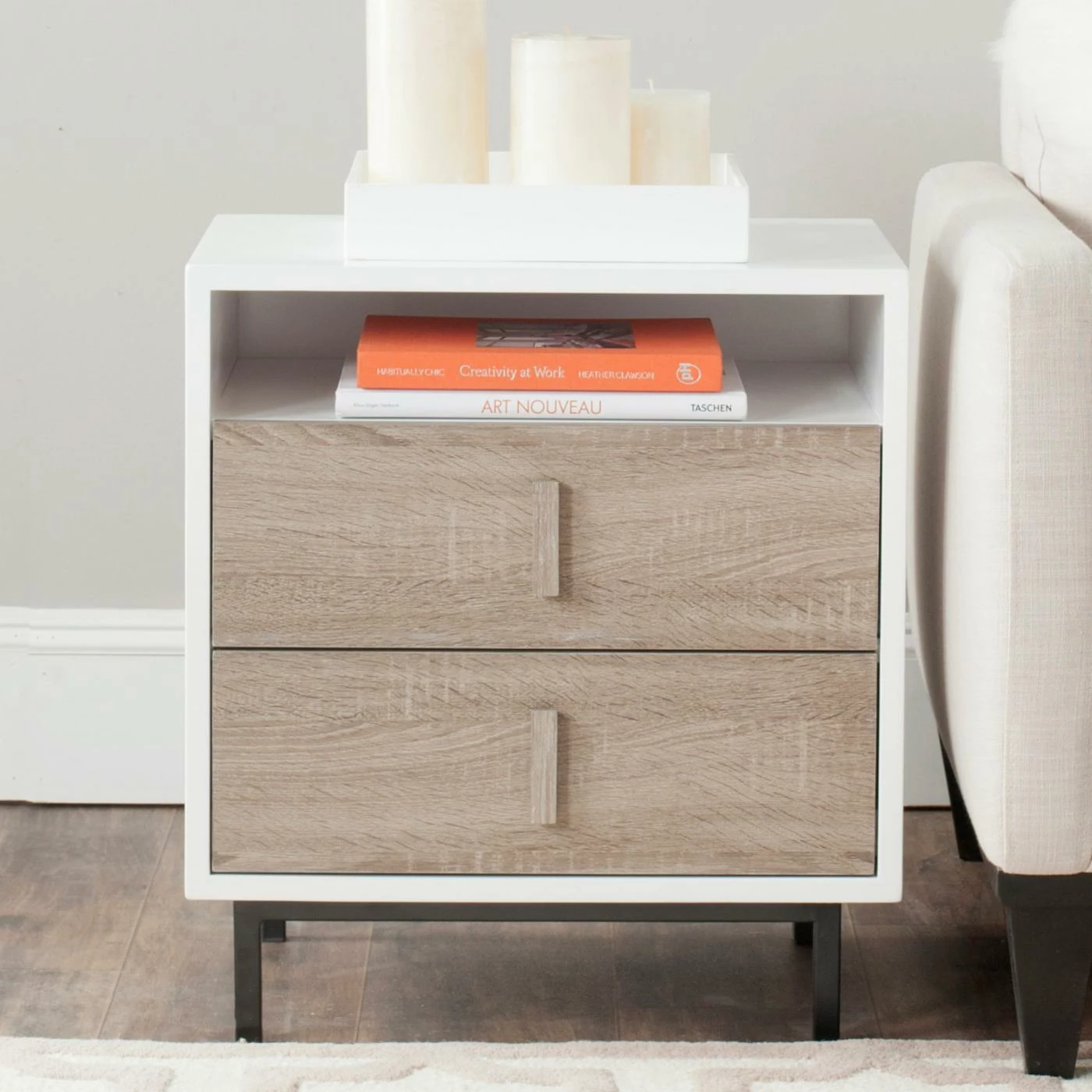 Store items in your living room or bedroom in sleek retro style with the Safavieh Kefton Mid Century Scandinavian Lacquer 2 Drawer Cabinet. Built out of engineered wood, the top of the cabinet features a white lacquered frame with an open storage compartment. Two sliding drawers with oak grain-finished fronts provide closed storage space and are completed by simple vertical block handles. A black powder-coated iron base supports the cabinet.