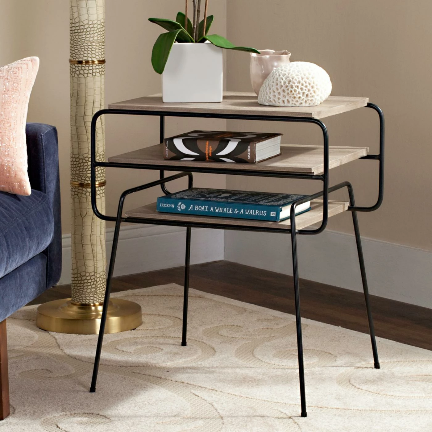 Increase the amount of storage space in your living room or bedroom with the smart design of the Safavieh Marcel Retro Mid Century 3 Tier End Table. With three levels of storage, this mid-century modern table gives you a place to rest a lamp or decorative items plus two additional spots for managing remote controls, books, and other items. The light gray engineered wood shelves show off a natural wood grain effect that contrasts with the color and texture of the black tubular iron frame.