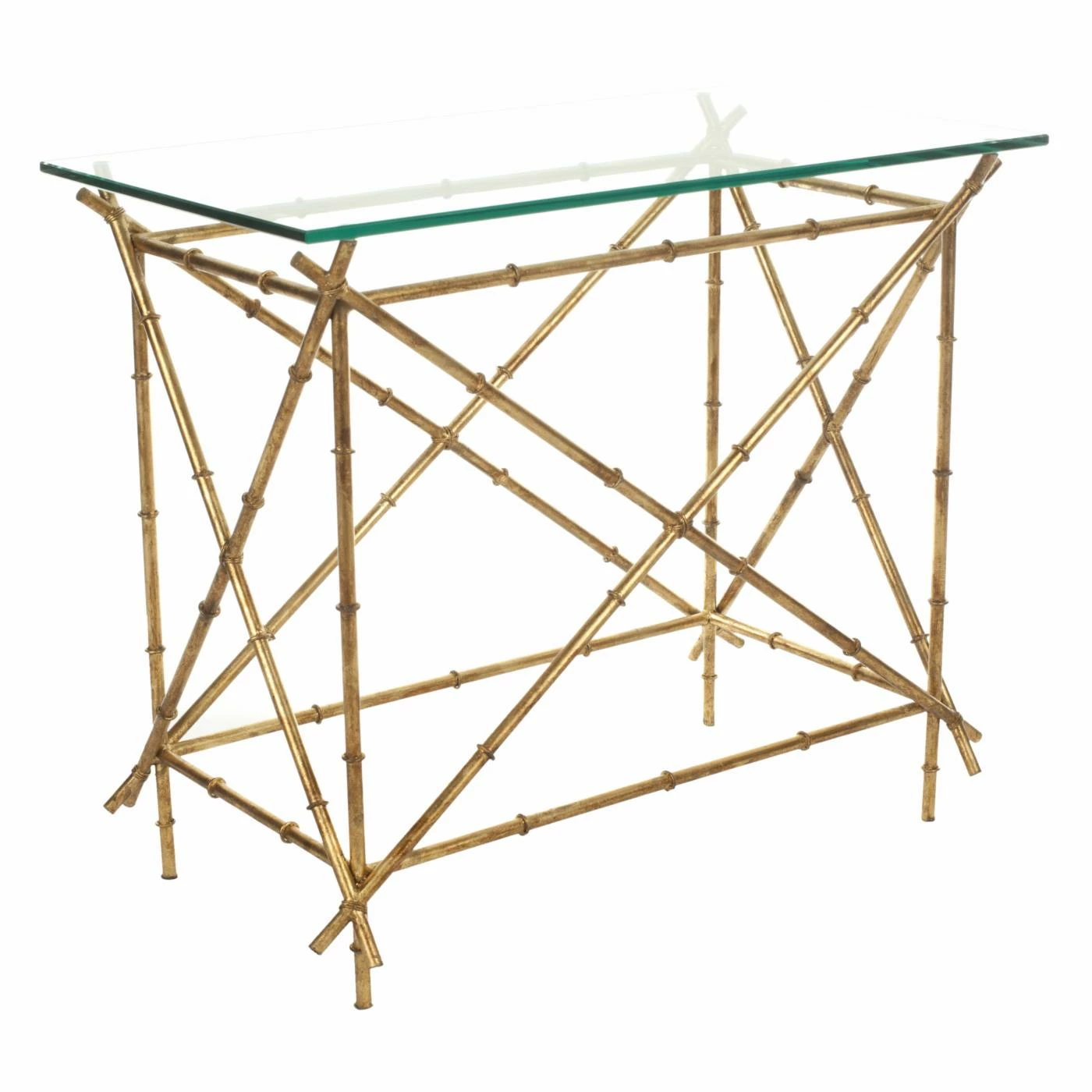 Crisscrossing stretchers and angled legs fashioned out of iron support the Safavieh Mark Crisscrossed Gold Accent Table. The iron is formed into the shape of bamboo reeds and finished in an elegant gold bronze patina for an exotic, regal look. A sturdy tempered glass top rests on the base.