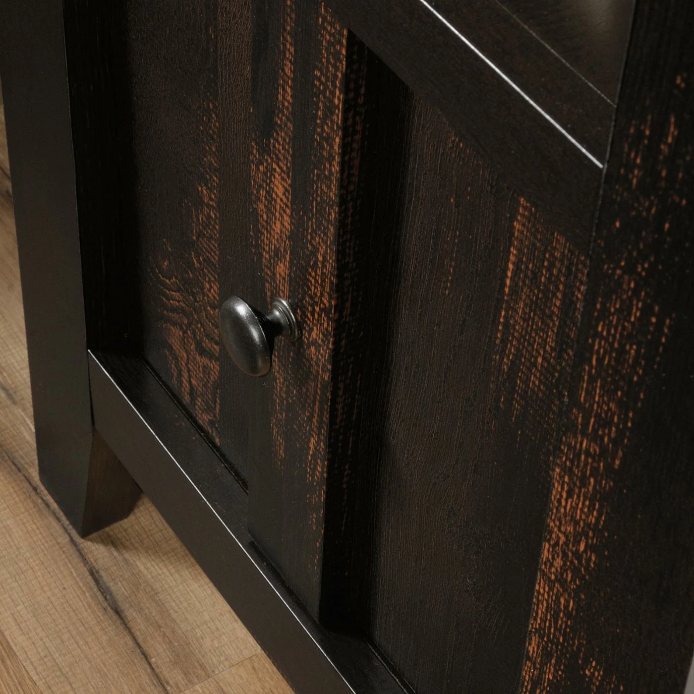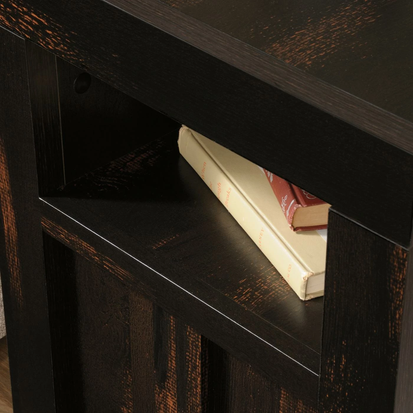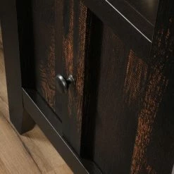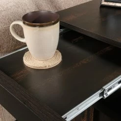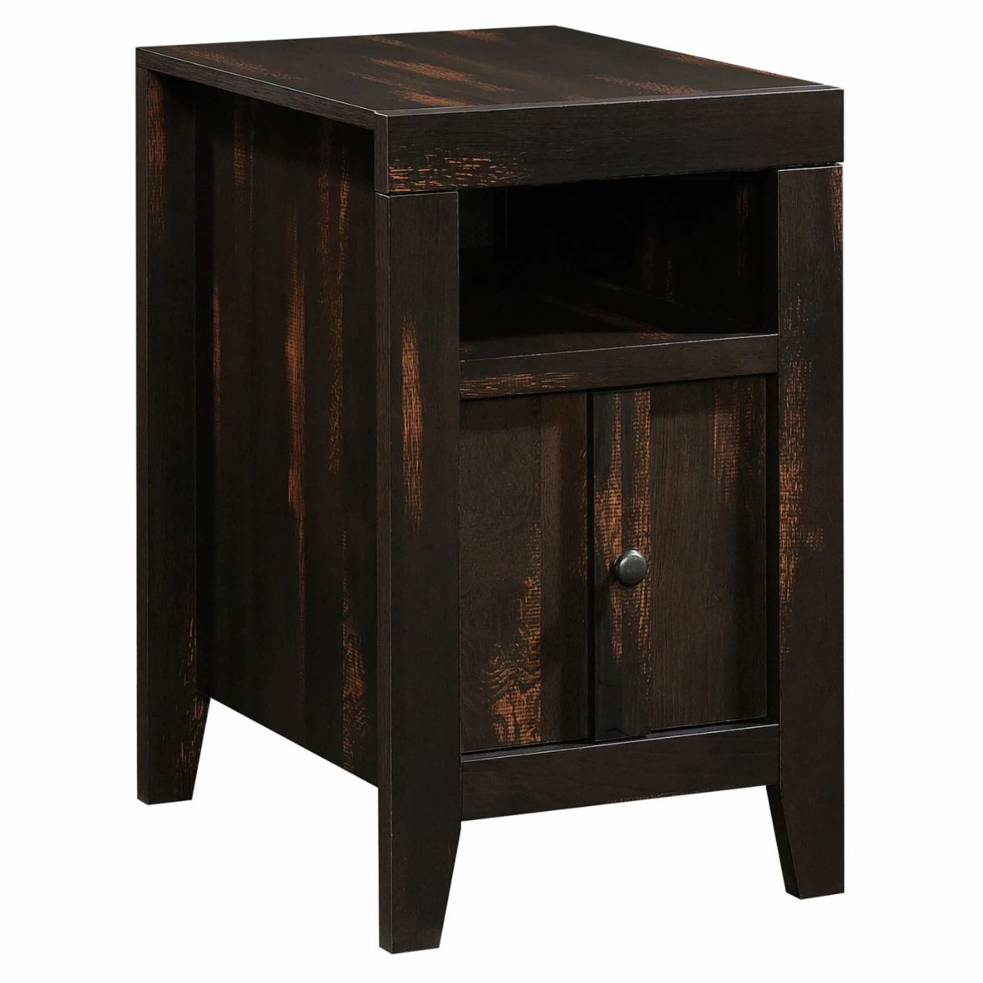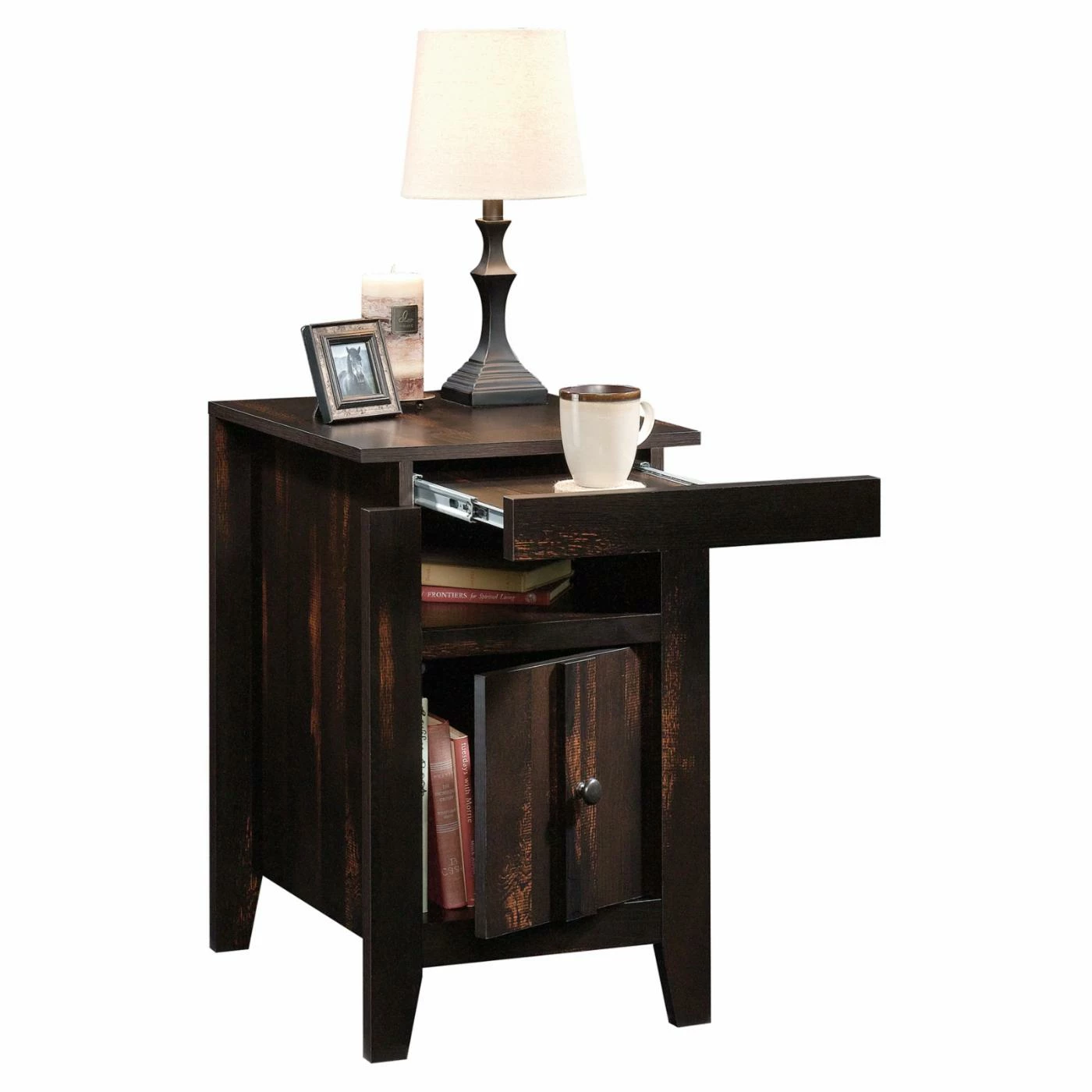 The Sauder Dakota Pass End Table lends your armchair or sofa a convenient companion with a lush modern design. This end table has a wide top, ideal for lamps, coasters, pictures, and more. A deep open shelf provides a handy place to keep reading materials and remotes while the single-door cabinet offers hidden storage. The door can be installed for either right- or left-side opening. Tough engineered wood constructs the frame, topped by a char pine laminate.