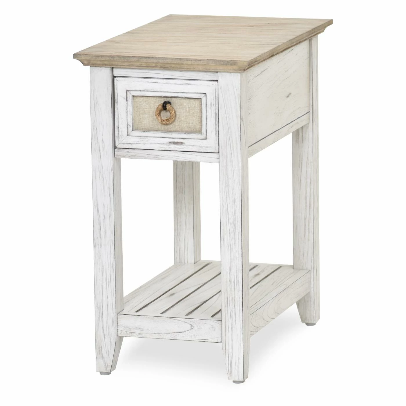 Even if you don’t want to rock the boat, the Sea Winds Captiva Island Chairside Table is here to make waves. This compact end table is perfect for homes decorated in a coastal style, and for anyone who wants just a little bit of the boardwalk in their living room. White weathered wood makes up the majority of this table with an unfinished, natural look for the tabletop. The Olefin fabric on the single drawer front is an eco-friendly, durable material that can stand up to the chaos of family life. A slatted shelf at the bottom of this end table is great for displaying ceramics or storing magazines, and the pull handle is made from heavy-duty rope for a fun, nautical detail. Some assembly required.