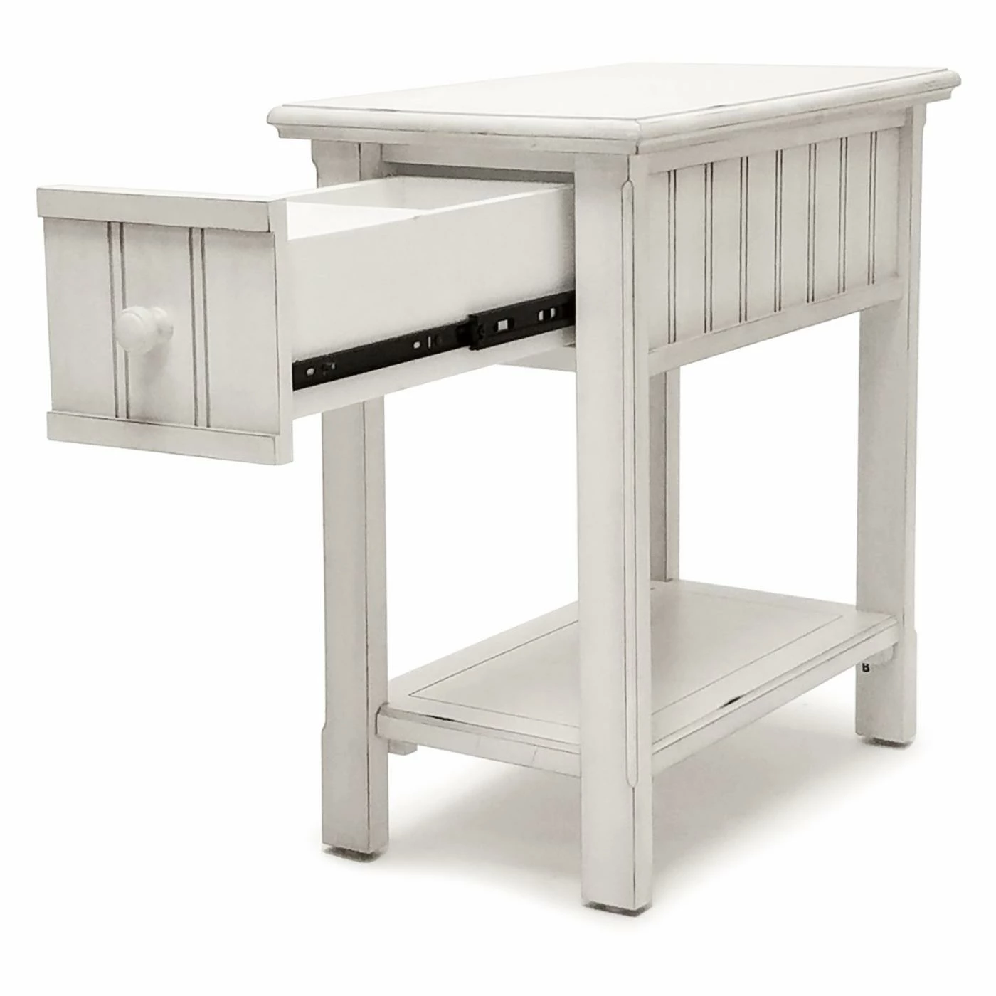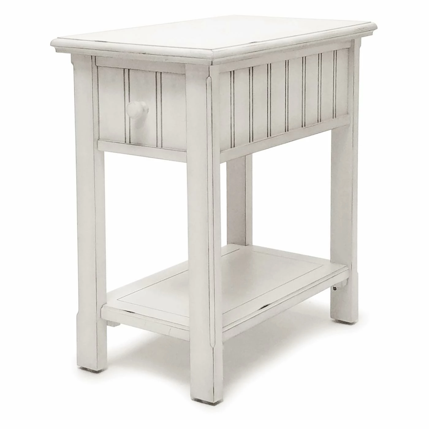 The Sea Winds Monaco Chairside End Table is a charming and easy-to-love companion piece to your bed or accent chair. Inspired by traditional styles, this table features chamfered legs, routed edges, and beadboard trim on all sides. A classic white finish with subtle distressing gives it the feel of a well-loved antique. The deep drawer slides out smoothly on metal extension guides. The drawer interior is divided and fully finished, making it the perfect place for remotes, chargers, or any of the other things you like to have at hand.