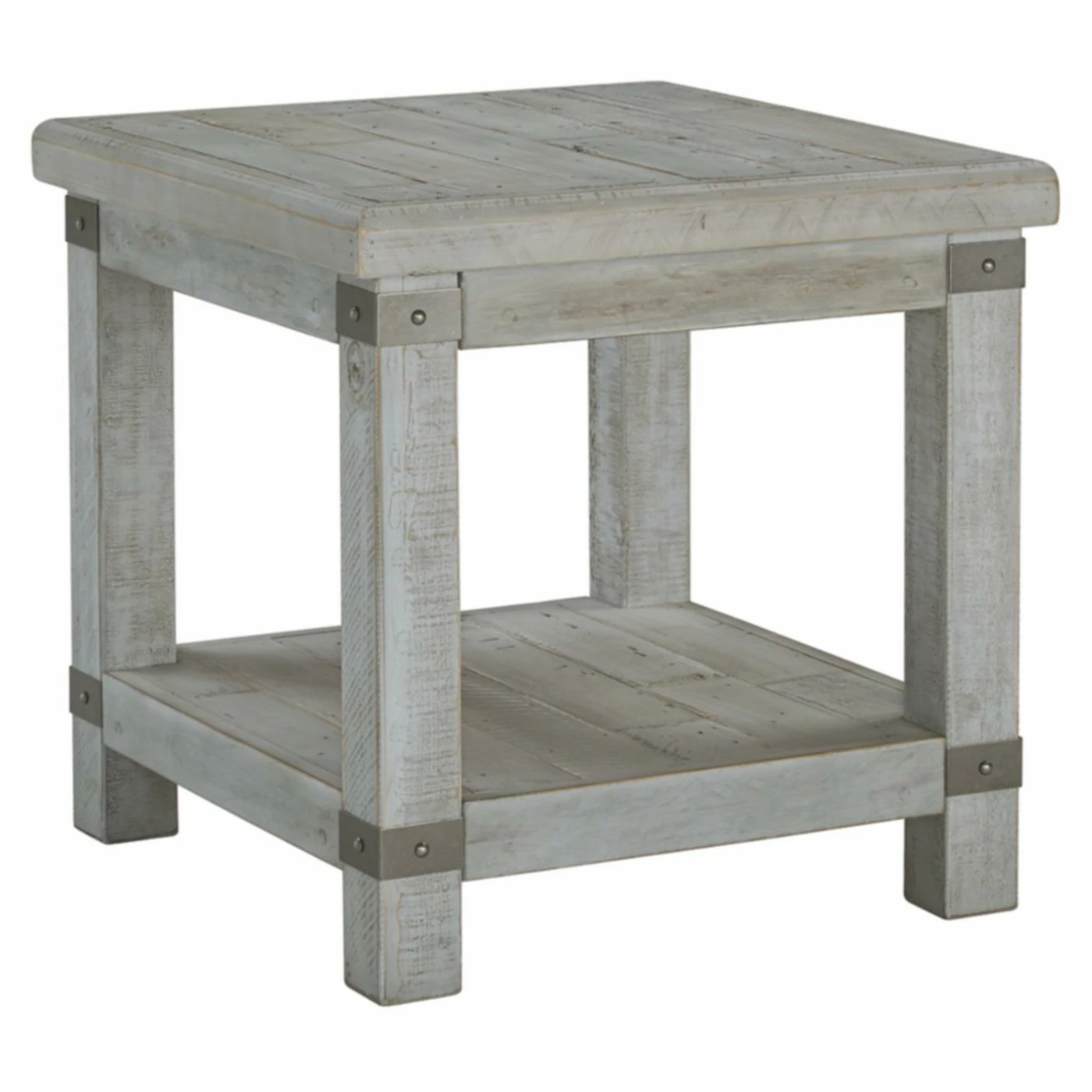 Stick to your green principles by completing your farmhouse dΓ©cor with the Signature Design by Ashley Carynhurst Rectangular End Table. Built out of reclaimed solid pine wood, the table is sustainable and has a one-of-a-kind, weathered character. Metal corner brackets add to the rustic appeal of the gray-washed piece. You can keep items neatly stored or on display on the open shelf in the base.