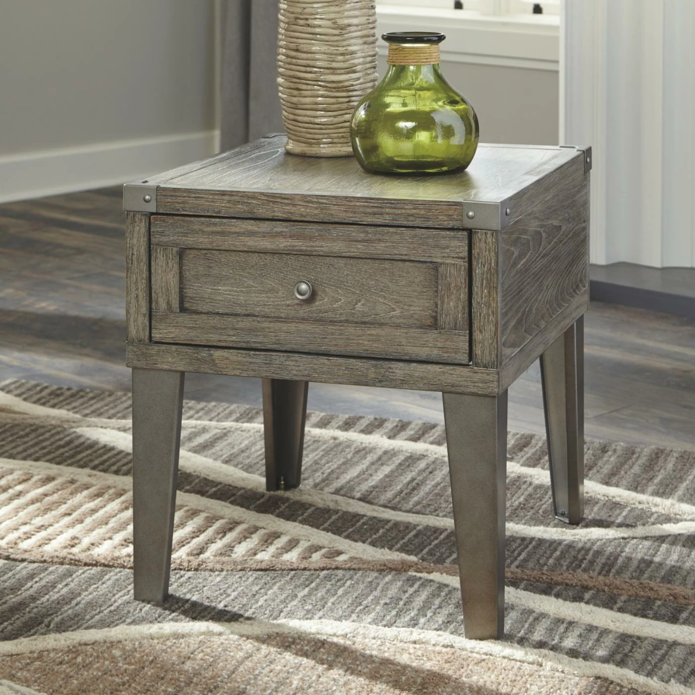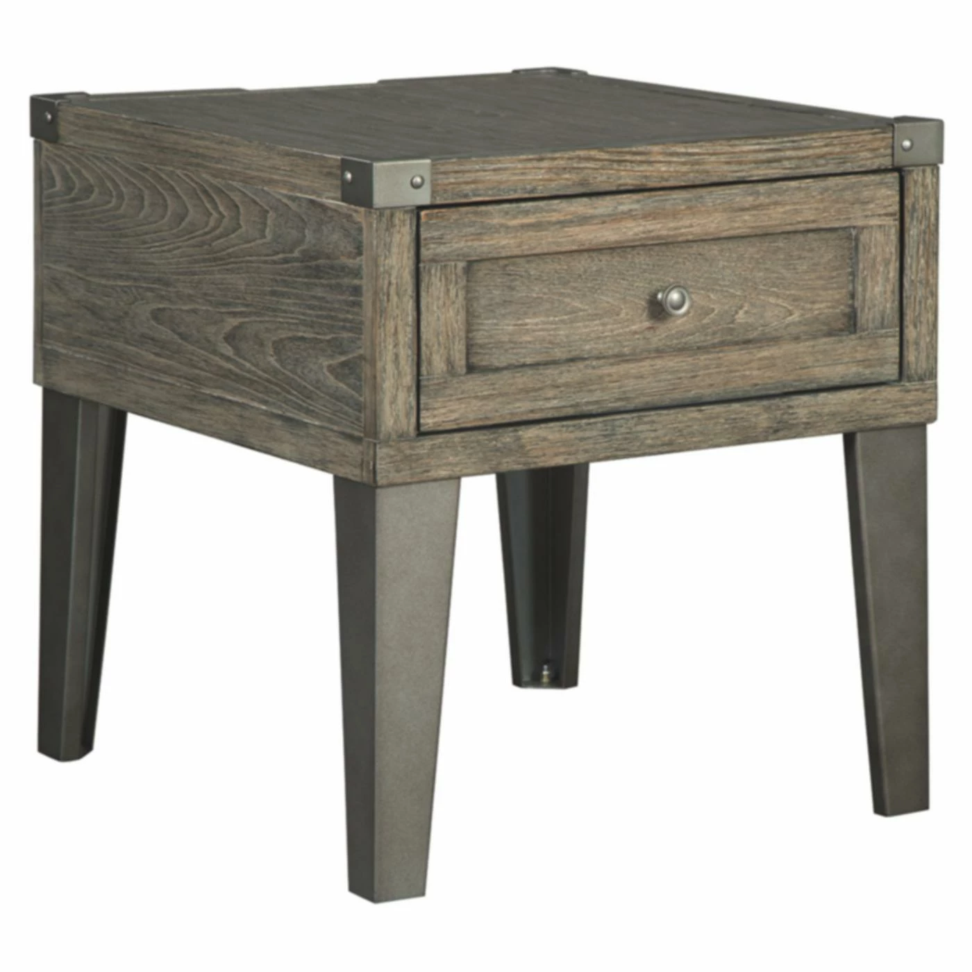 Standing on silver metal-tone legs and embellished with matching riveted brackets, the Signature Design by Ashley Chazney Rectangular End Table with Drawer adds industrial appeal to seating areas. The body of the end table is durably crafted out of solid and engineered wood and finished with rustic brown ash veneers. One smooth-gliding storage drawer lets you stow remote controls, reading materials, and other small items.