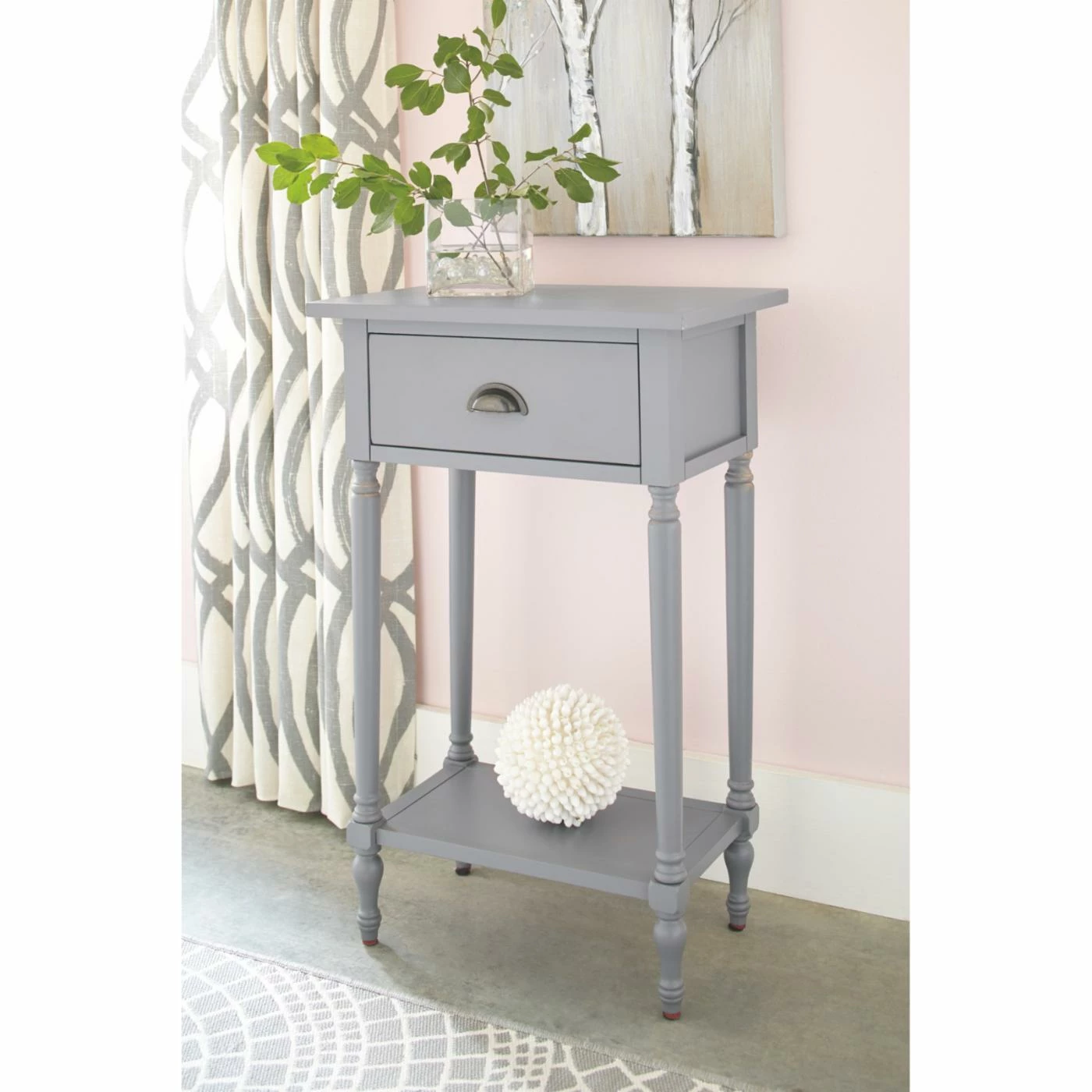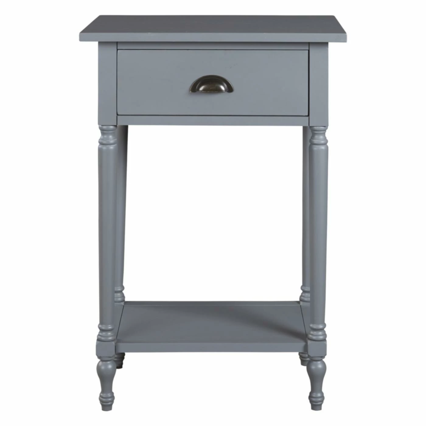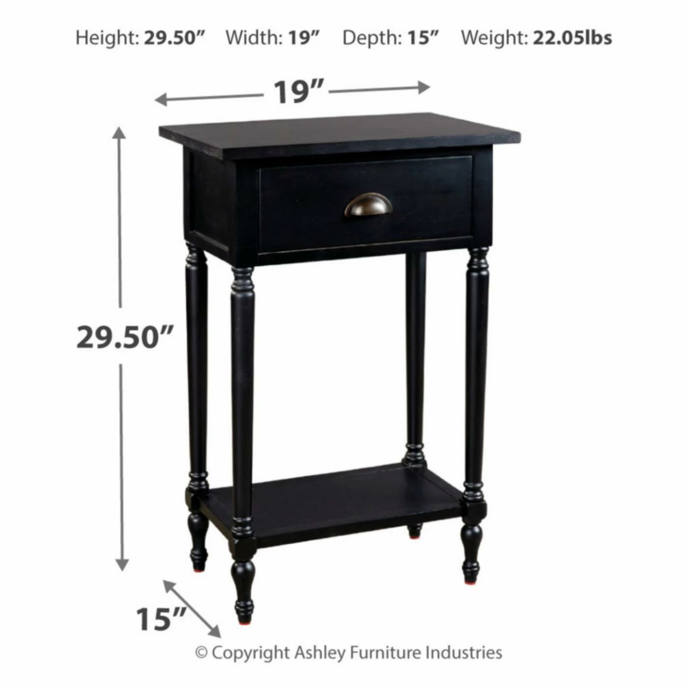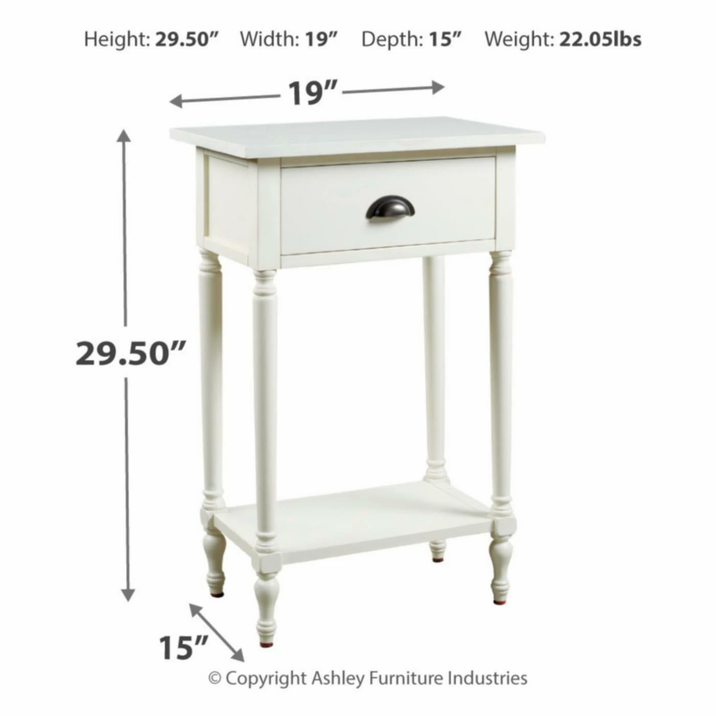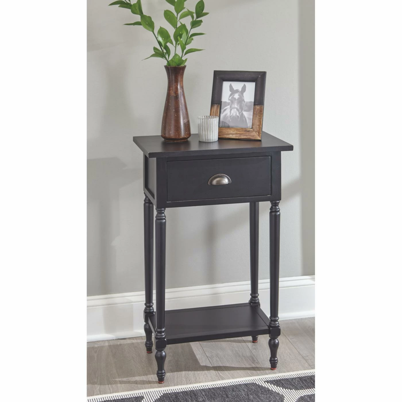 Turned legs and a framed drawer front contribute to the Signature Design by Ashley Juinville Accent Table being a classic charmer. This accent table’s veneers, solid, and engineered wood construction is topped in the available finish of your choosing for the ideal complement to your home. Its smooth-gliding drawer is equipped with an antique bronze cupped drawer pull to echo the elegant lines of the piece. A lower shelf can be home to books, vases, or whatever your heart desires.