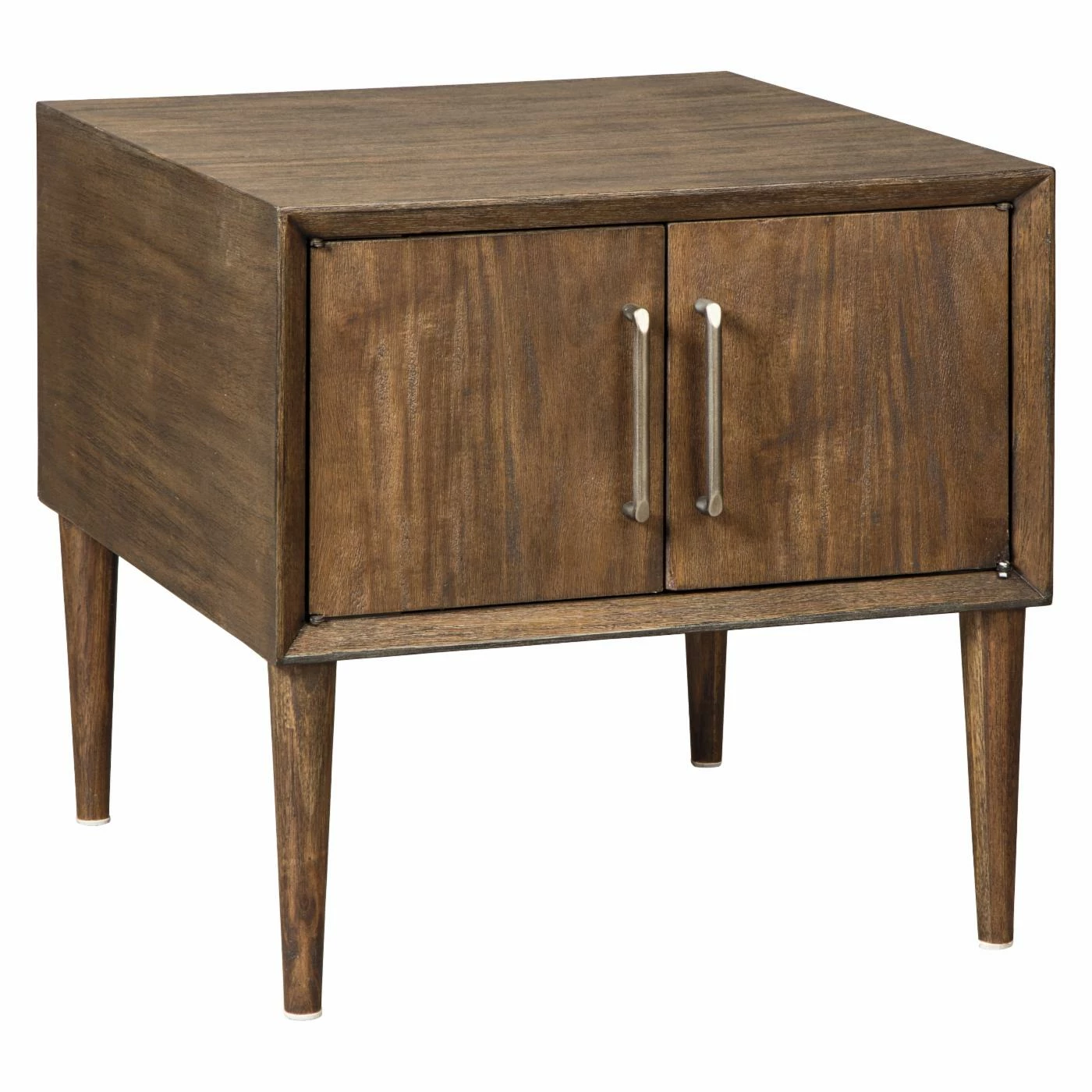 Inspired by mid-century modern design, the Signature Design by Ashley Kisper Square End Table will add retro charm to your seating area. Two doors swing open to reveal a large compartment with plenty of storage space and are equipped with aged pewter hardware for a touch of antique elegance. Fashioned out of veneers, engineered wood, and solid wood, the end table shows off an appealing woodgrain and is resistant to wear and tear.