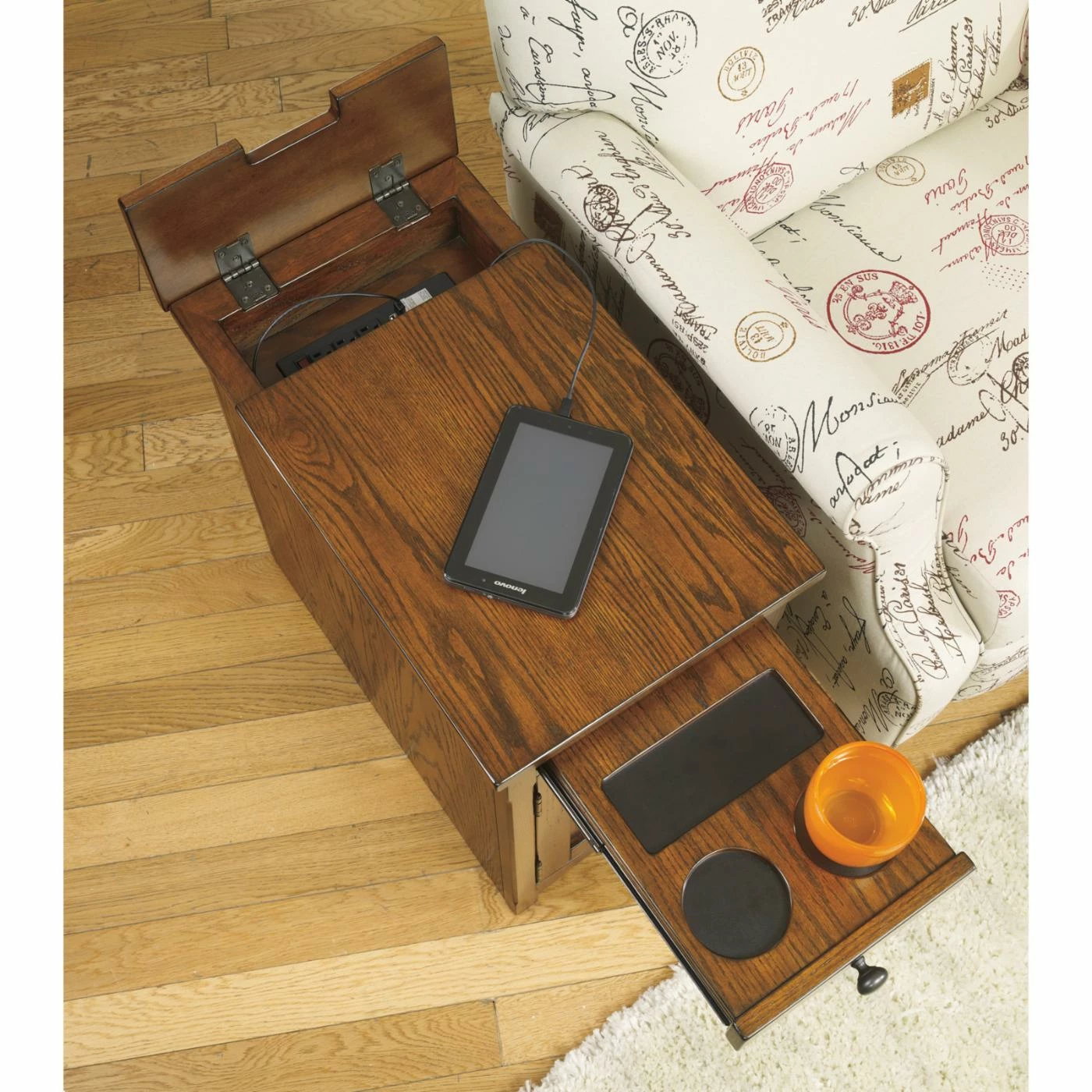 The Signature Design By Ashley Laflorn Oak Power Chair Side End Table showcases a cozy traditional design that is sure to please. With plenty of storage options for your necessities, this end table updates your living setting with ease. By lifting the flip-top, it reveals a power strip with 3 AC ports which functions perfectly for your electronics. A pull-out tray with remote cubby is placed in the front along with hidden storage behind the front door. Last but not least, a magazine file is placed in the back to keep your favorite reading essentials on hand. Clean straight lines create visual appeal of this oak veneer and hardwood solids crafted piece. Adding the finishing touches to this end table are its vintage casual burnished oak finish and industrial looking hardware in a dark burnished color.