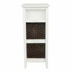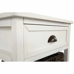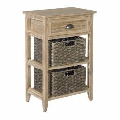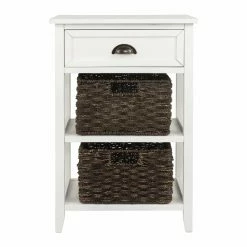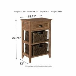 The quaint and cozy look of the Signature Design by Ashley Oslember Accent End Table is nice, but the versatile function of this piece will make it well-used part of your daily routine. This farmhouse-inspired design is crafted from a mix of solid hardwood and engineered wood with a distressed, painted finish. The lower two shelves come equipped with woven baskets that can hold anything from towels to tools. A single drawer gives you more storage, completing the shape of what’s going to be a part of your active yet charming space. Choose from available finish options.