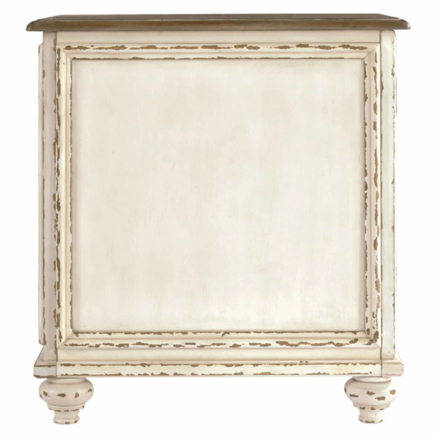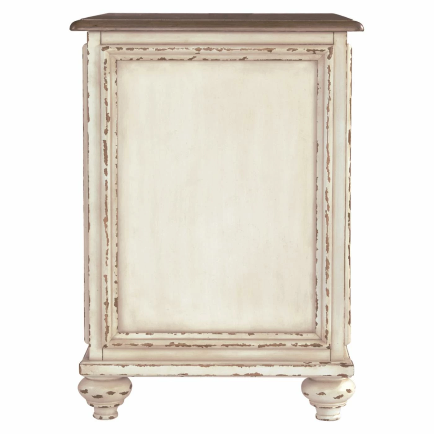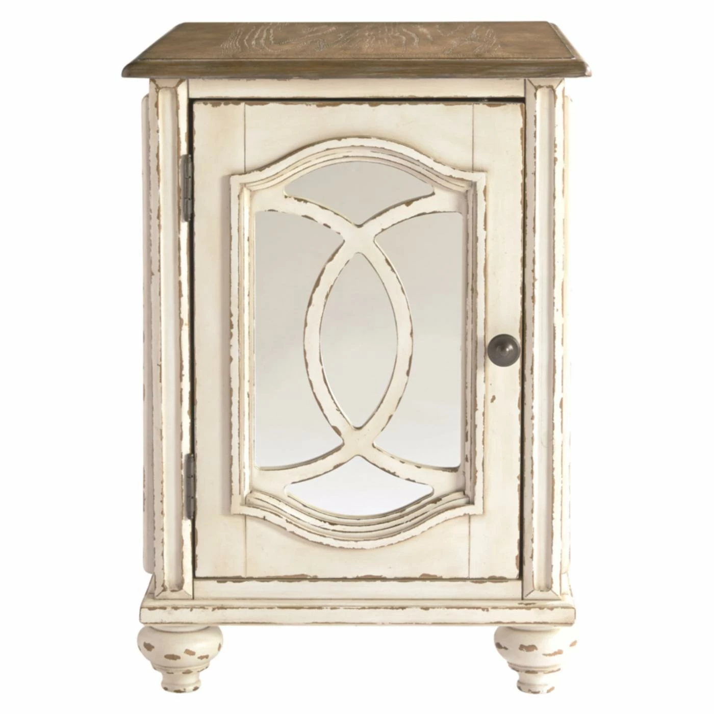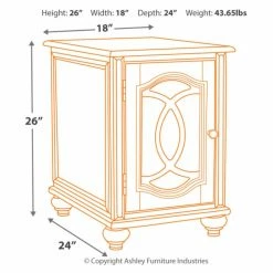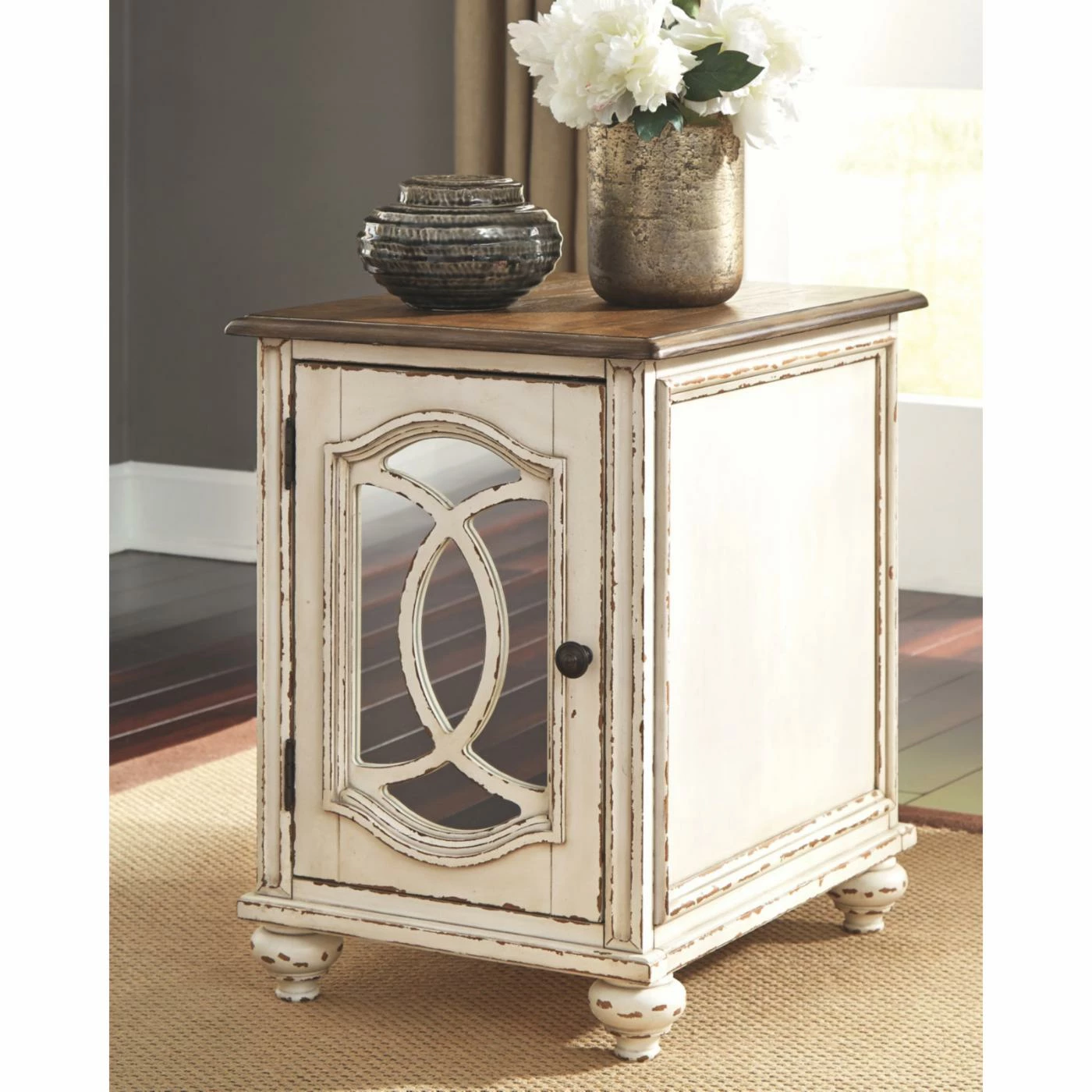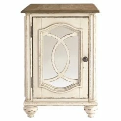 Enhance the elegance of your traditional living room with the Signature Design by Ashley Realyn Chairside End Table. This end table features a mirrored door that opens to reveal a single storage shelf. A brown and white two-toned finish with light distressing gives the table a loved-over-time appearance.