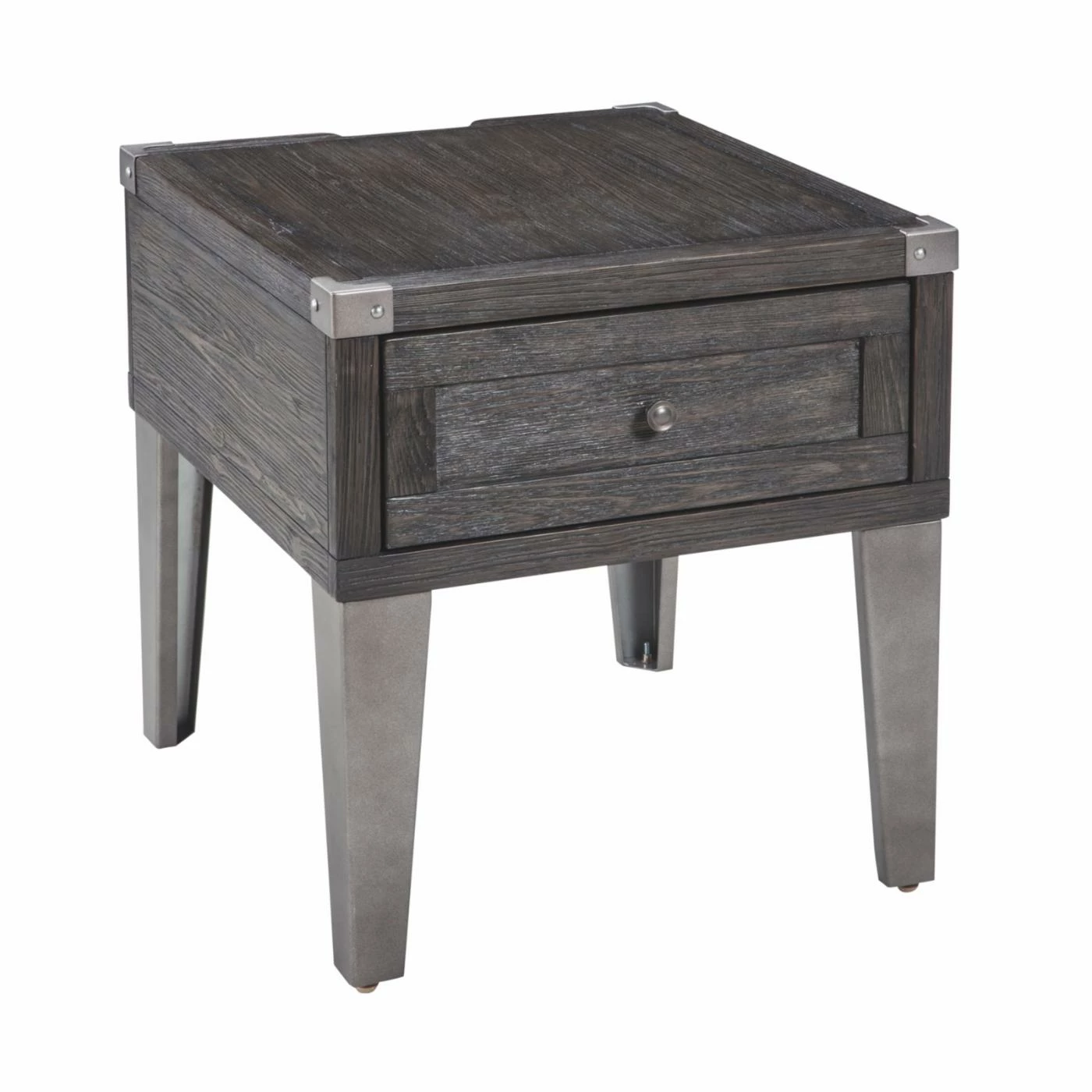 The Signature Design by Ashley Todoe End Table brings industrial-chic elements into your modern home. Canted metal legs support this unique piece and complement to the weather-washed gray pine wood and veneer finish. Metal corner accents and a metal knob complete the look of this mixed construction that marries rustic elements with industrial sensibilities. A single smooth gliding drawer offers storage, but the highlight of this piece is the dual power outlets and dual USB ports, boasting convenient charging for all of your devices.