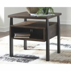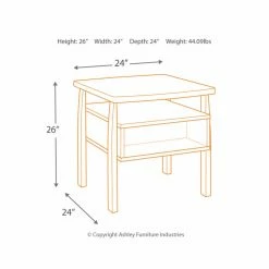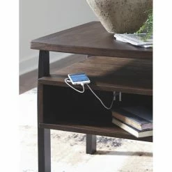 A winning feature of the Signature Design by Ashley Vailbry End Table is the open box storage that appears to be floating between the gently curved legs. At the back of the shelf, a power outlet and USB port offer convenient charging for your devices. Constructed of veneers, wood, and engineered wood, this sleek, square end table is finished in a grayish brown hue that coordinates with an array of palettes.