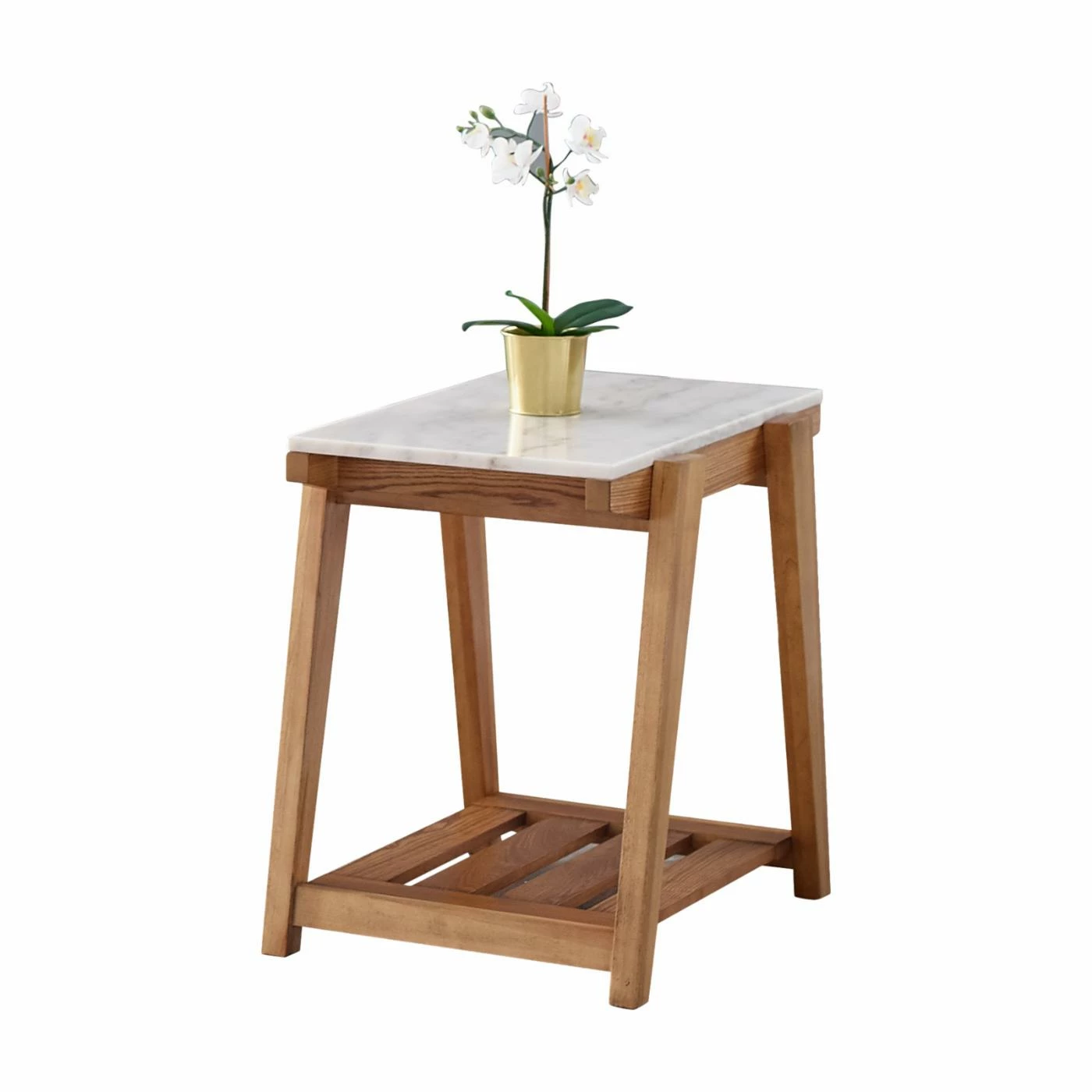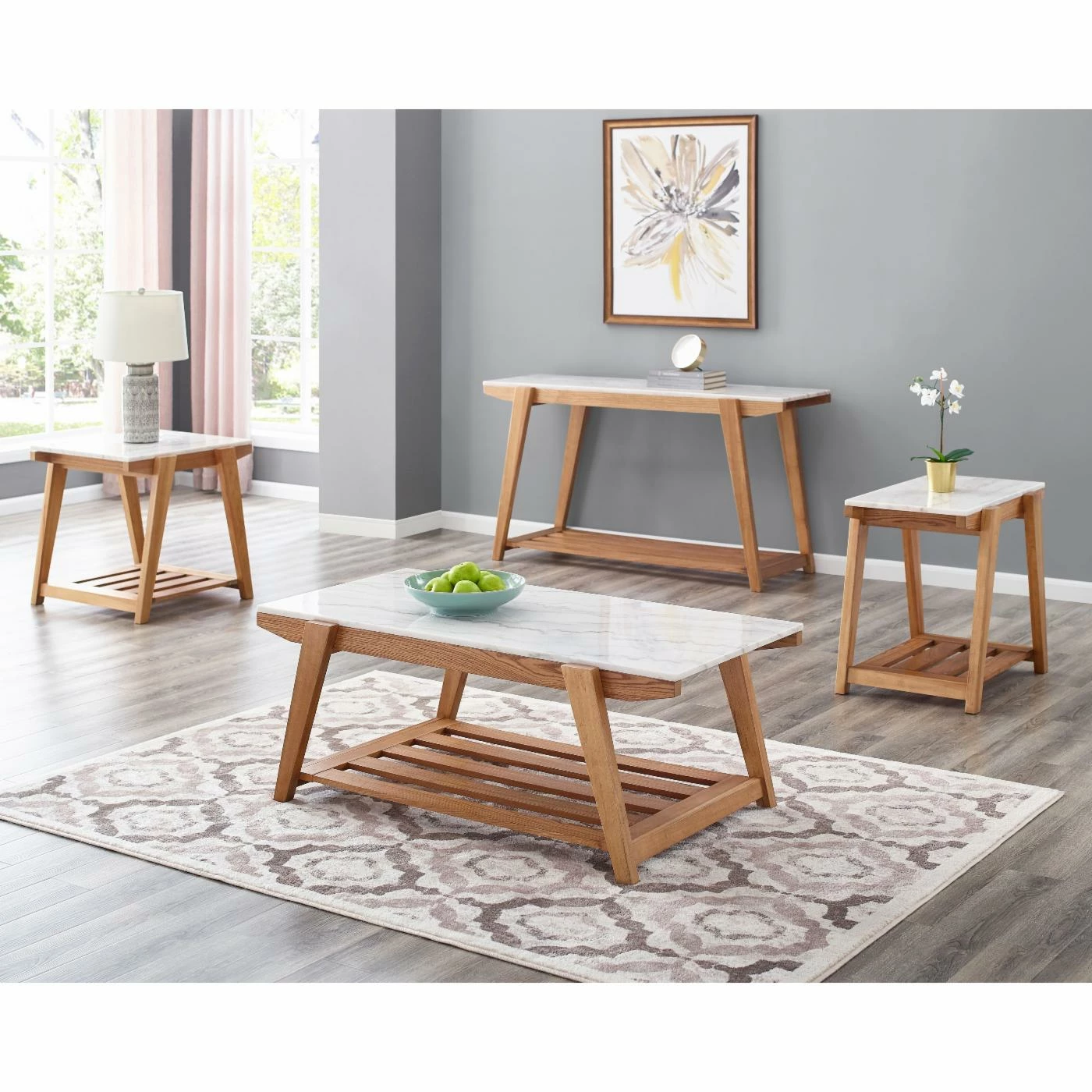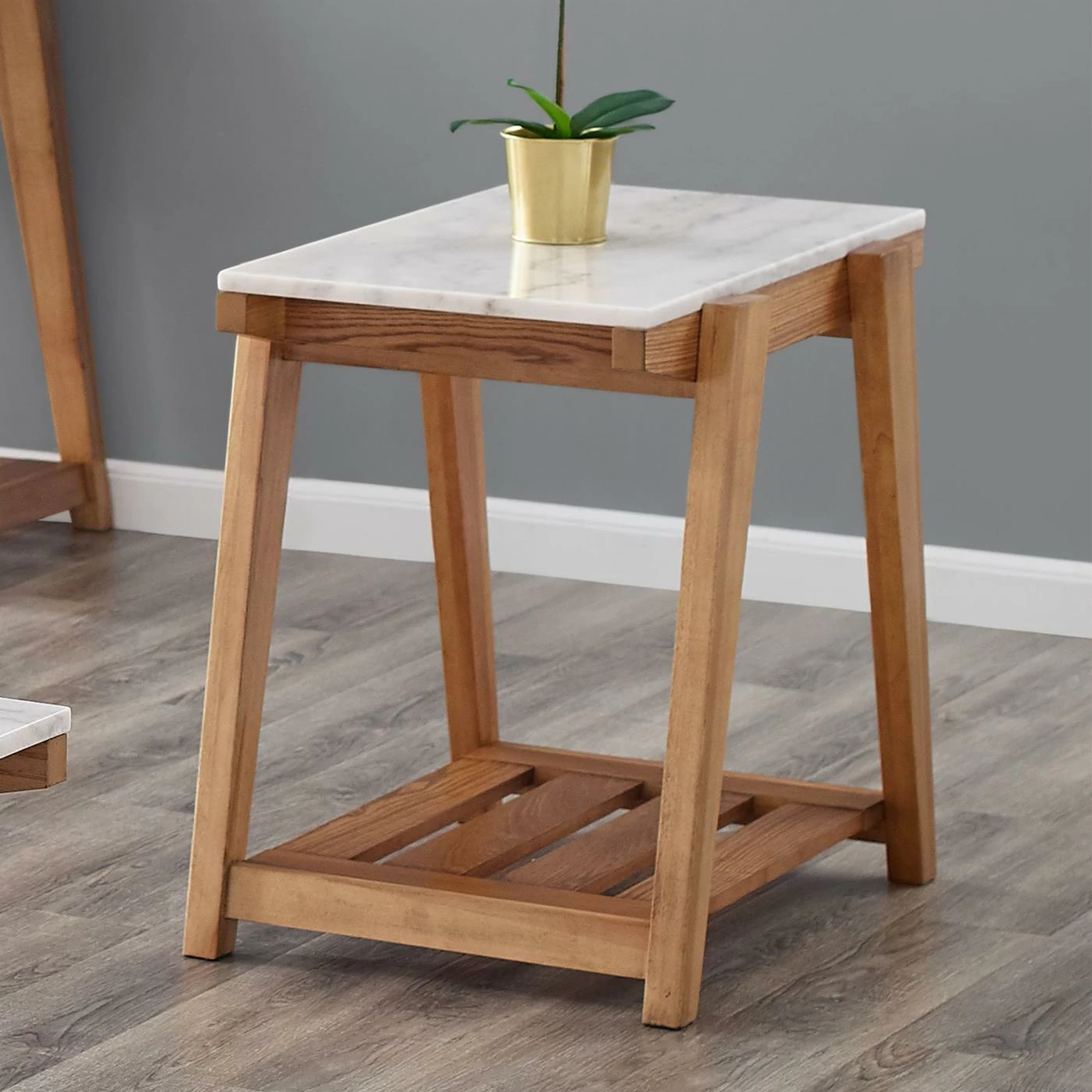 Clean lines and contrasting finishes give the Steve Silver Co. Celeste Marble Top Chairside End Table modern appeal. This end table features a birch veneers and hardwood solid base that sports a warm natural hue. The warm finish of the wood is becomingly paired with a white marble top with mineral accents. Canted legs and a slatted bottom shelf lend further fetching function to the design.