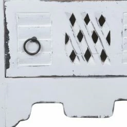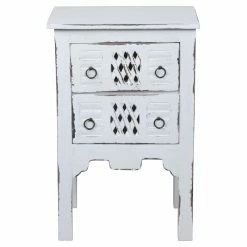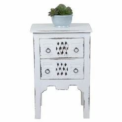 Whether used as a nightstand in the bedroom or a side table in your entryway, the Sunset Trading Shabby Chic Cottage Whitewashed End Table makes it easy to add a hint of vintage charm to your space. The solid mahogany wood is finished in a distressed whitewash, and the drawer fronts feature louvered, latticed fronts. Drawer stops for safety and iron ring pulls in an antique brass finish round out the design. The end table includes an anti-tip kit as well as floor protectors. Slight variations in finish, wood grain, and size may occur. This end table arrives fully assembled.