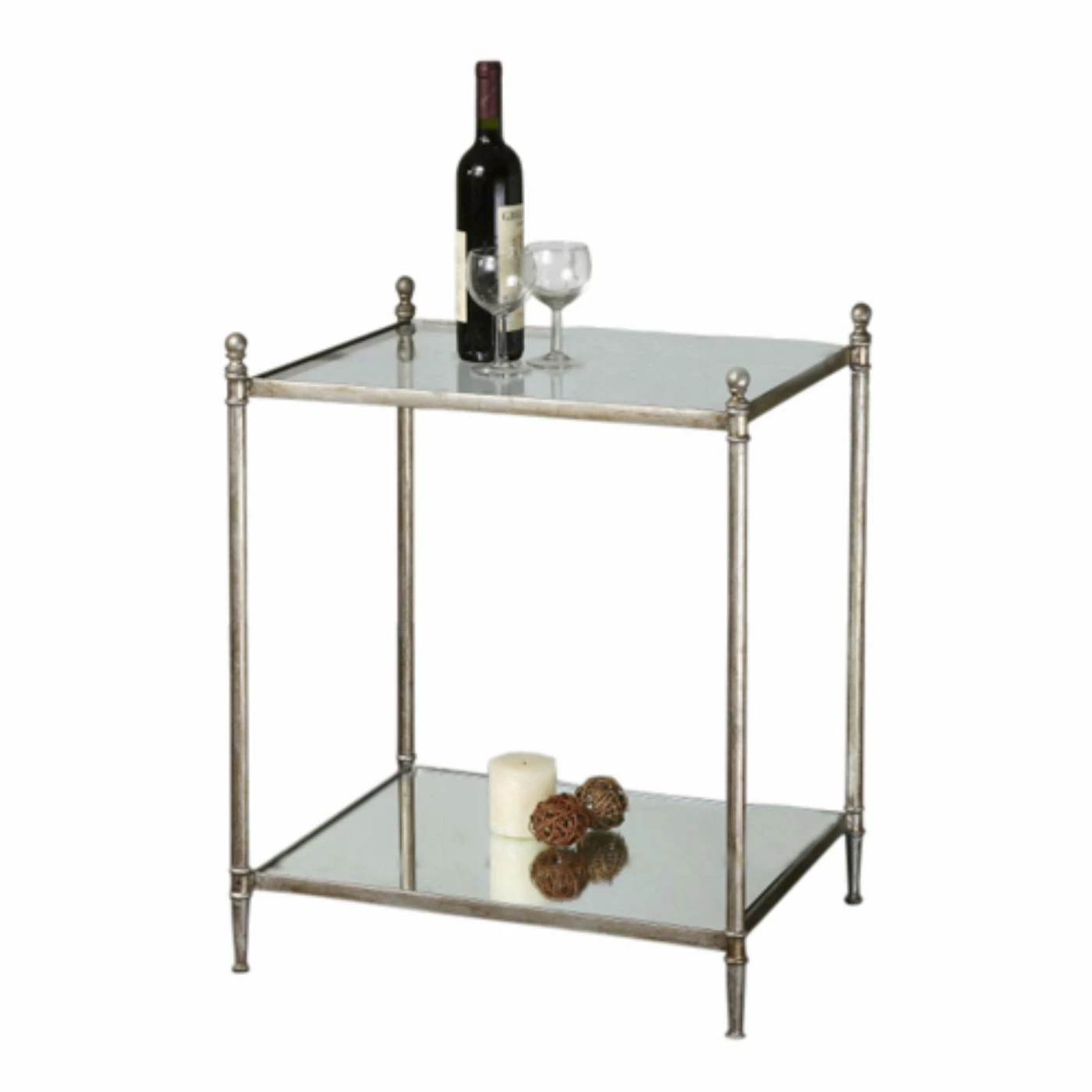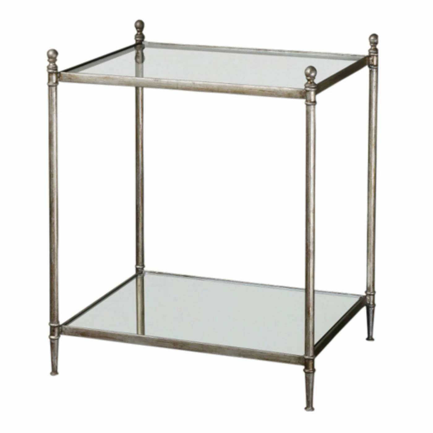 The Uttermost 24282 Gannon End Table has simple yet stylish contours to accentuate your home. Bound to catch a minimalist’s eye, it has a forged iron frame with an attractive antique finis. Reflecting your exquisite tast, it’s a welcome addition to any home. This end table is further visually enhanced with its clear, tempered glass top and mirrored gallery shelf.