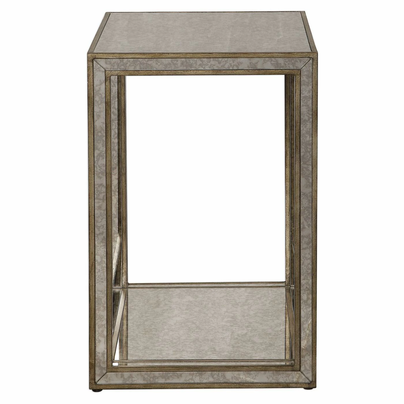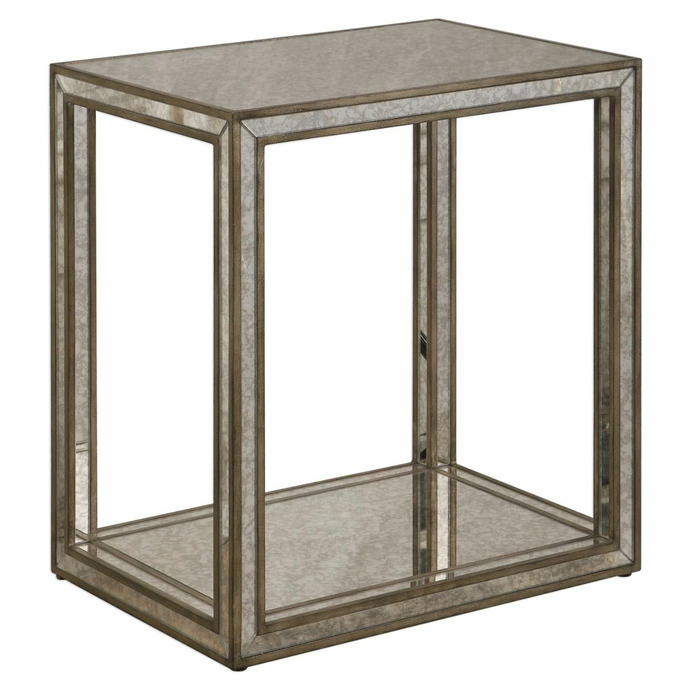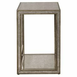 Bright mirrors accent the Uttermost Julie Mirrored End Table with chic allure. This sturdy table features a strong frame of compressed wood. A lower shelf gives you space to keep your favorite books on hand, or add an eye-catching decor element.