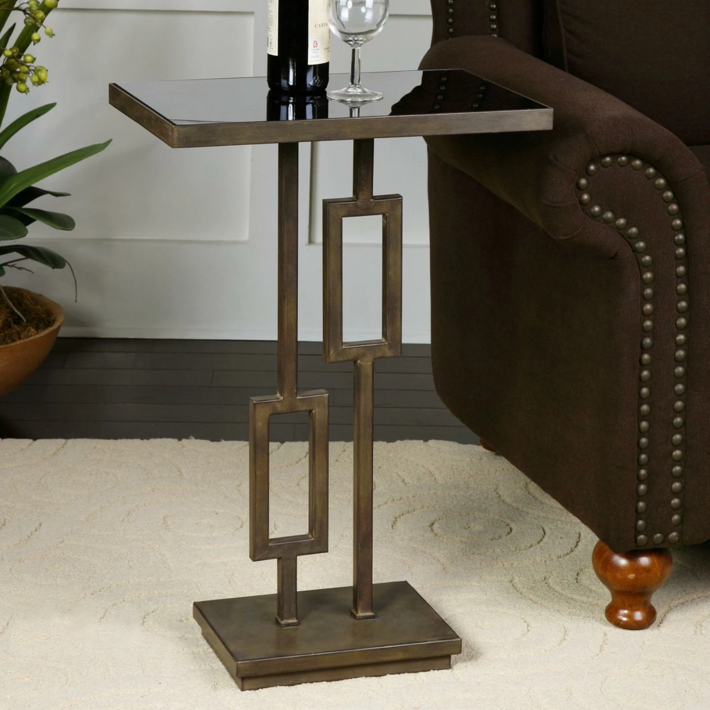 The Uttermost Rubati Accent Table showcases a contemporary, geometric shape and rich patina. Designed by Matthew Williams, this inspired iron table gives your decor a modern update with its clean lines and bold color. The table is finished in a deeply tarnished silver with hints of dark bronze and an inset tabletop of sleek black glass.