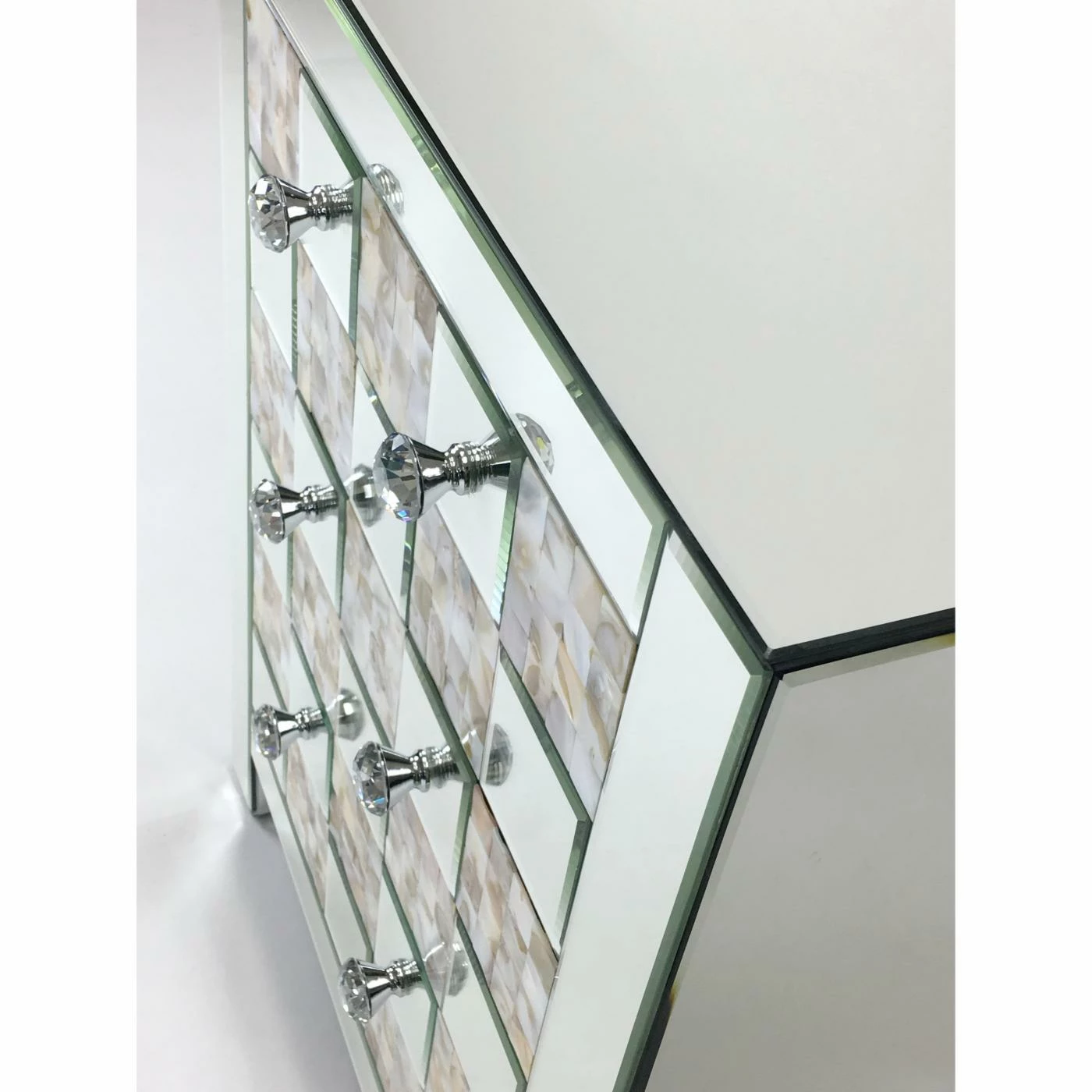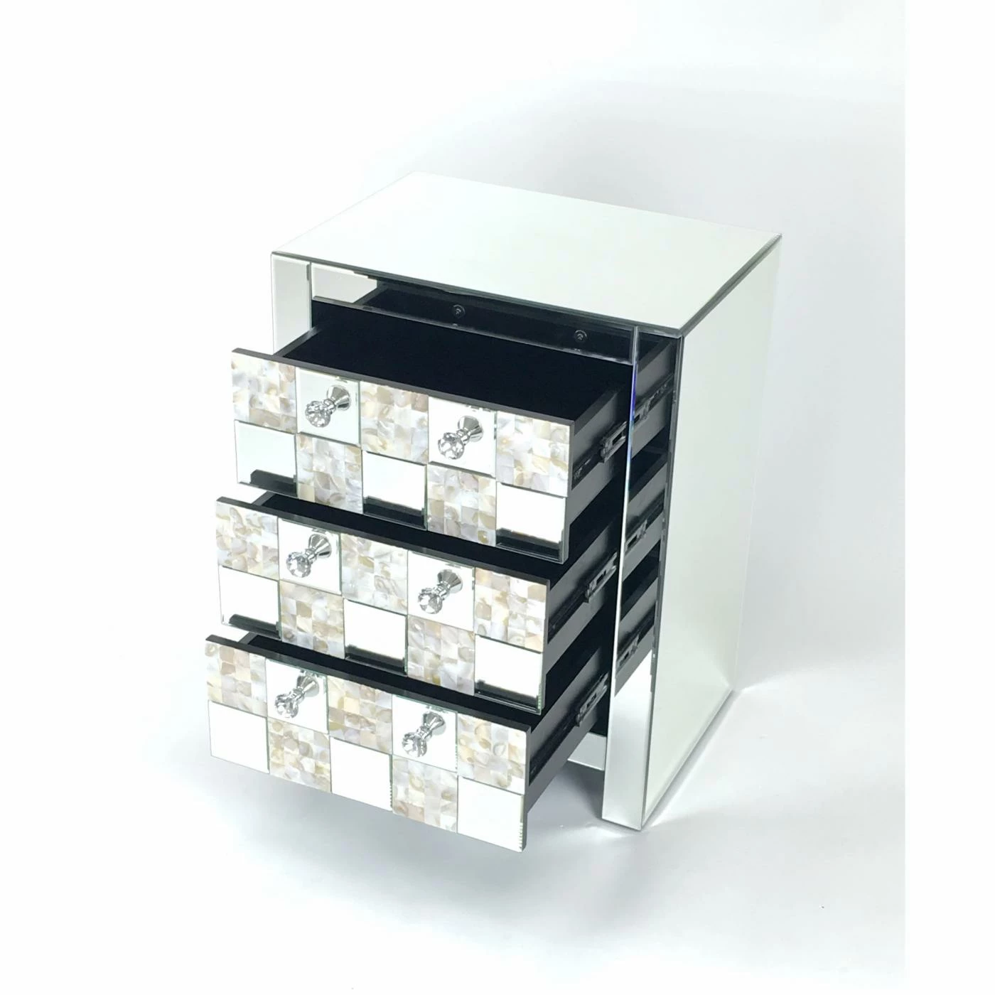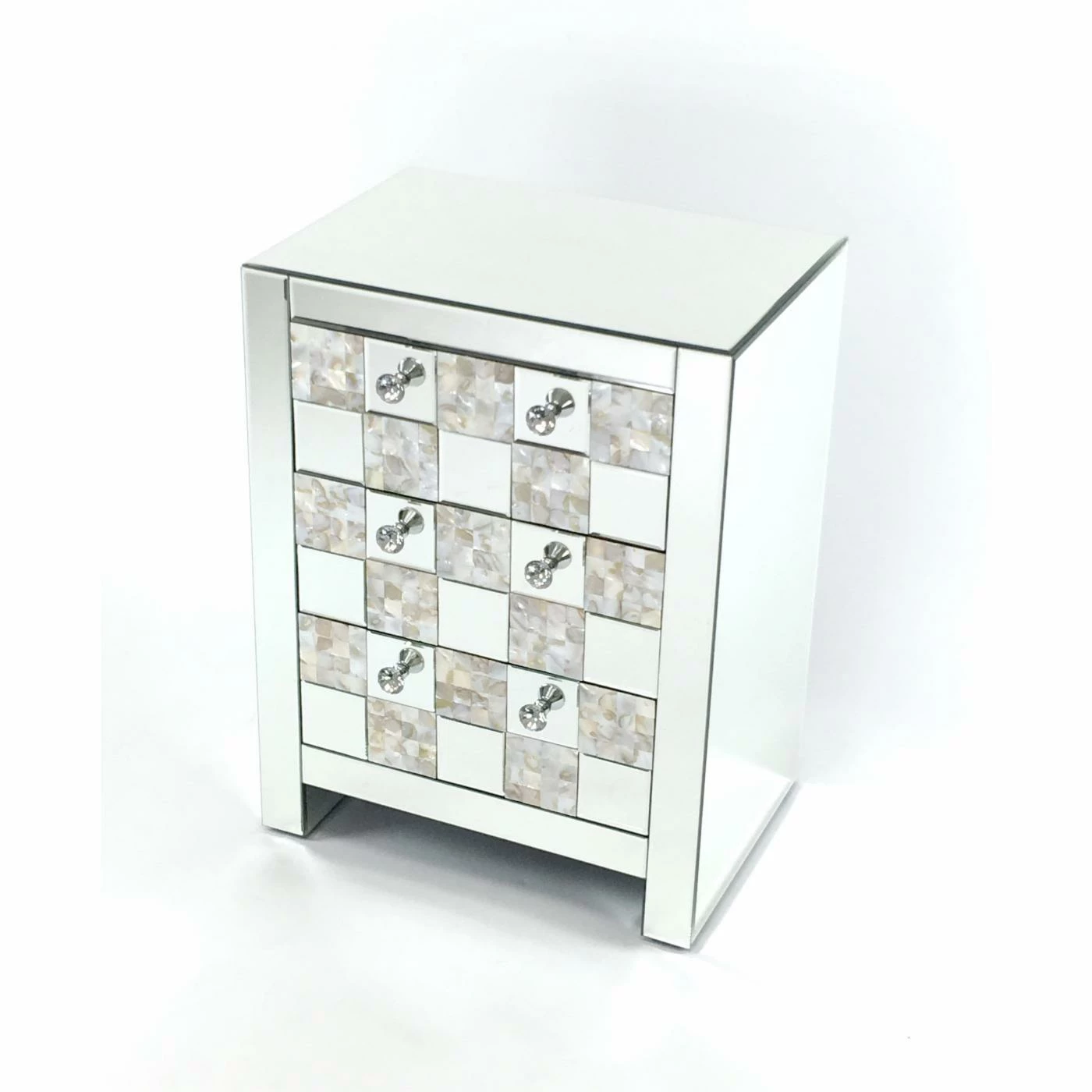 Add a modern touch to your space with the Wayborn Beveled Mirror Drawer & Chest. This chest showcases dazzling beveled mirror accents, crystal hardware, and three drawers for convenient storage.