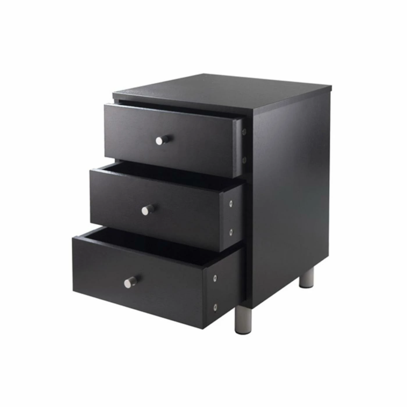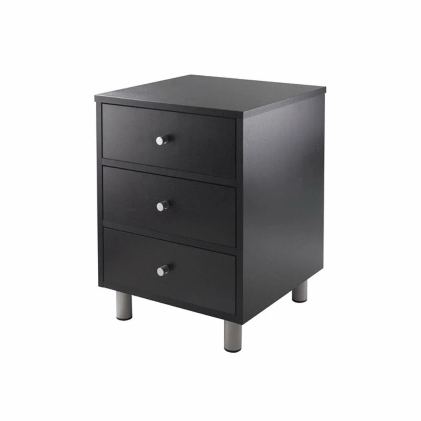 The short rounded legs of this Winsome Daniel 3 Drawer Accent Table give it a quirky modern profile that stands out from the usual black wood furnishing. Its three pull-out drawers with cylindrical nub handles offer unexpectedly spacious storage for a bedroom or living room accent piece.