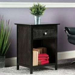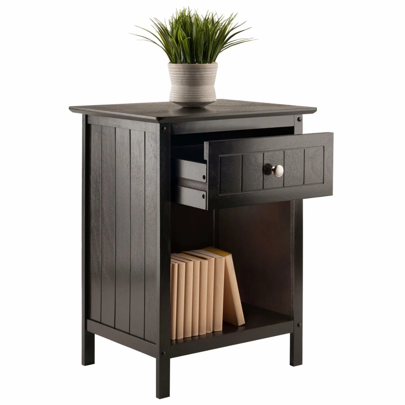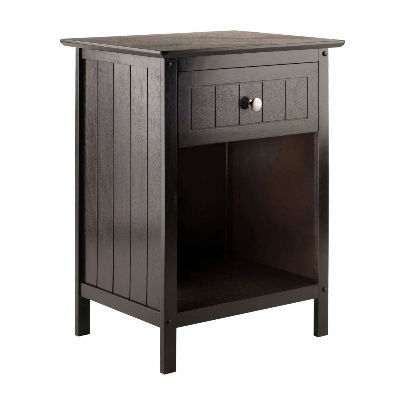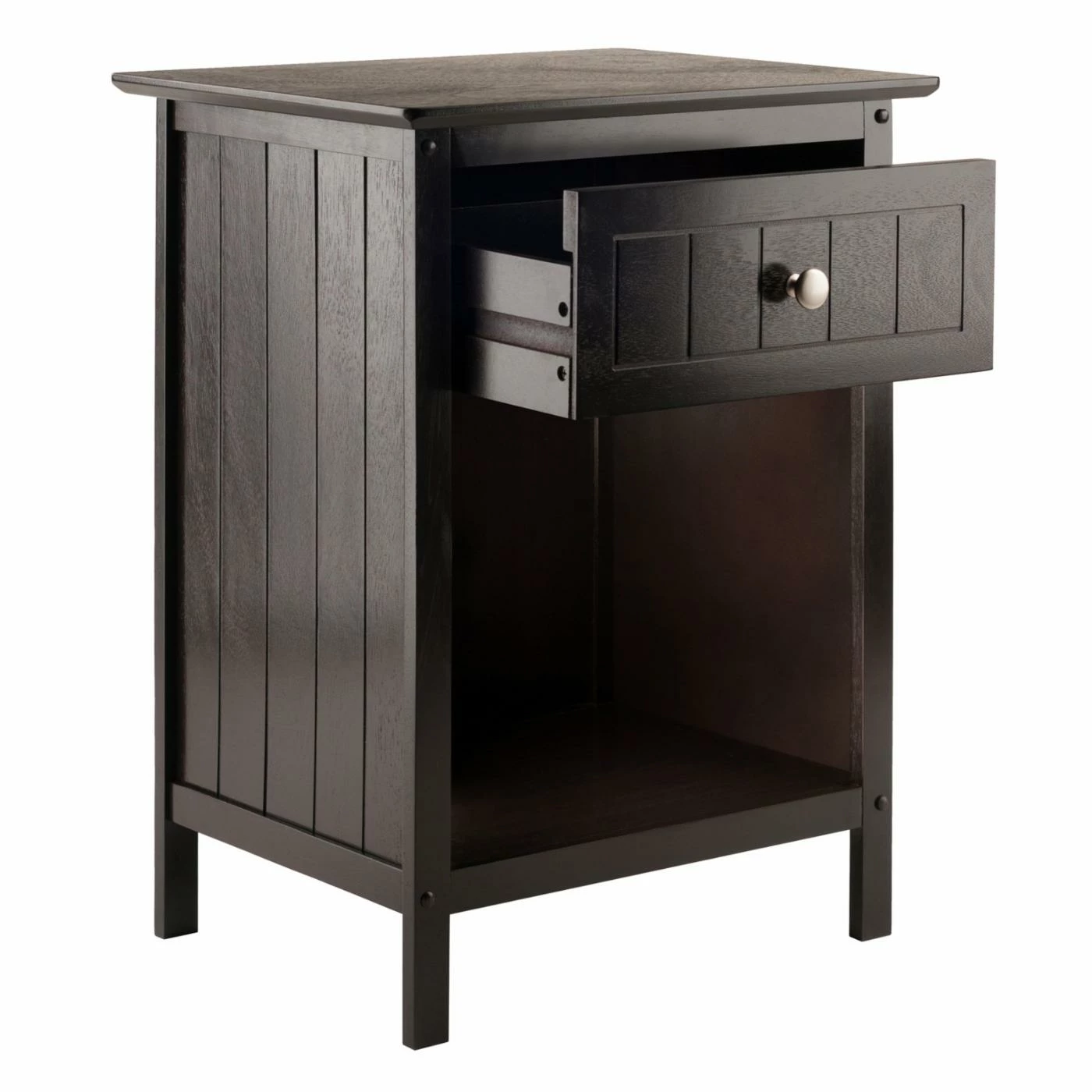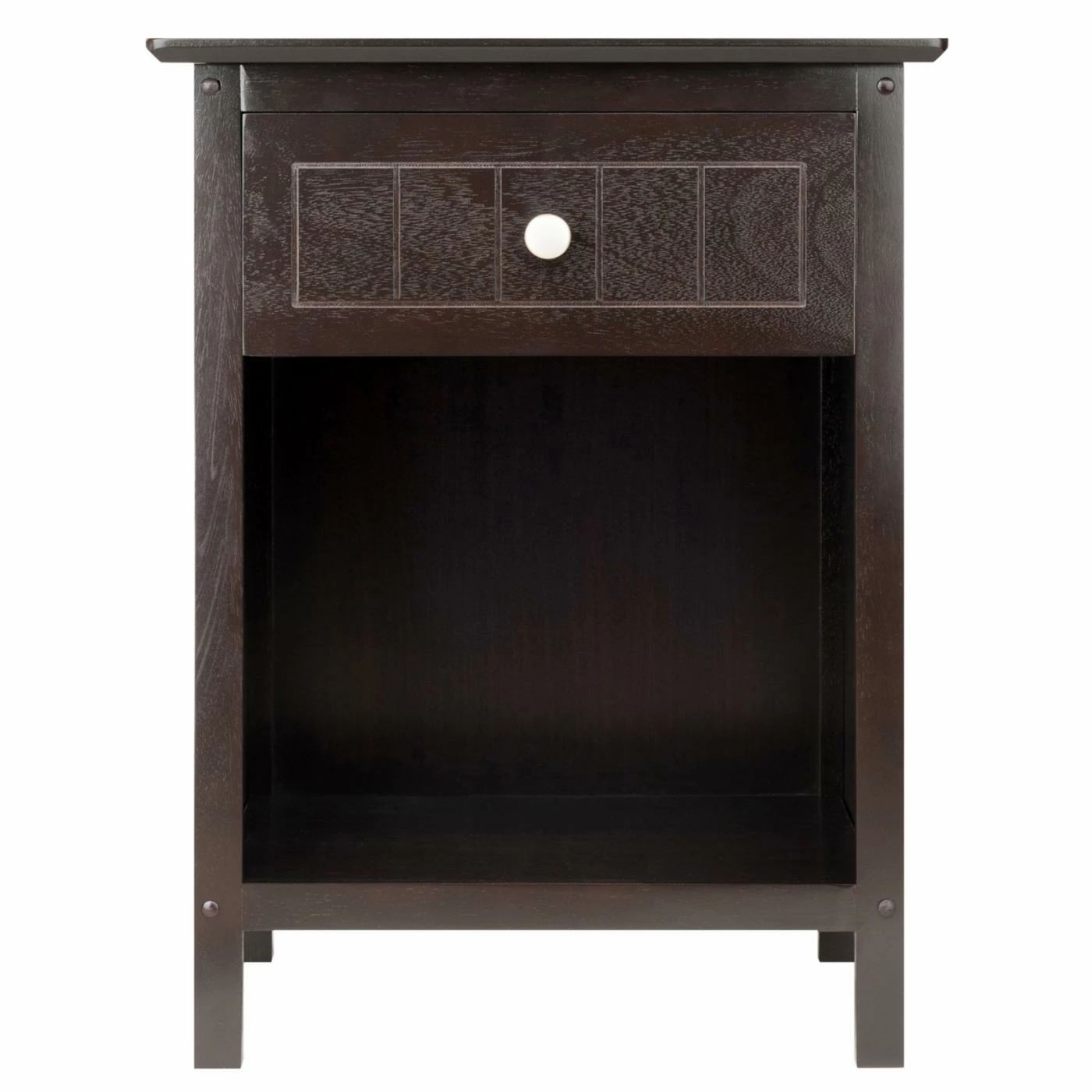The perfect blend of style and function, the Winsome Trading Blair 1 Drawer Accent End Table features a classic design with one drawer and one open shelf. Featuring wood and engineered wood construction, this end table includes wainscoting side panels and a simple round drawer pull. A rich espresso finish completes the traditional look.