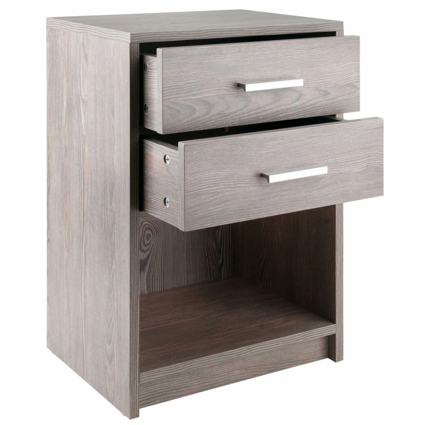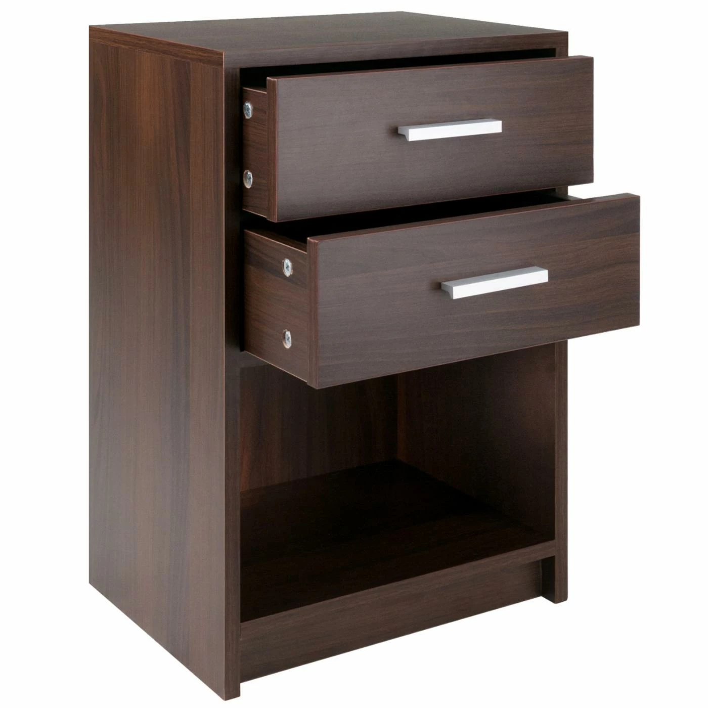 Complete with two drawers for plenty of storage, the Winsome Trading Molina 2 Drawer Accent End Table boasts a rectangular tabletop and open lower shelf for stylish display space. The construction is sturdy engineered wood, and it comes in your choice of available finish. Two rectangular plastic drawer pulls in a sleek silver finish add a contemporary touch to this accent end table.