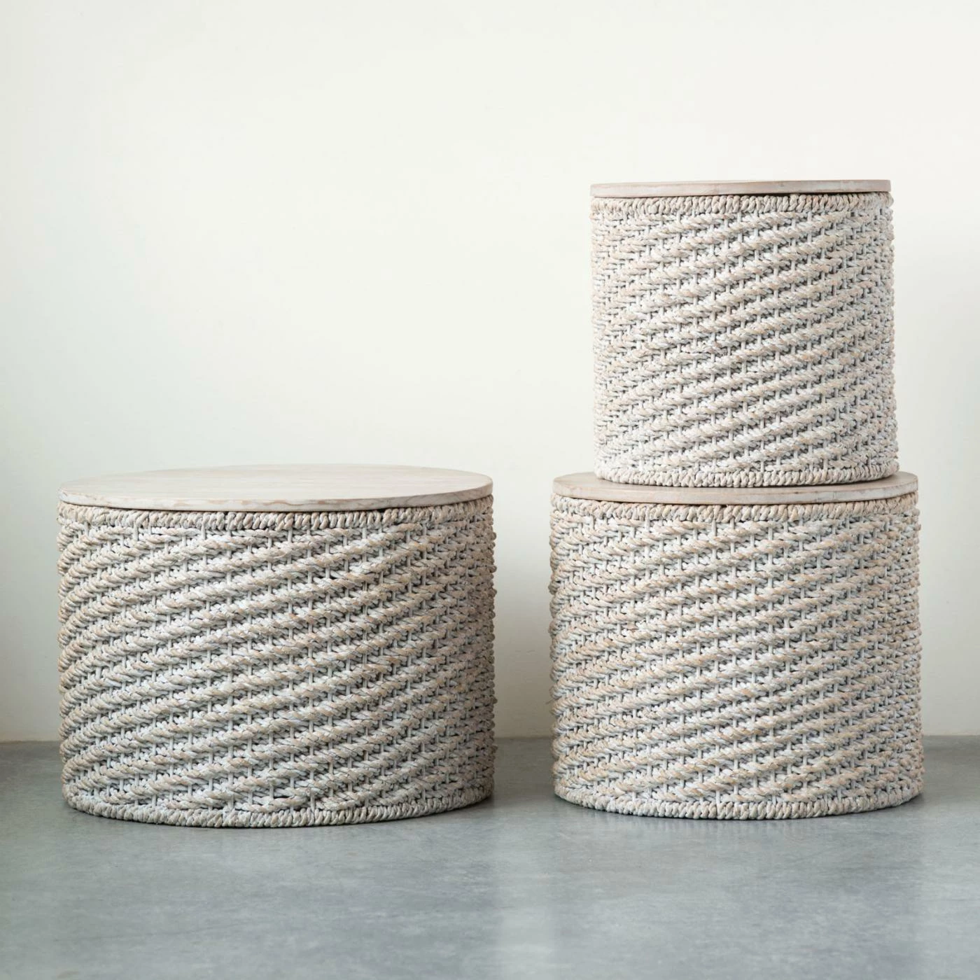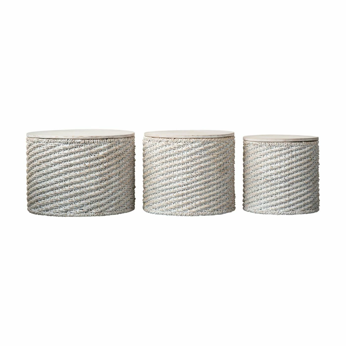 Break up your living room or bedroom dΓ©cor with the 3R Studios Round Woven Water Hyacinth End Table – Set of 3. This set provides three matching drum-shaped end tables that fulfill your need for function and fashion. A small, medium, and large table are included in the set. Each has a round top made from solid mango wood, adept at drinks service and decorative display. The bases are woven tightly from water hyacinth. A whitewash finish tops the frames. Display these separately, grouped together, stacked, or in whatever way suits your sense of style best.