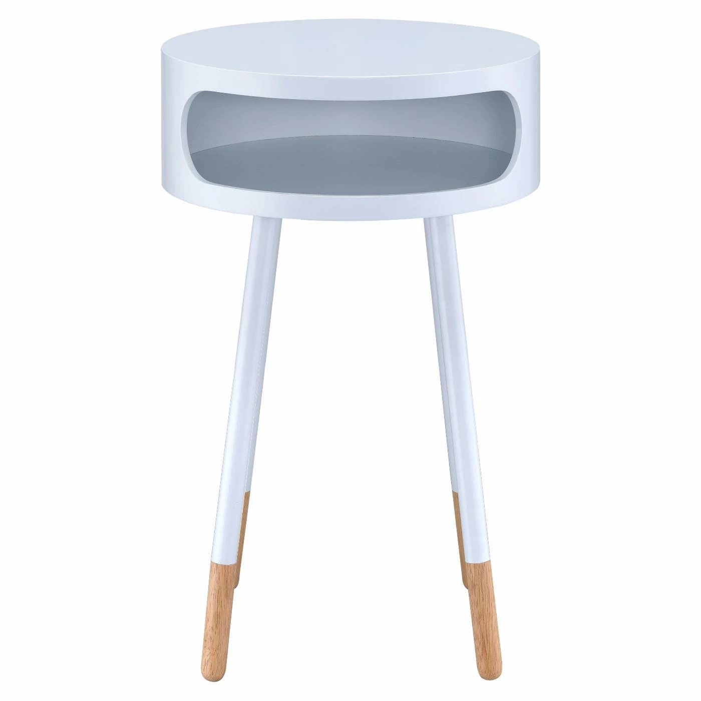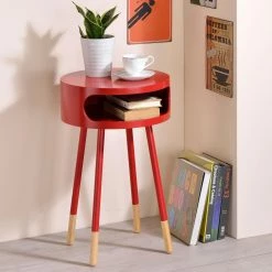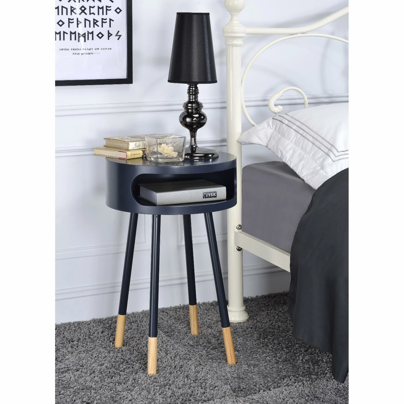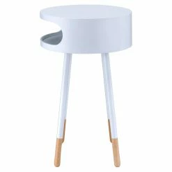 Blast off with the Acme Furniture Sonria End Table, boasting a unique atomic era-inspired silhouette. This modern end table sits on slender, tapering legs with light colored tips and includes a cubby cutout in the center for stashing remotes and magazines. Select your favorite available color to give any room a contemporary pop.