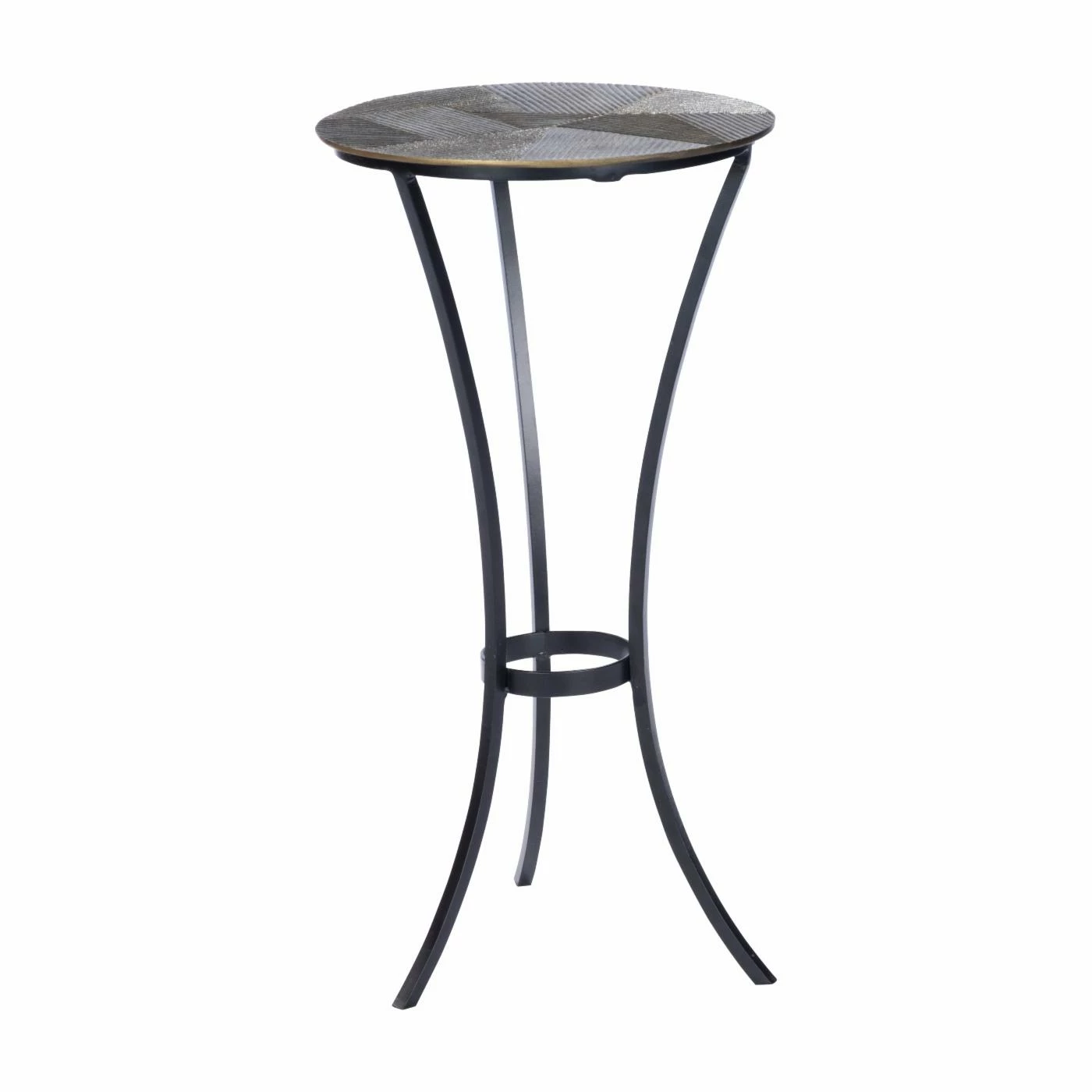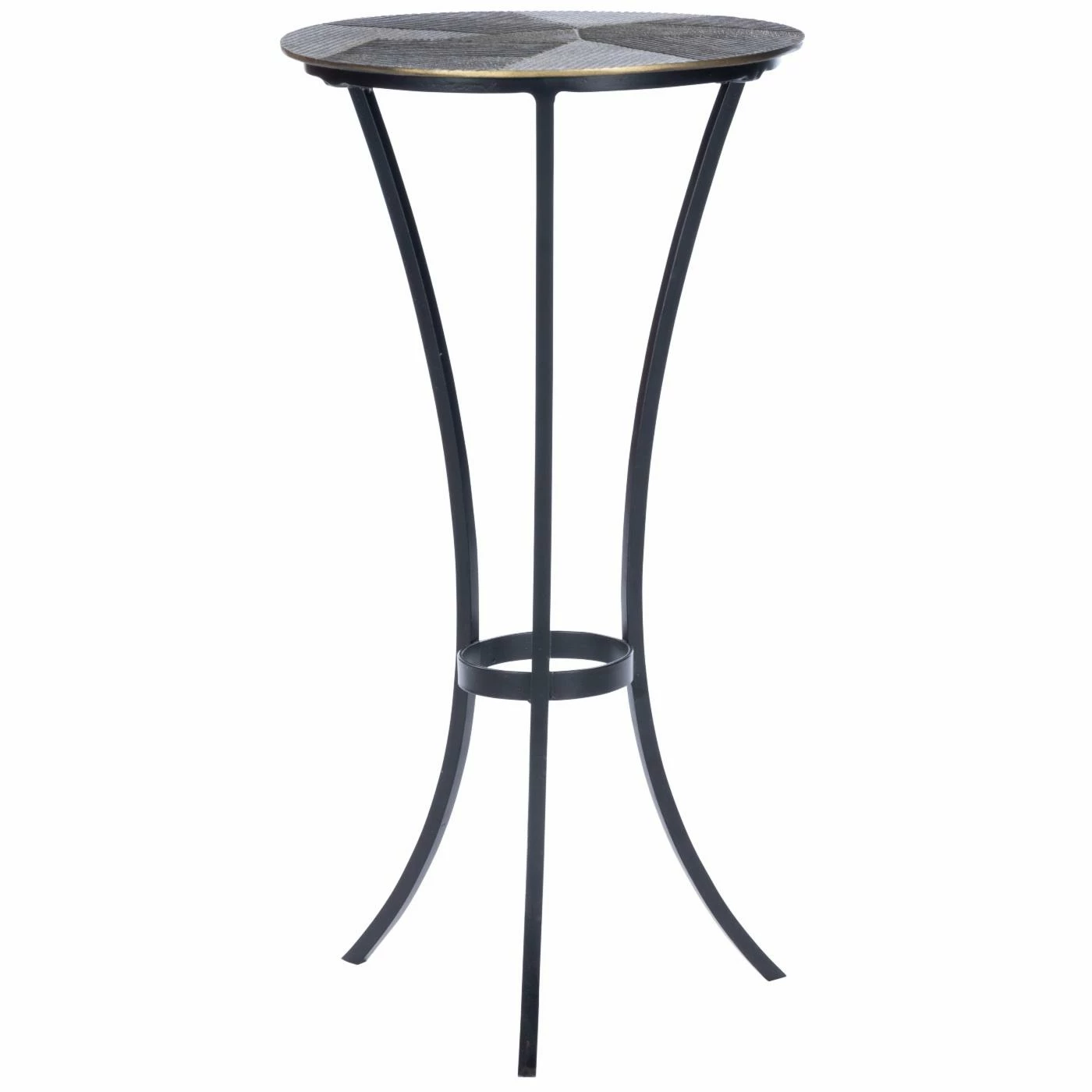 Liven up that corner of your modern or industrial living room with the Butler Specialty Gaston Round Metal End Table. The smooth, curved legs of the pedestal base contrast with the textured pattern of the round table top. The iron legs feature a sleek black finish while the aluminum top has an antique gold finish for a little bit of glam. Use the table as is or add a potted plant or other small accent to the top.