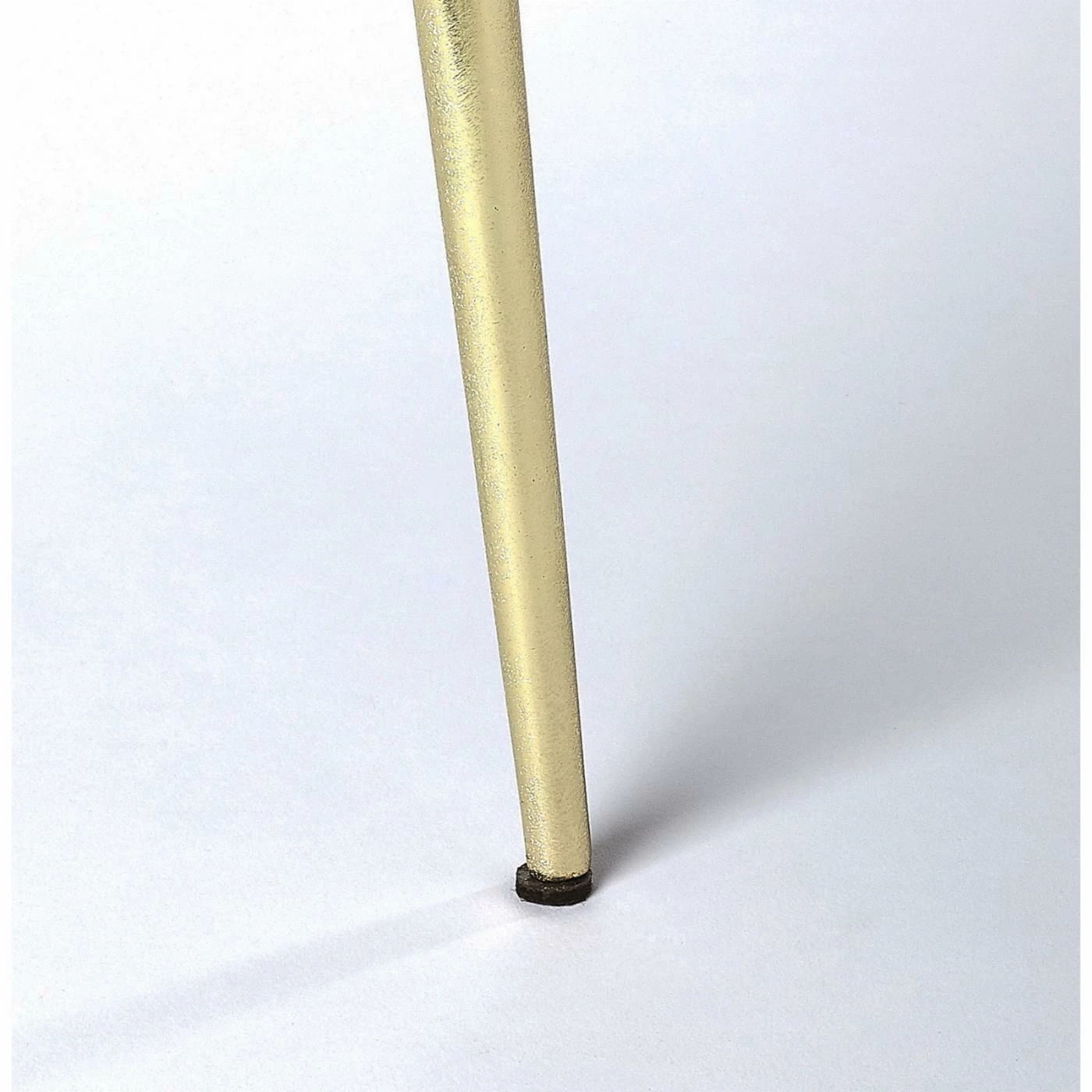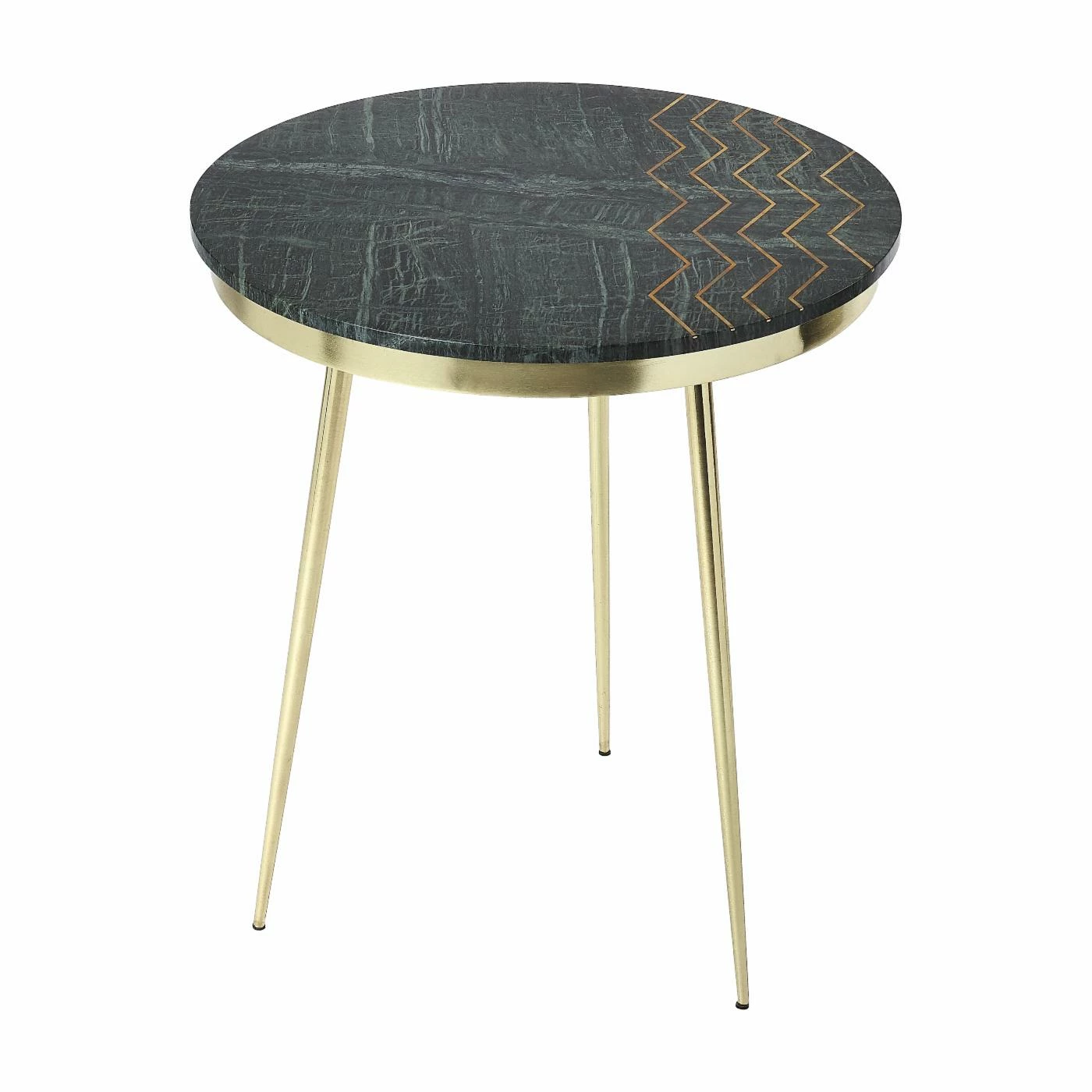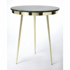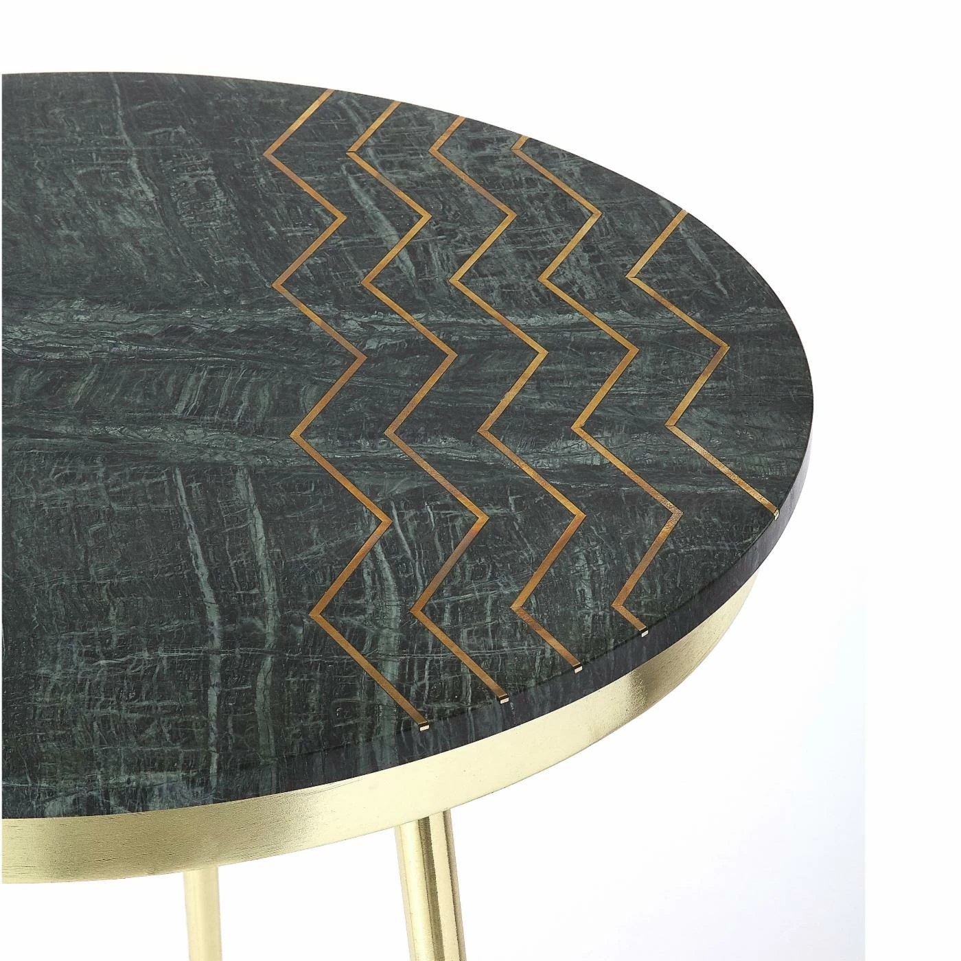 Modern and glam style join together to create the Butler Specialty Hollings Green Marble and Brass Accent Table. The gold finished tripod base leads up to the rich green and black marble top. A zig-zag pattern on one side of this tabletop has a coordinating gold finish. This accent table is constructed from engineered wood, iron, and metal.