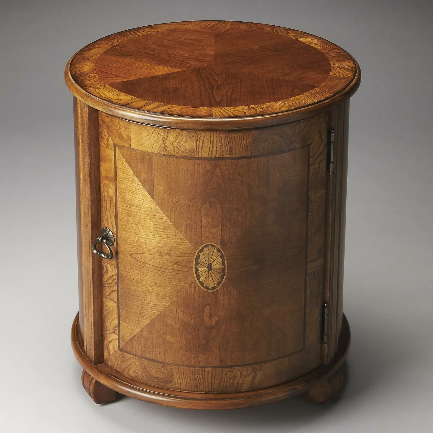 The beauty of this classic Butler Specialty Masterpiece Lawrie Drum Table is in its intricate veneer inlays. This drum table is handcrafted of select hardwood solids and choice veneers in a warm natural finish that allows the wood grain to shine. A single curved door front opens to reveal an adjustable shelf and plenty of storage inside. Designer details include a antiqued brass-finished ring pull, linen-fold veneer medallion, and elegant veneer top.