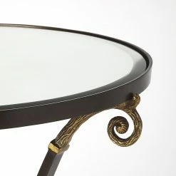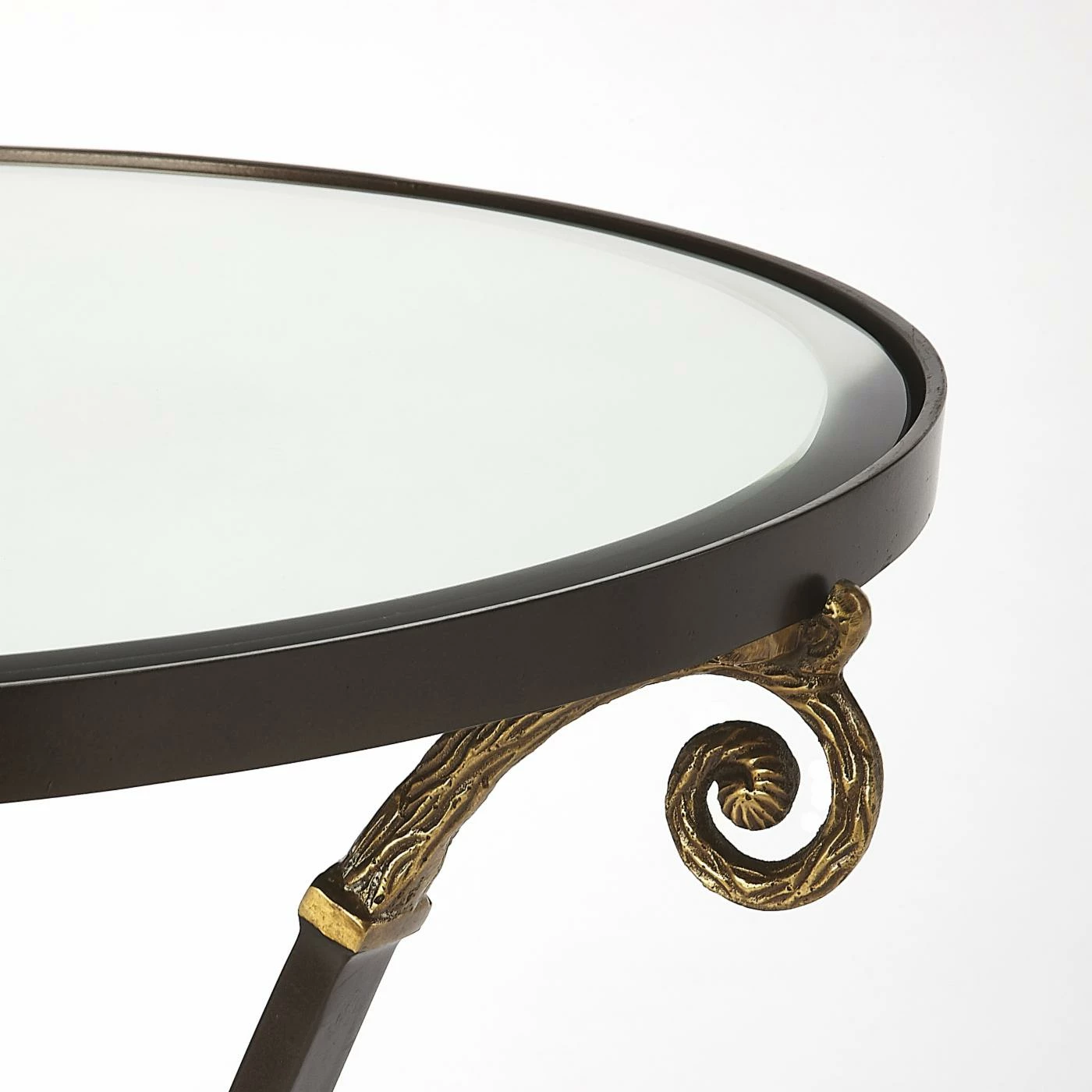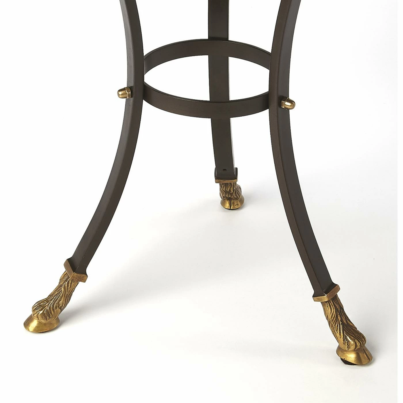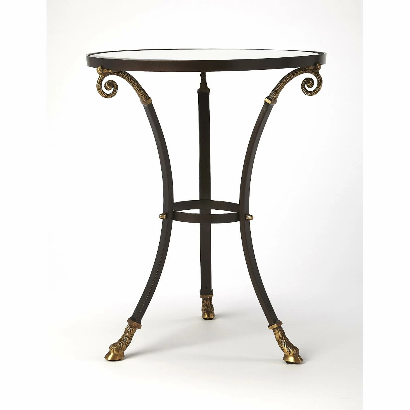 The Butler Specialty Meurice Glass and Metal Accent Table is a table with old-world charm. The swirled and hoof-like accents lend a sense of refinement to the piece, and the rich, distressed finish will make it a natural fit with your existing decorative scheme. Pair this table with other Butler Specialty items to create a fabulous aesthetic for your living room.