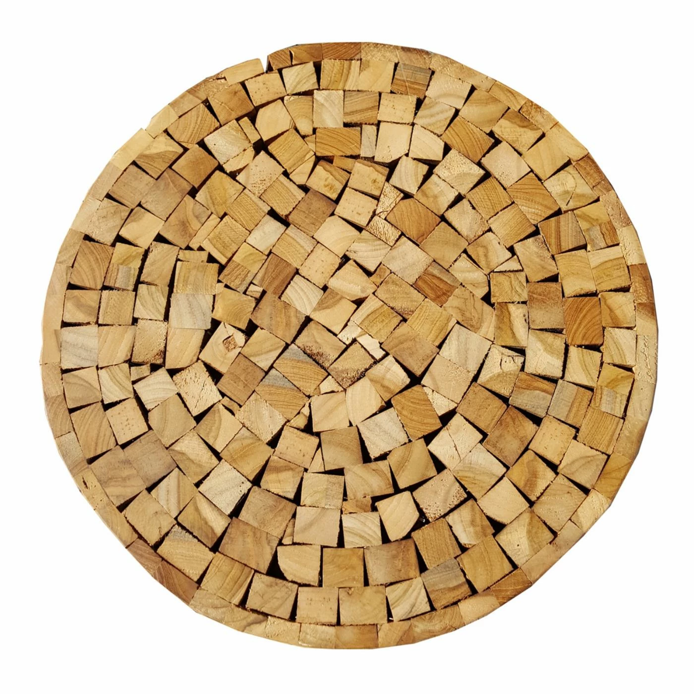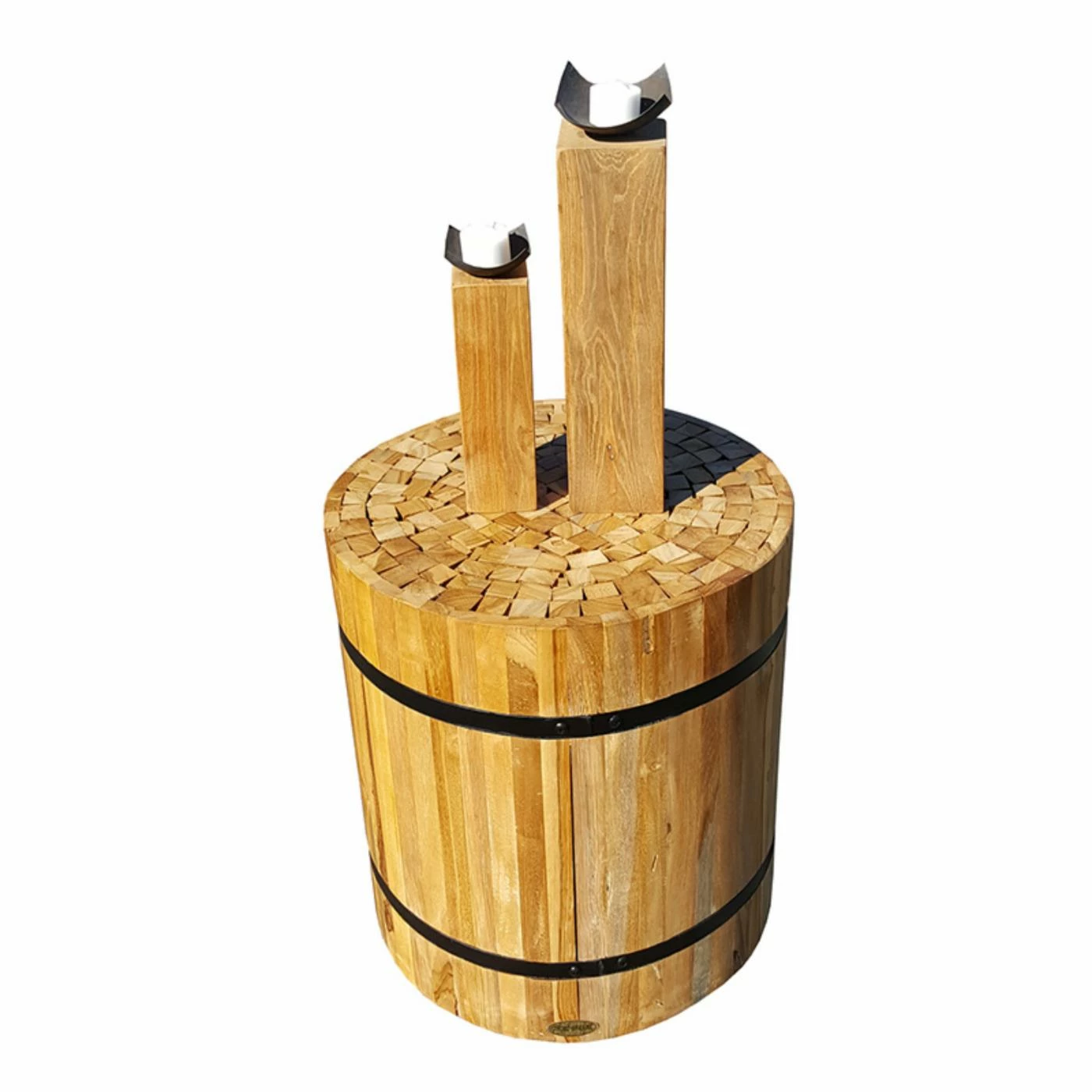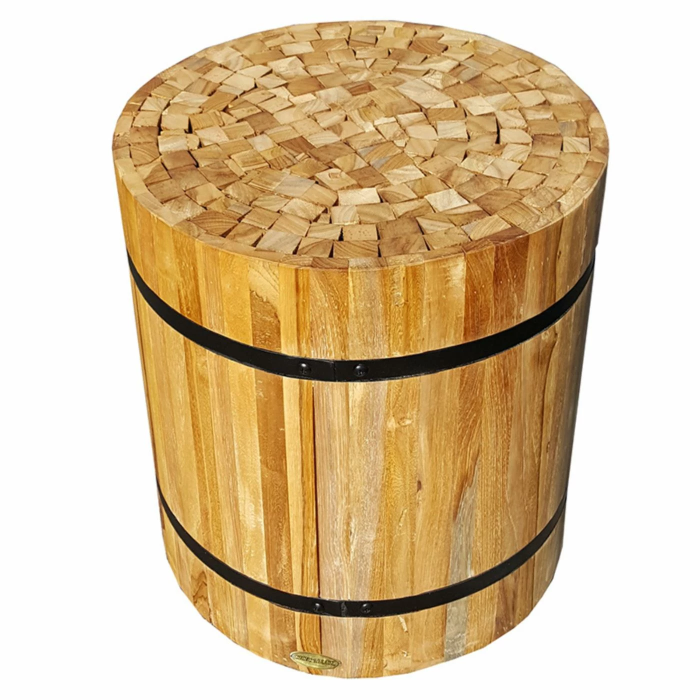 Reminiscent of the iron-banded wooden casks that make up part of wine countryโs charm, the Chic Teak Teak Nutella Stool is sized to work as an accent table or an extra seat. This bundle of honey-colored teak staves is secured with black-finished metal bands. The top allows a view of intriguing end grain patterns.